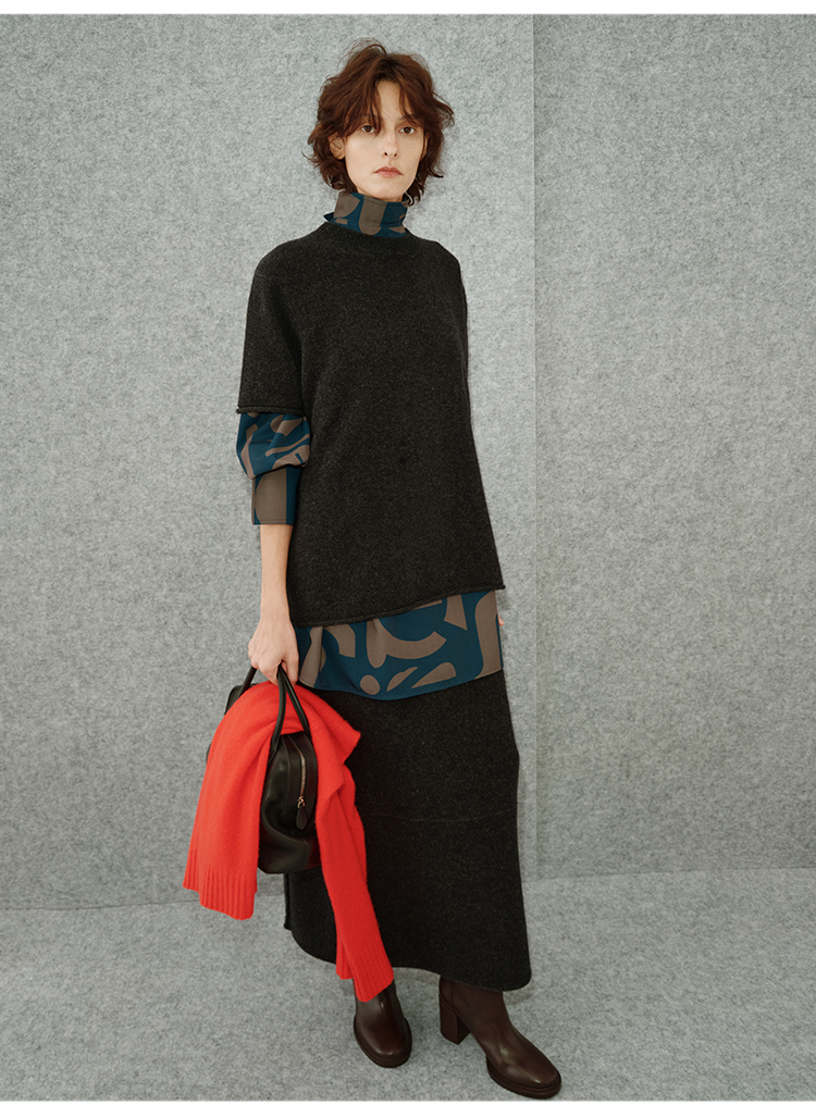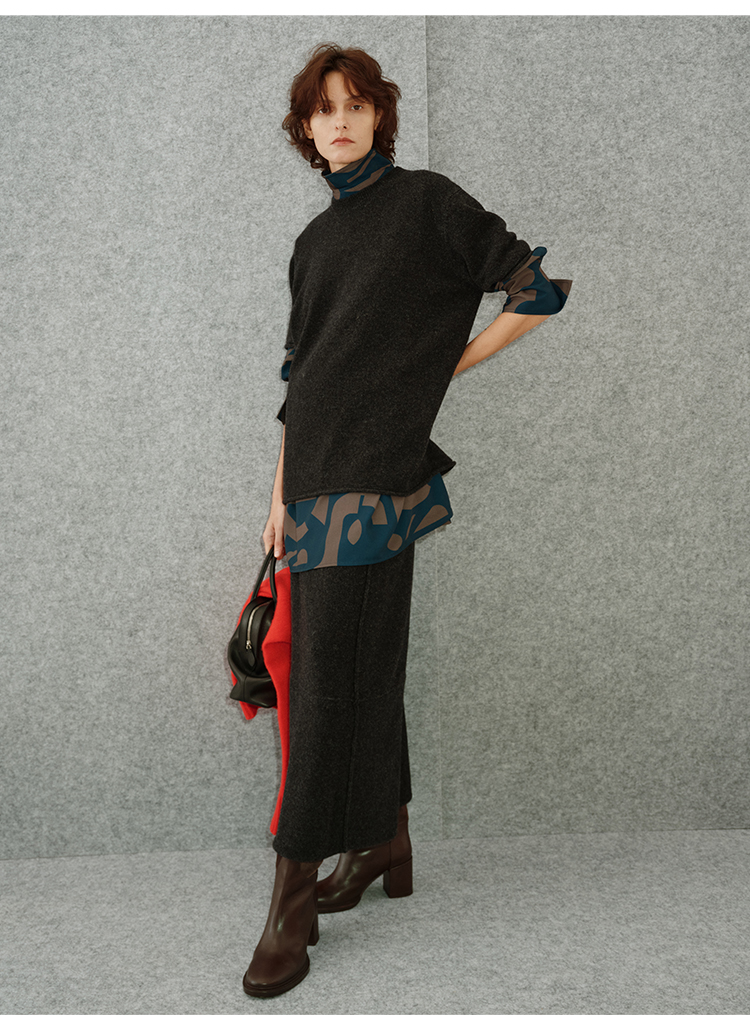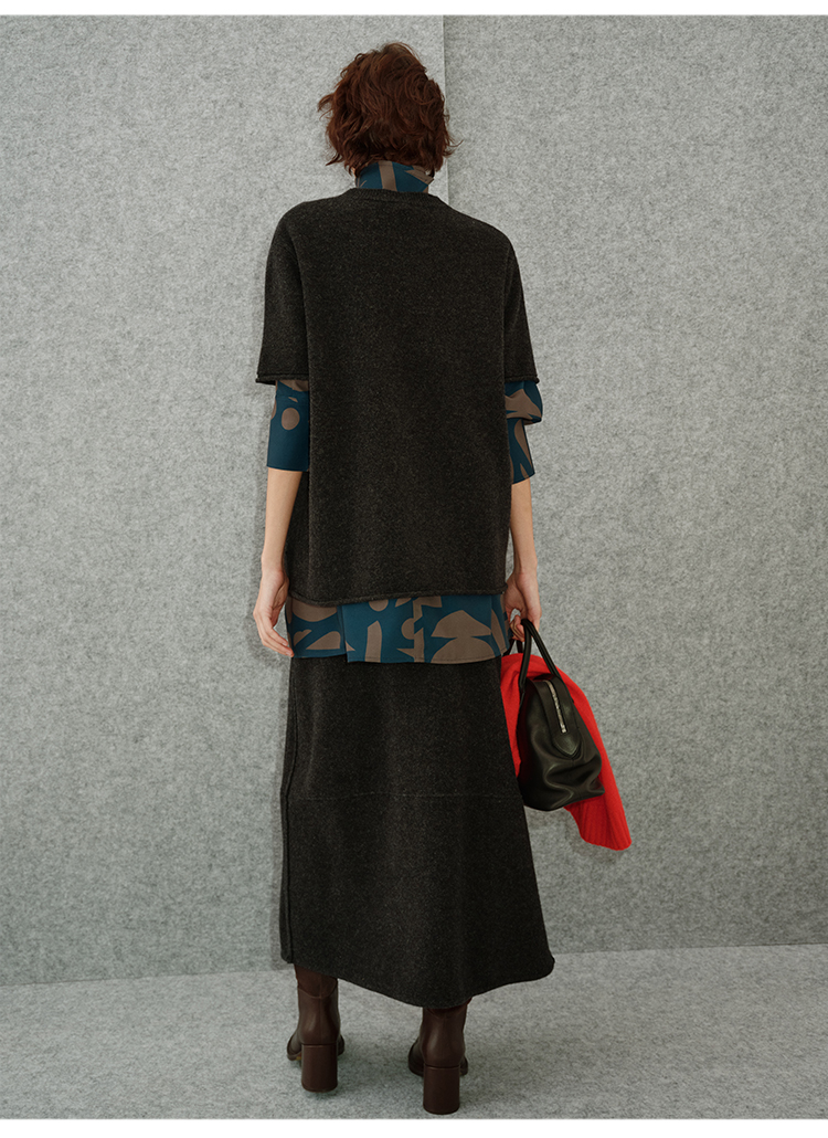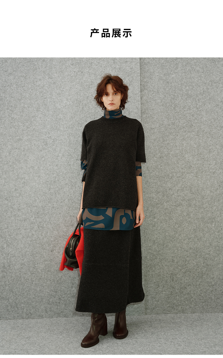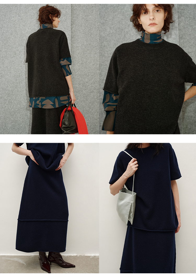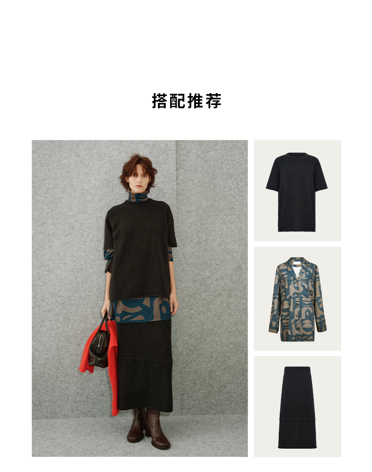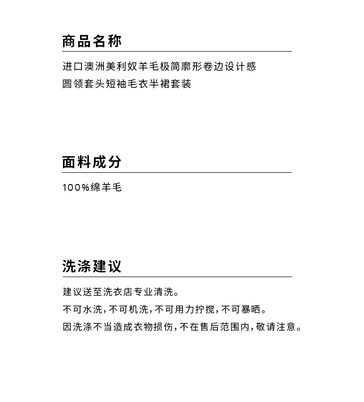 HIDEMI 进口澳洲美利奴羊毛极简廓形卷边设计感圆领套头短袖毛衣半裙套装