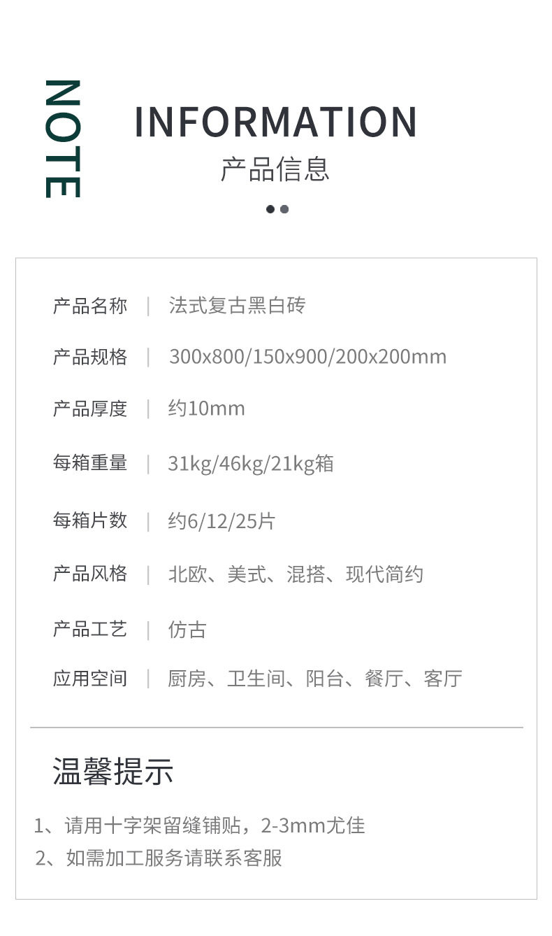 燕子小地砖卫生间瓷砖洗手间墙砖花砖法式猴子300*800复古黑白 商品图3