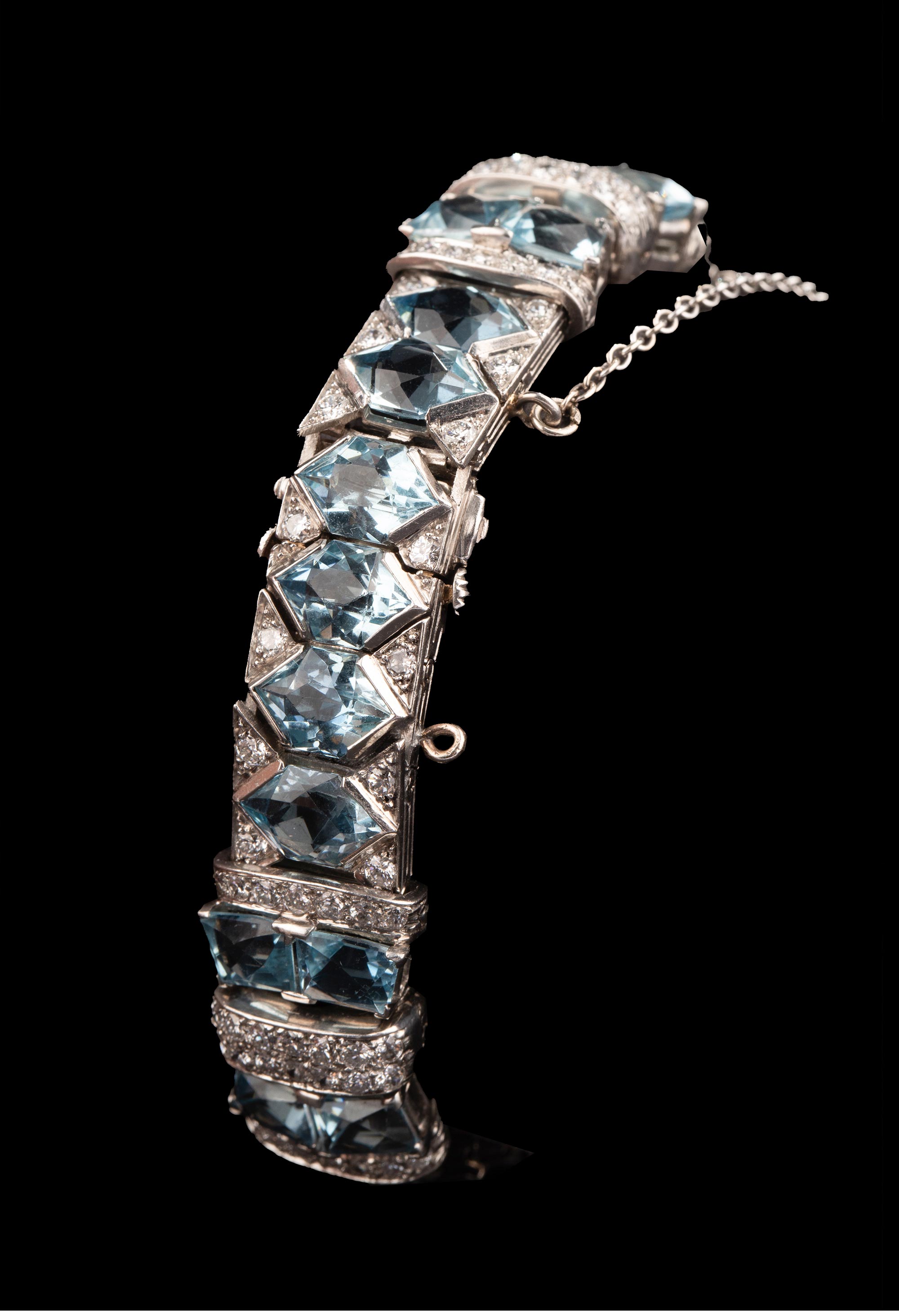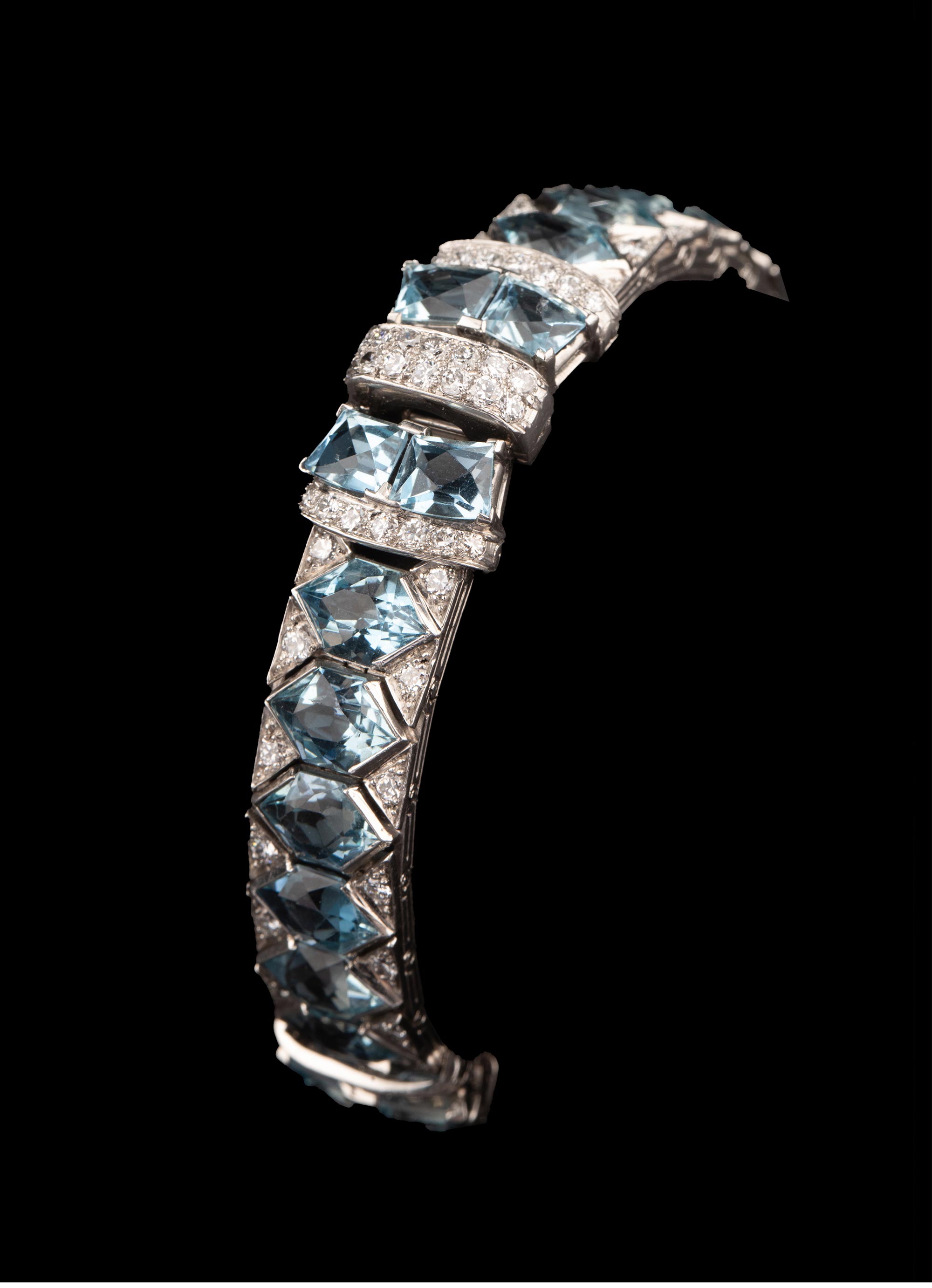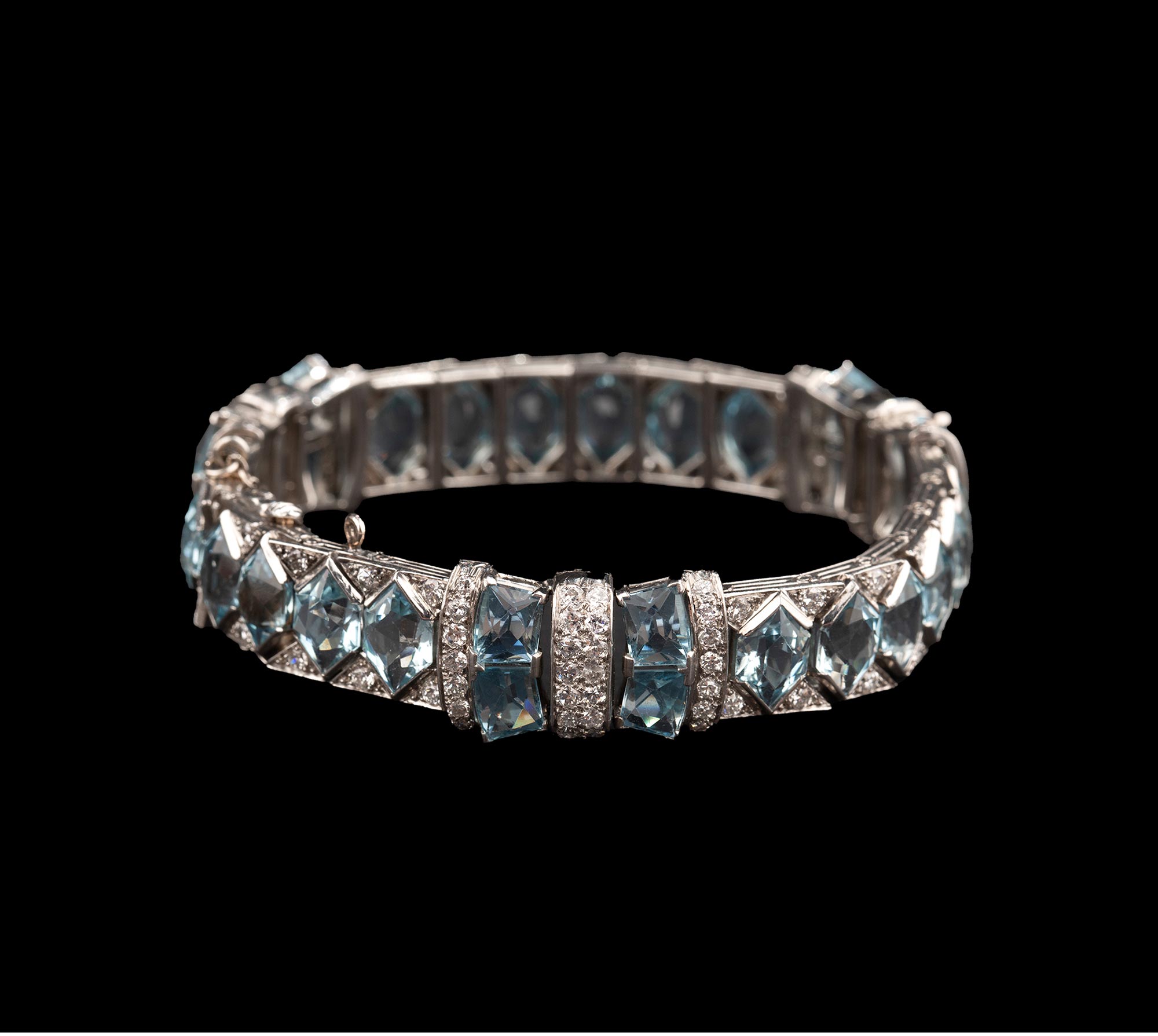 1929年代美国著名珠宝品牌Oscar Heyman出品装饰艺术风格铂金镶嵌海蓝宝石及钻石手镯