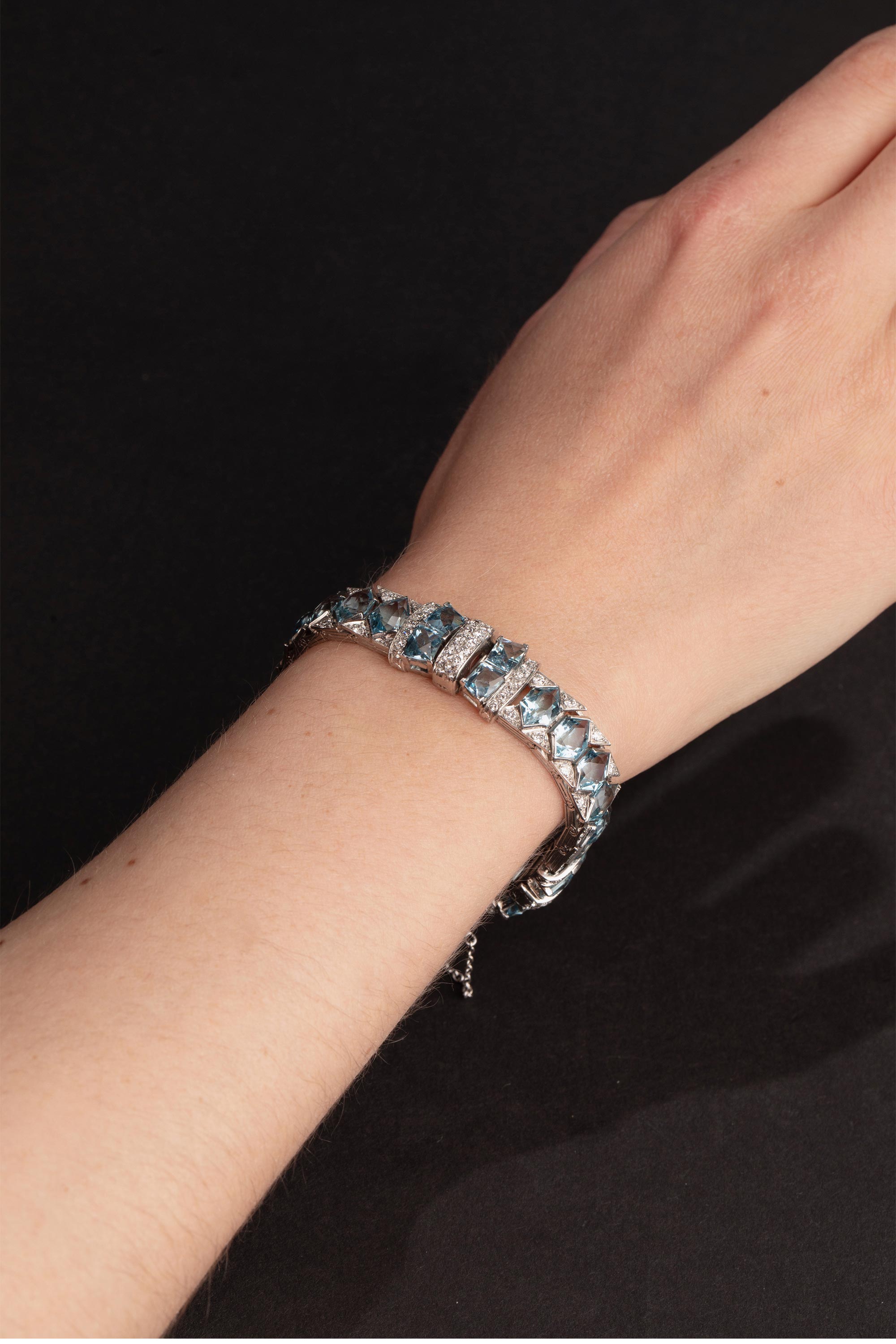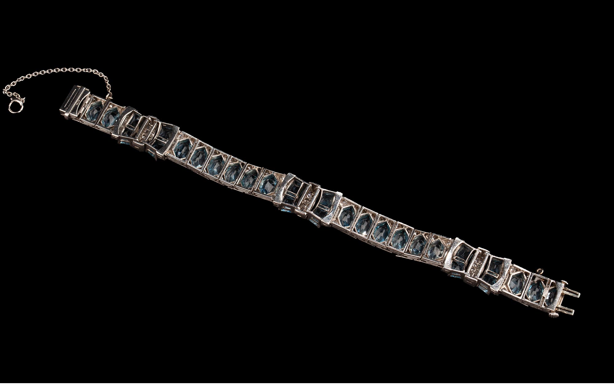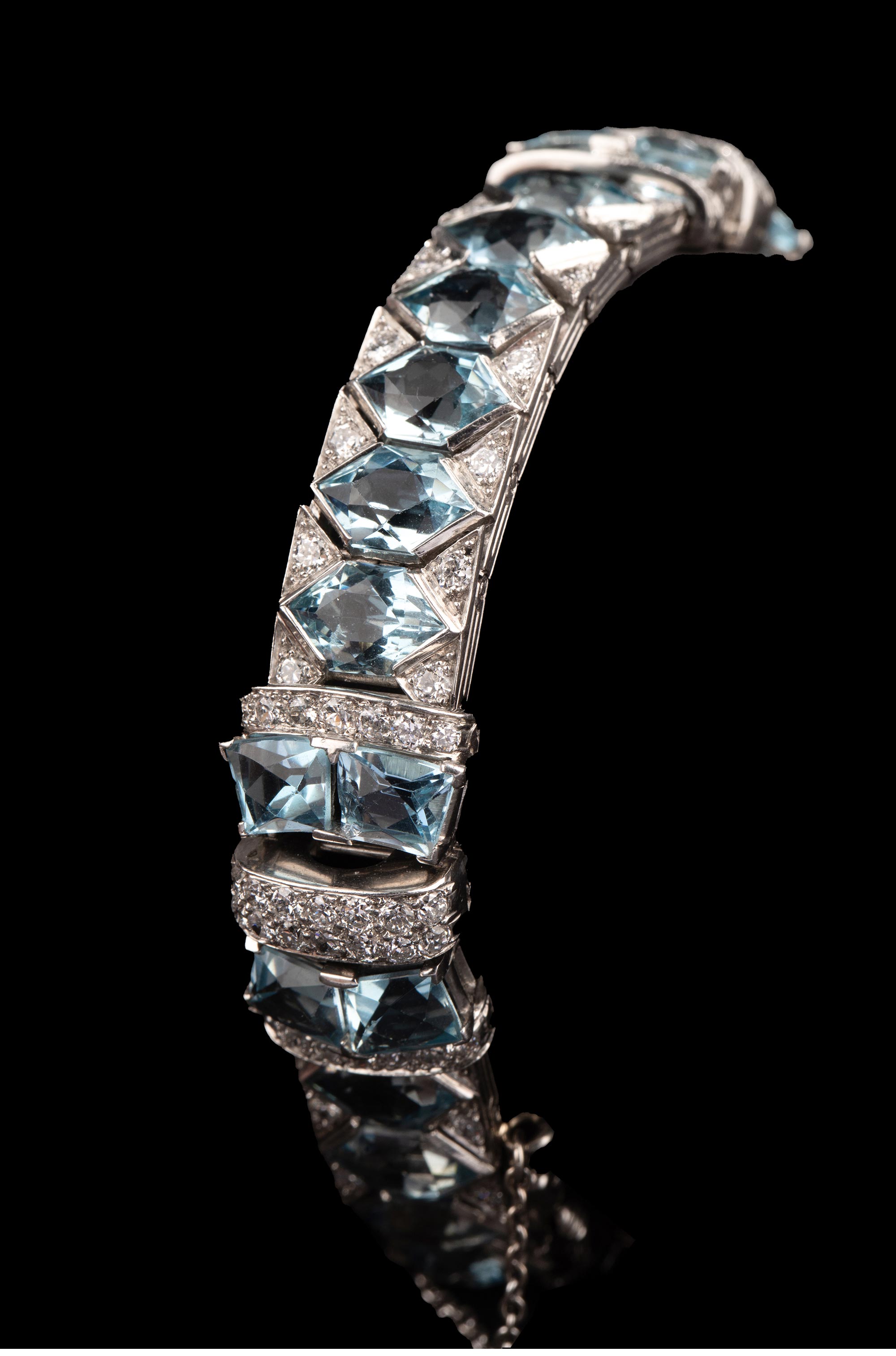 1929年代美国著名珠宝品牌Oscar Heyman出品装饰艺术风格铂金镶嵌海蓝宝石及钻石手镯