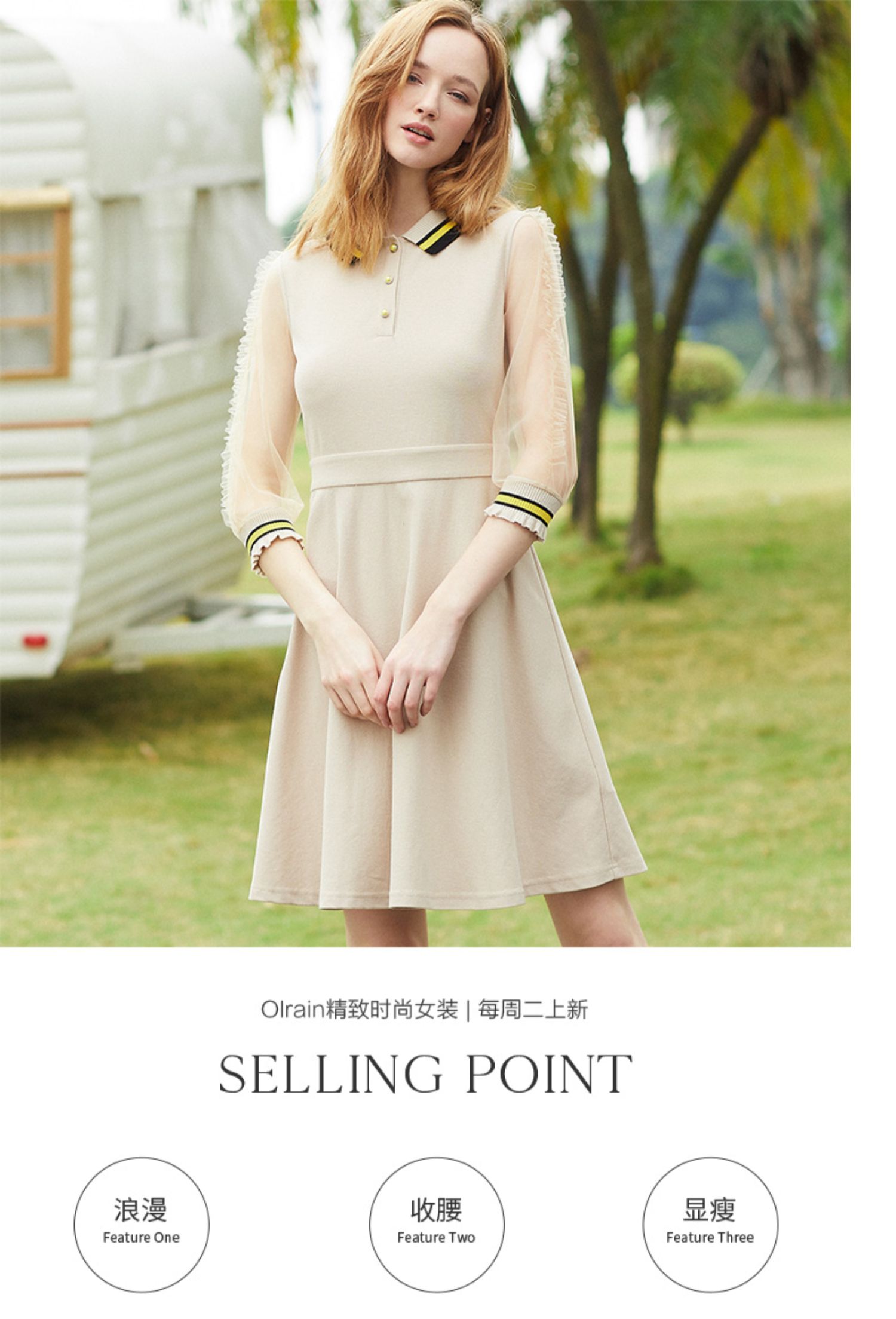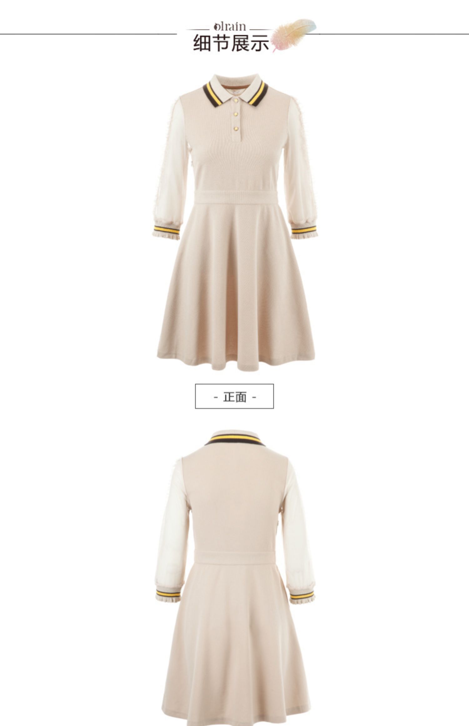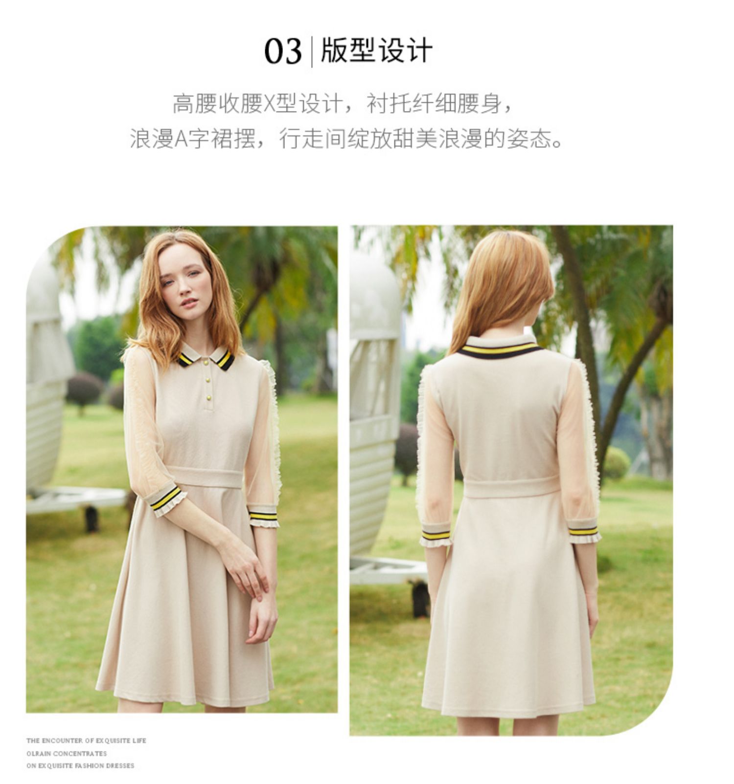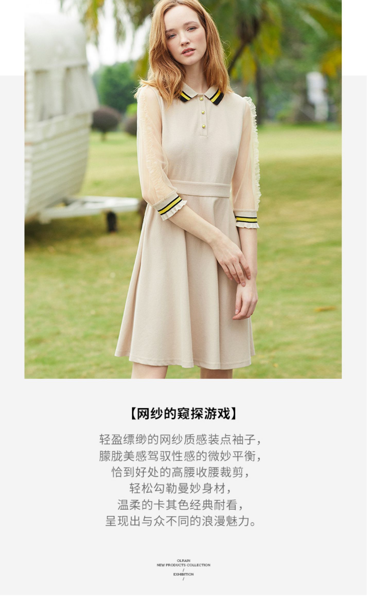 欧芮儿2019秋装新款七分袖连衣裙女 透视网纱拼接显瘦中长款A字裙