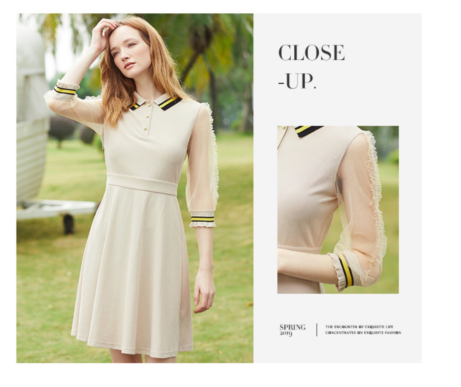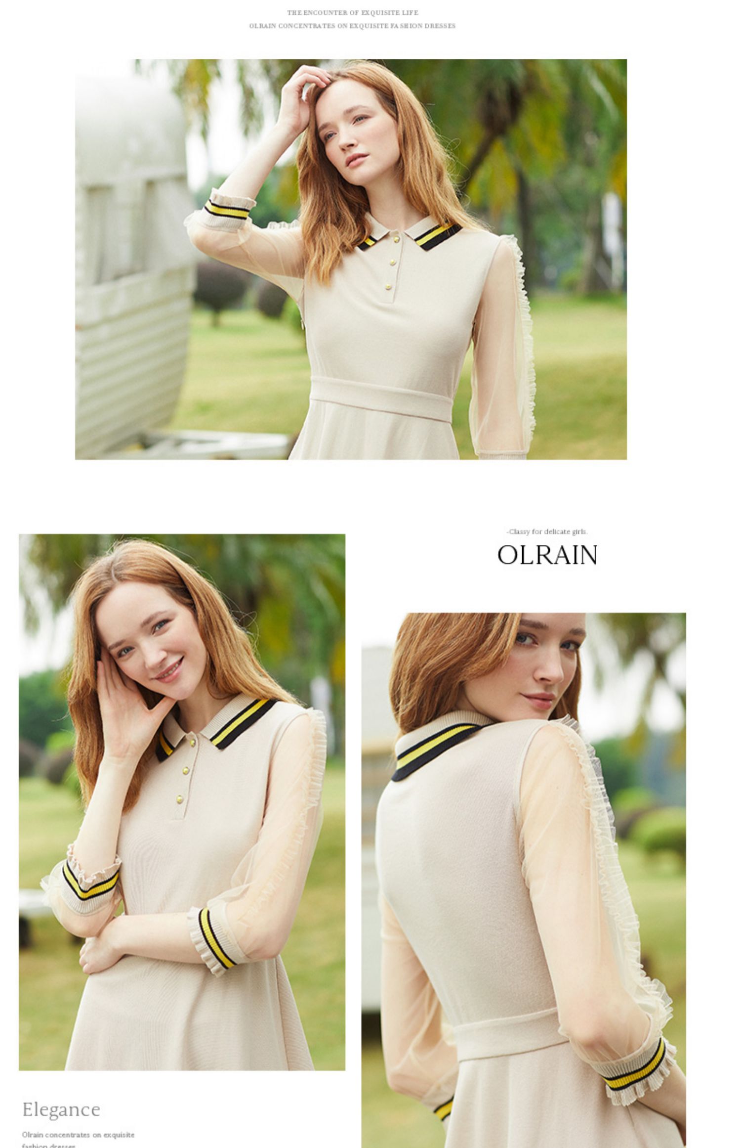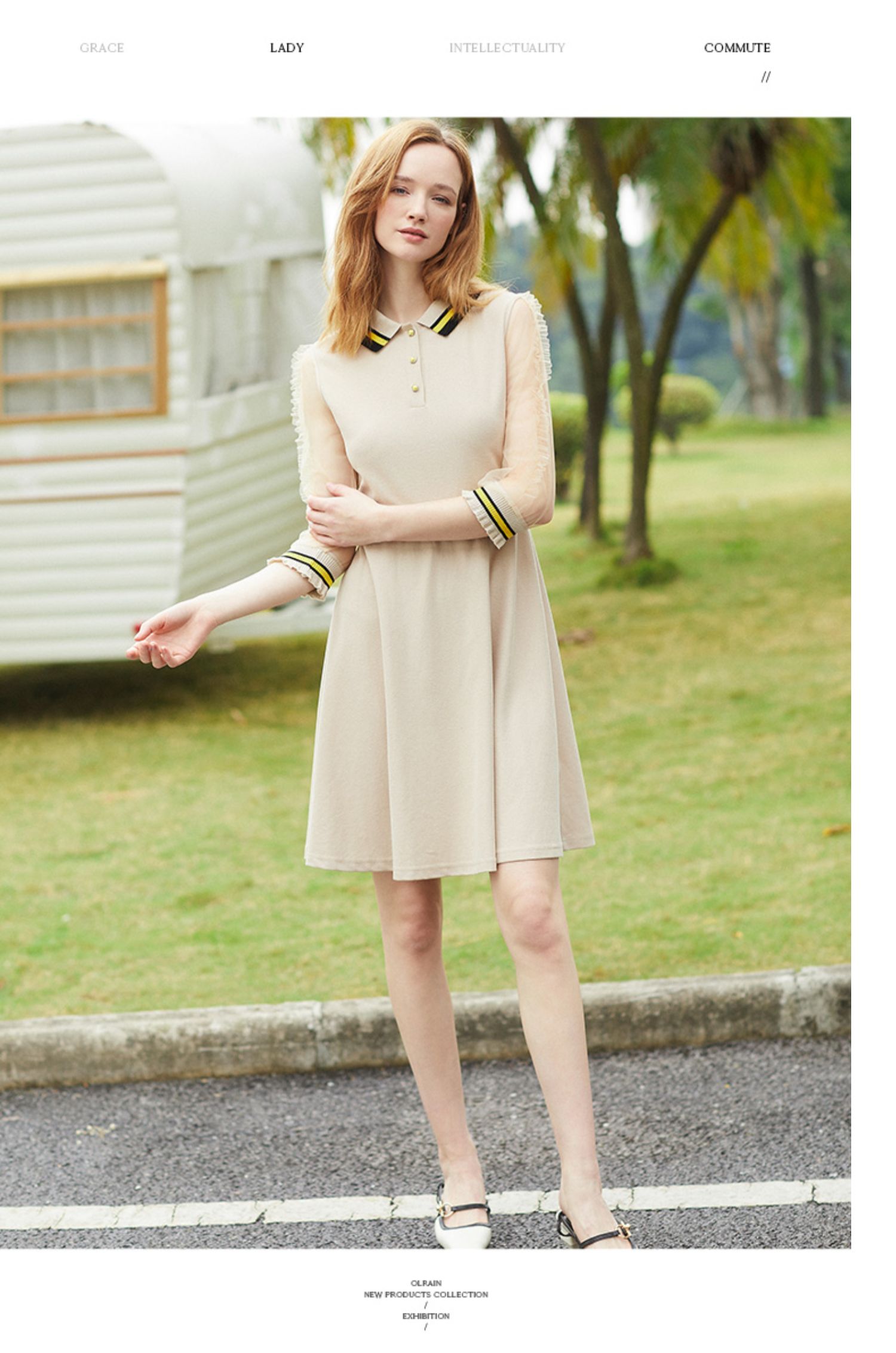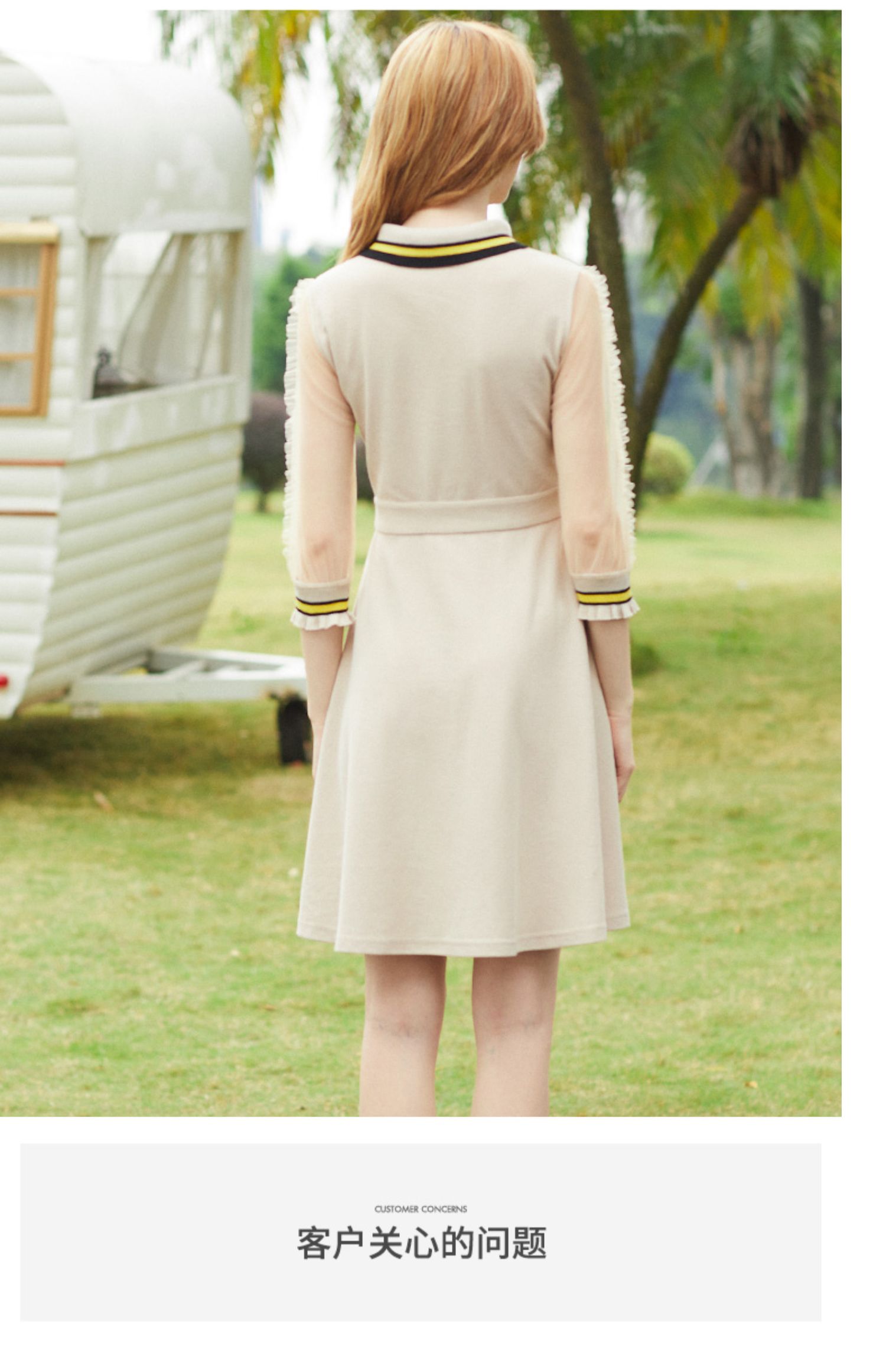 欧芮儿2019秋装新款七分袖连衣裙女 透视网纱拼接显瘦中长款A字裙
