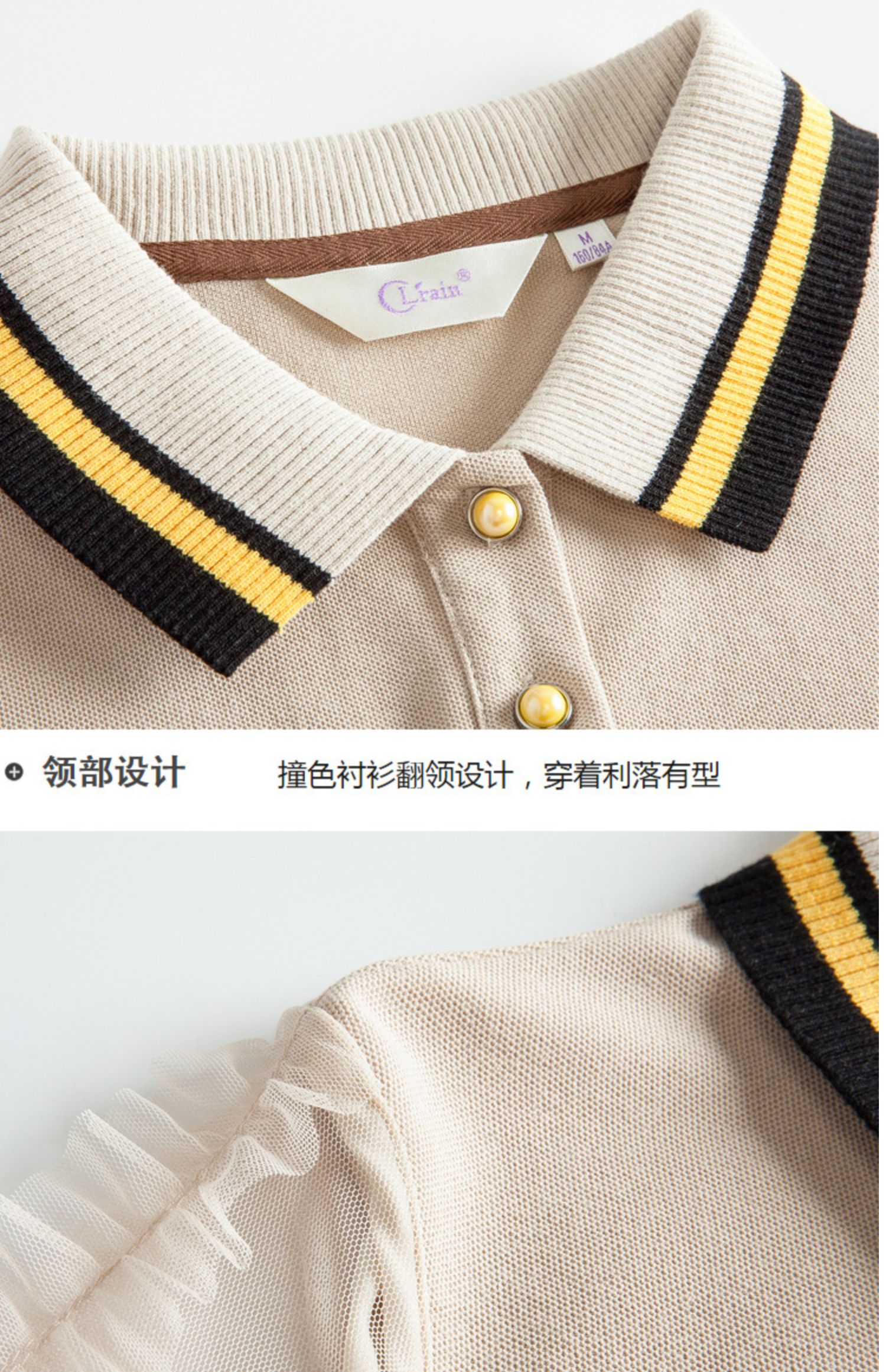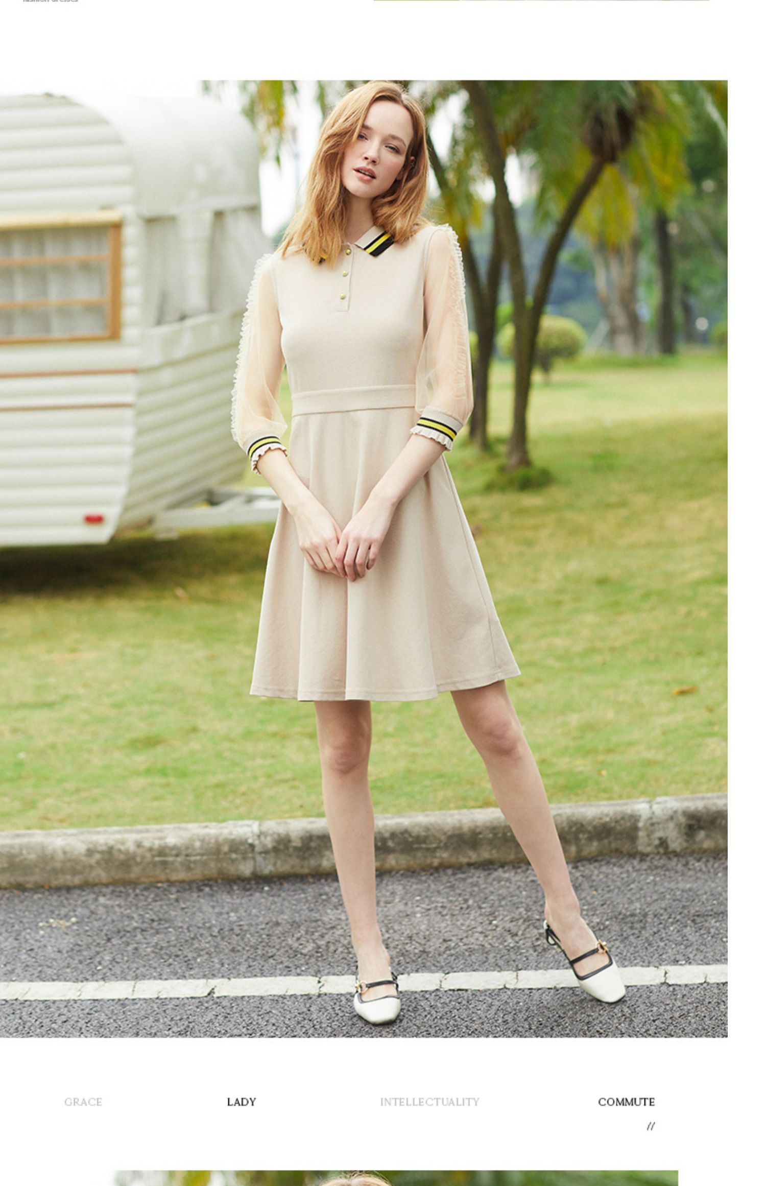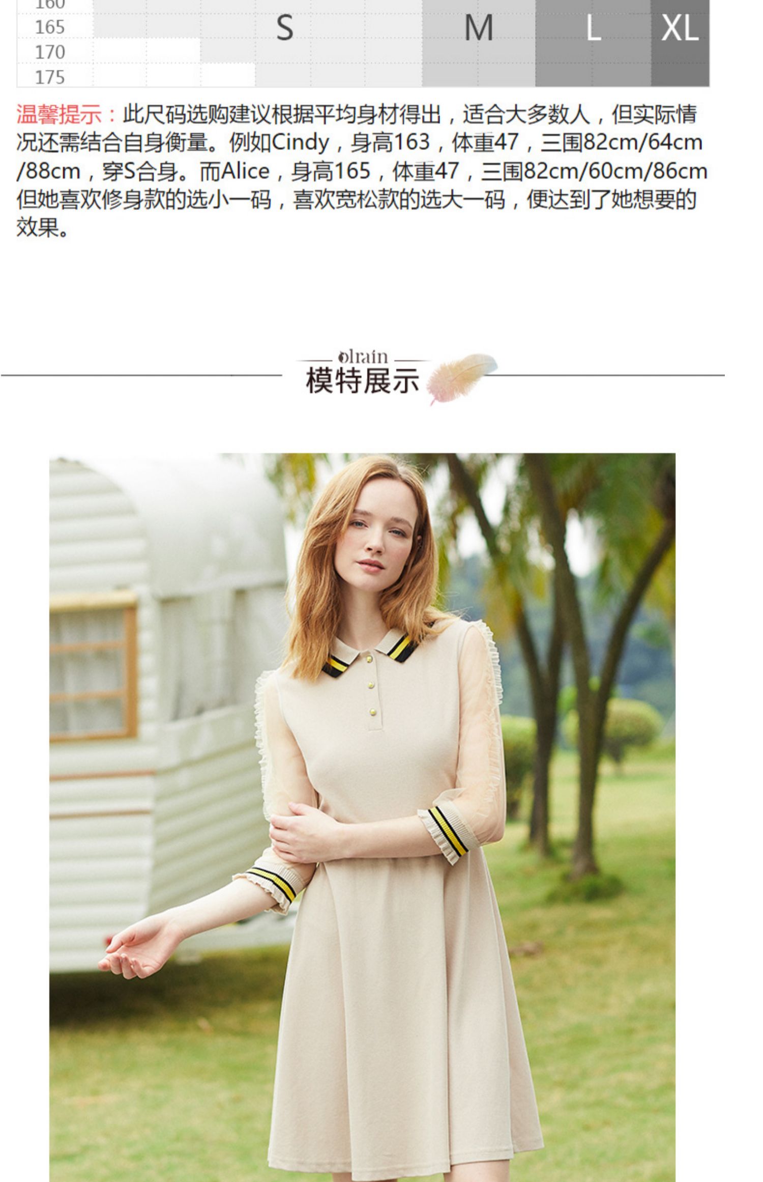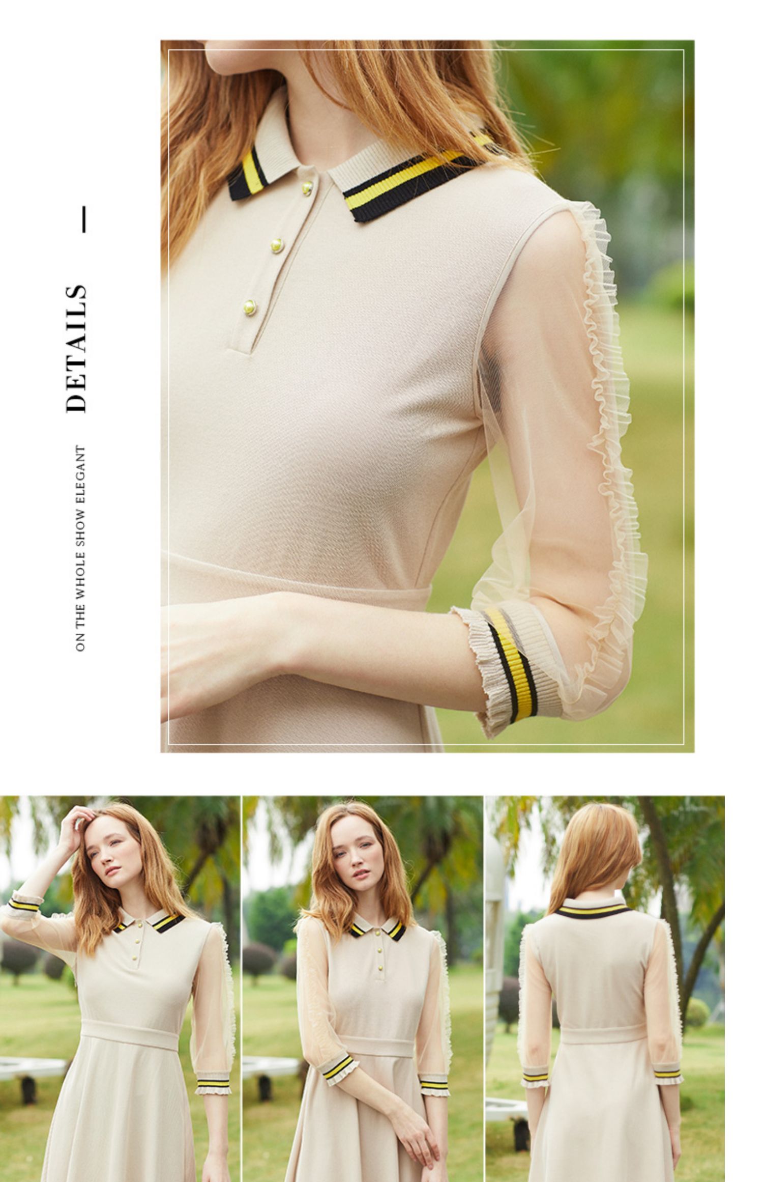 欧芮儿2019秋装新款七分袖连衣裙女 透视网纱拼接显瘦中长款A字裙