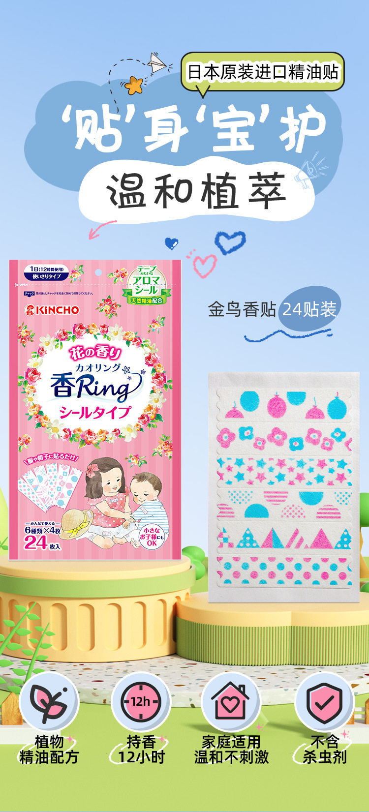 kincho日本金鸟家用户外植物精油香贴卡通随身贴成人手链精油手环