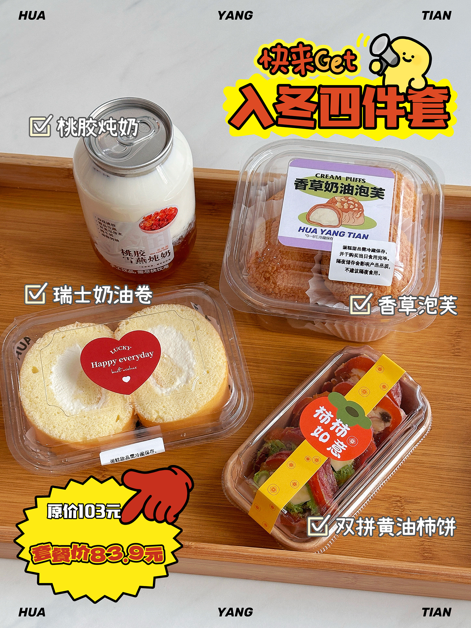 套餐三(桃胶炖奶、香草泡芙、瑞士奶油卷、双拼黄油柿饼)