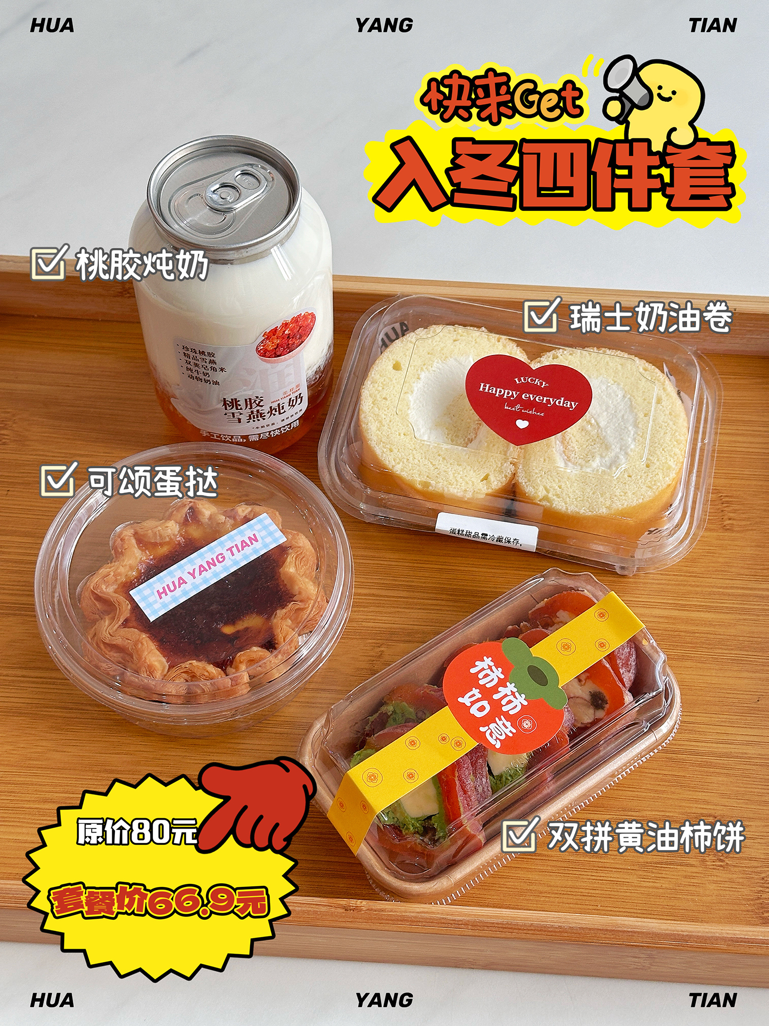 套餐四(桃胶炖奶、瑞士奶油卷、可颂蛋挞、双拼黄油柿饼)