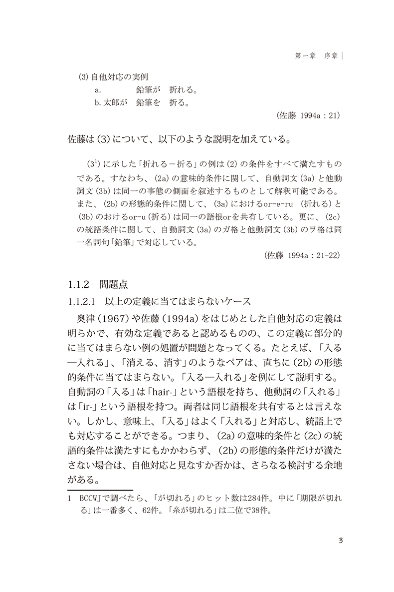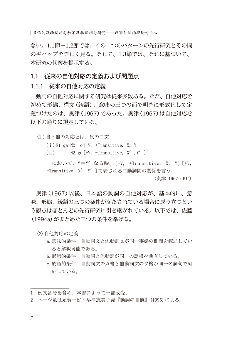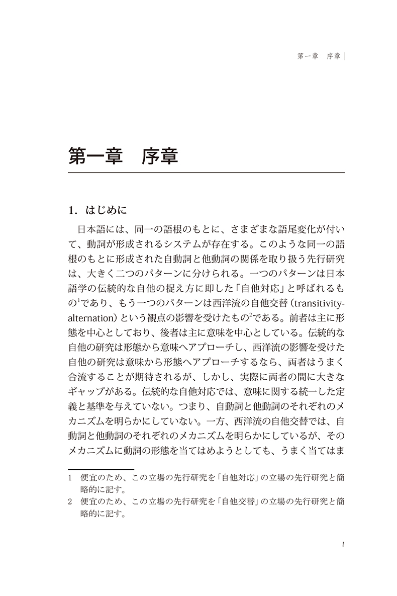 关于日语里的自动词和他动词的先行研究不计其数。整体上可以分为两种类型。一种是基于传统日本语学的研究,以形态为中心,虽然兼顾意义,但对语义的涉入不深。而以影山(1996)为代表的现代语义学研究,虽然以语义为中心,兼顾形态,但其语义与形态之间的巨大龃龉总是遭到后续研究的诟病。所以从现状来看,仍然有非常多的问题等待解决。而本书的目的,是想要先追踪出这种龃龉为什么会产生。