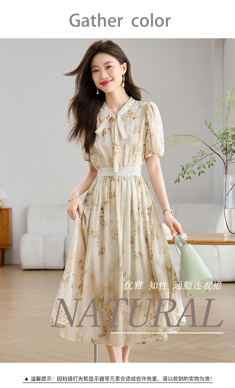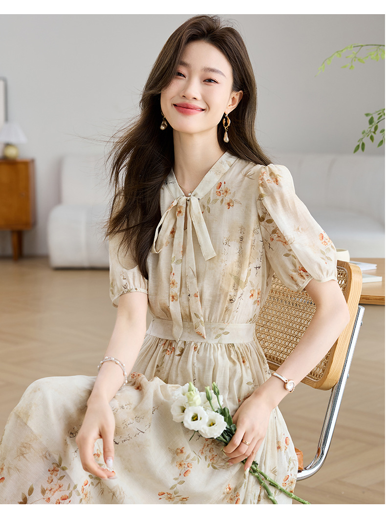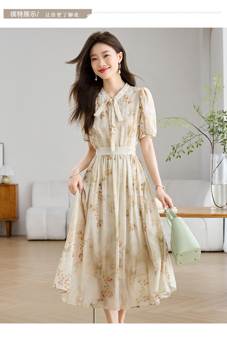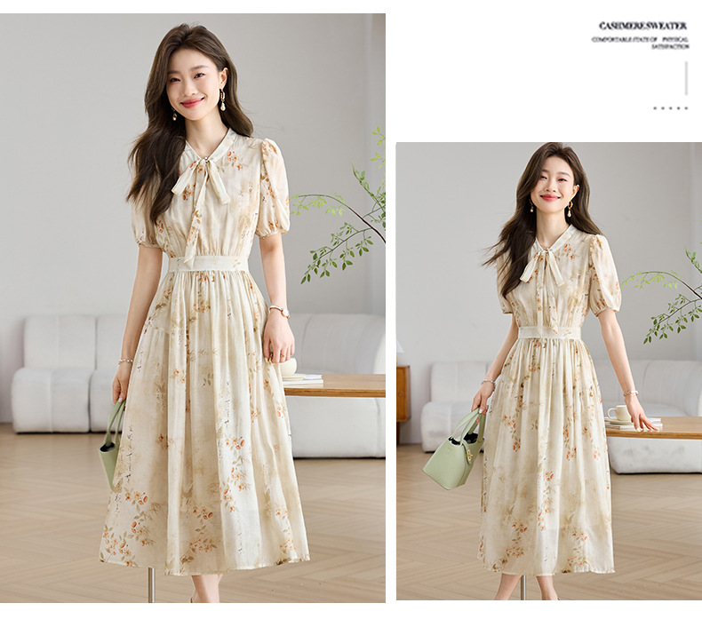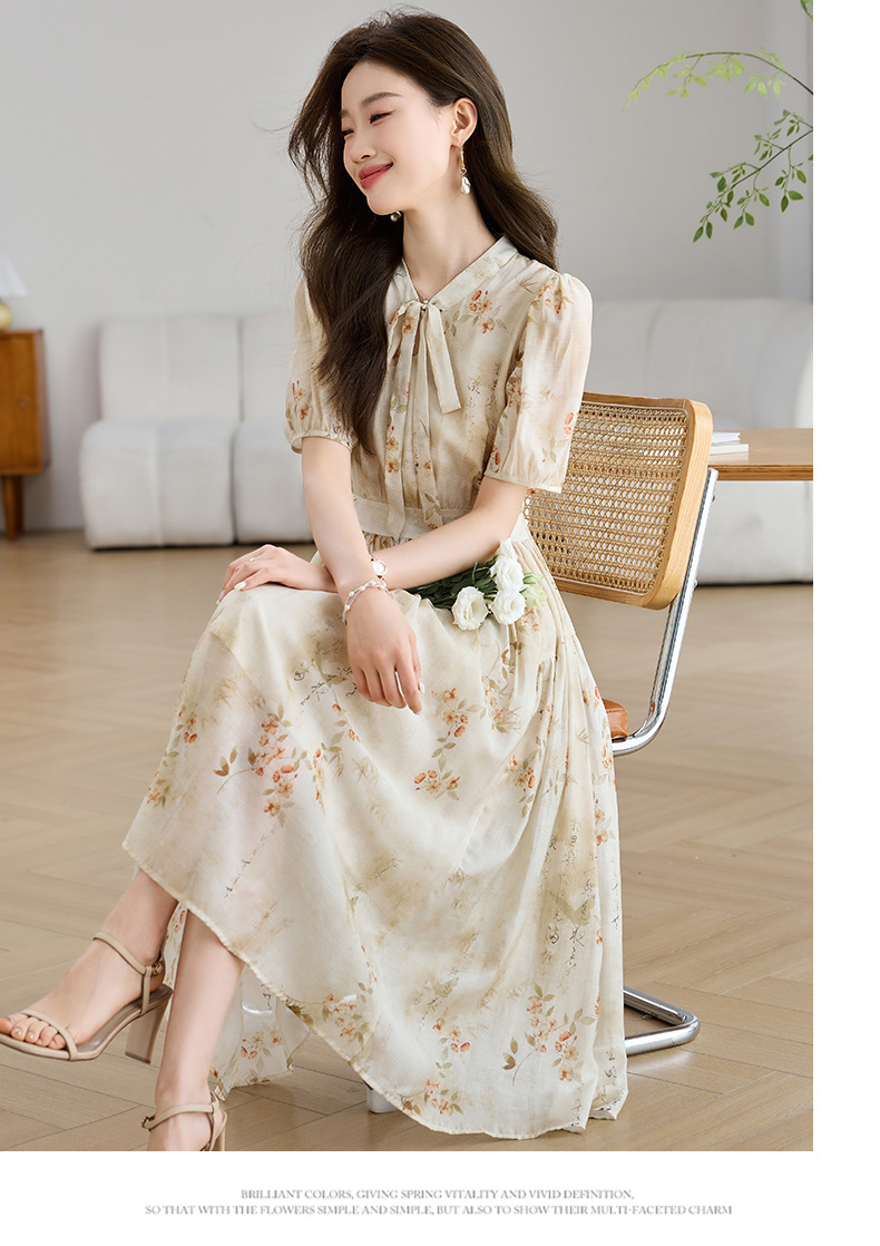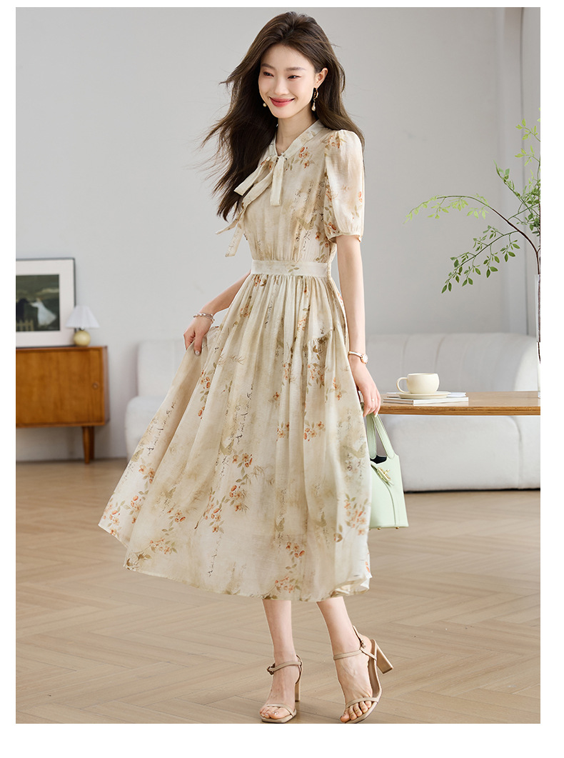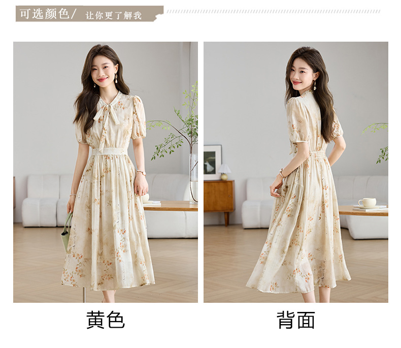 法式印花雪纺连衣裙,轻熟风碎花收腰气质长裙CC-J-662