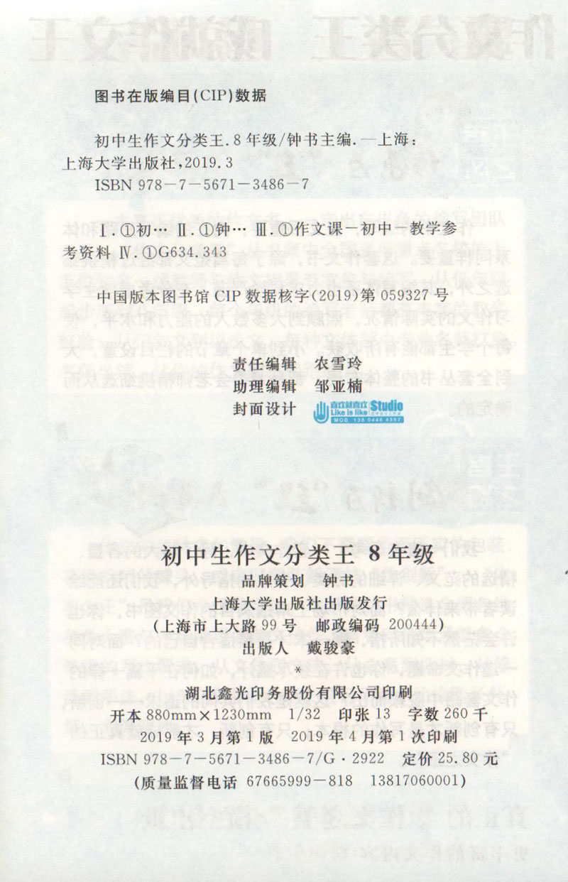 钟书作文榜样 初中生作文分类王 8年级/八年级 根据部编版教材写作要求编写 初中同步作文写作技巧训练 上海大学出版社