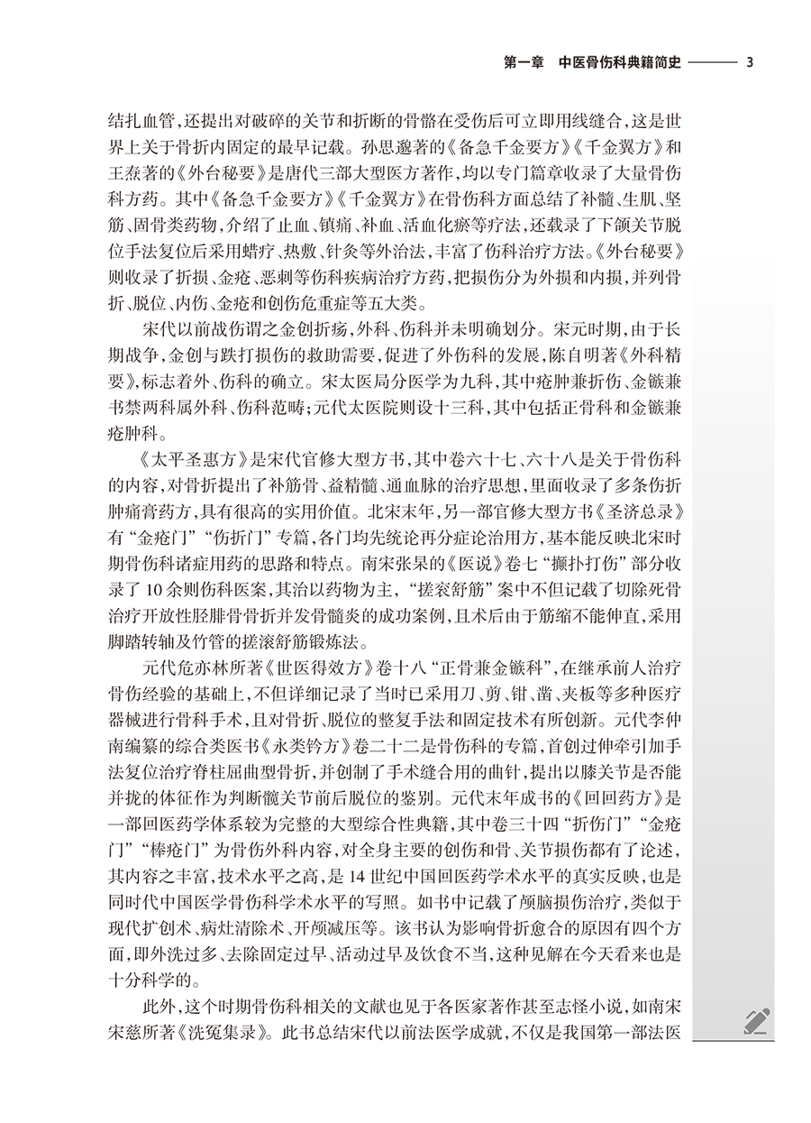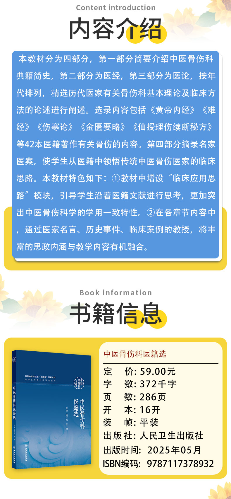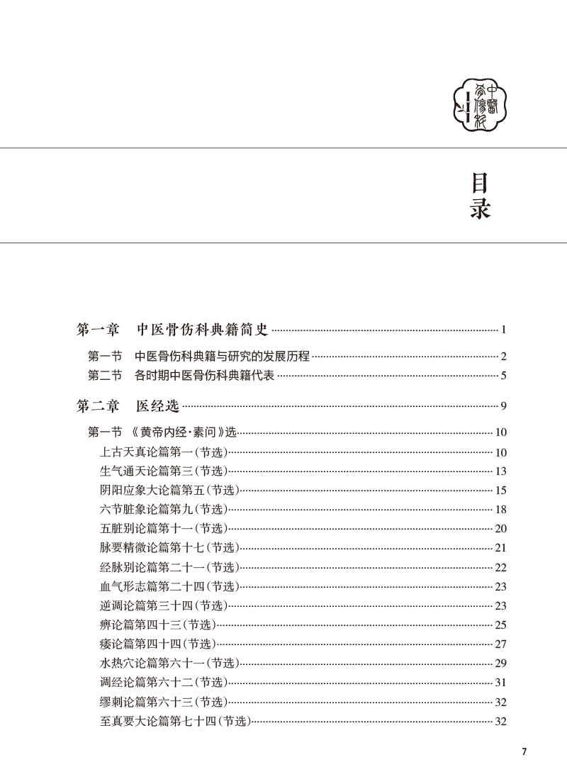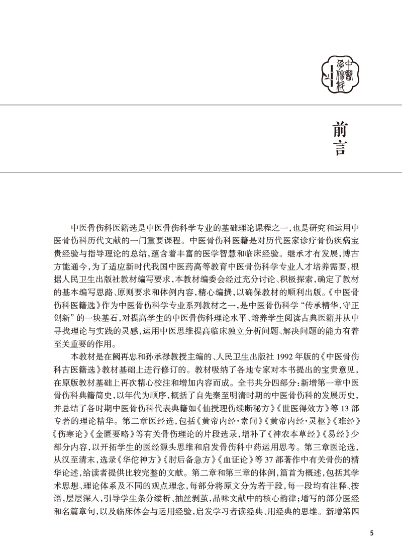 本教材分为四部分,第一部分简要介绍中医骨伤科典籍简史,第二部分为医经,第三部分为医论,按年代排列,精选历代医家有关骨伤科基本理论及临床方法的论述进行阐述。选录内容包括《黄帝内经》《难经》《伤寒论》《金匮要略》《仙授理伤续断秘方》等42本医籍著作有关骨伤的内容。第四部分摘录名家医案,使学生从医籍中领悟传统中医骨伤医家的临床思路。本教材特色如下:①教材中增设“临床应用思路”模块,引导学生沿着医籍文献进行思考,更加突出中医骨伤科学的学用一致特性。②在各章节内容中,通过医家名言、历史事件、临床案例的教授,将丰富的思政内涵与教学内容有机融合。