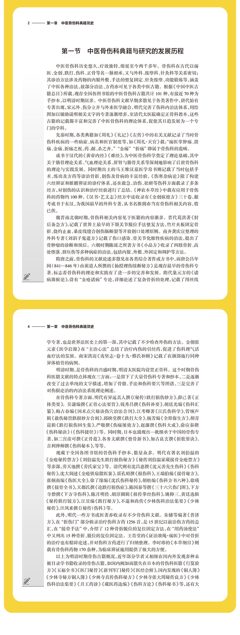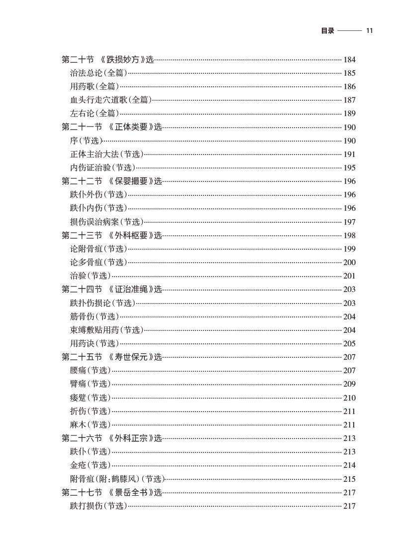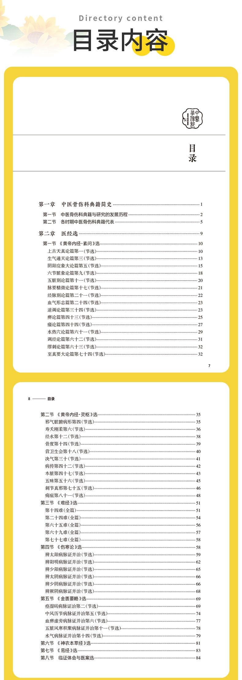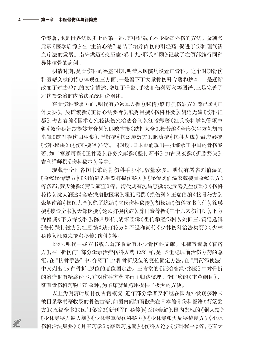 本教材分为四部分,第一部分简要介绍中医骨伤科典籍简史,第二部分为医经,第三部分为医论,按年代排列,精选历代医家有关骨伤科基本理论及临床方法的论述进行阐述。选录内容包括《黄帝内经》《难经》《伤寒论》《金匮要略》《仙授理伤续断秘方》等42本医籍著作有关骨伤的内容。第四部分摘录名家医案,使学生从医籍中领悟传统中医骨伤医家的临床思路。本教材特色如下:①教材中增设“临床应用思路”模块,引导学生沿着医籍文献进行思考,更加突出中医骨伤科学的学用一致特性。②在各章节内容中,通过医家名言、历史事件、临床案例的教授,将丰富的思政内涵与教学内容有机融合。