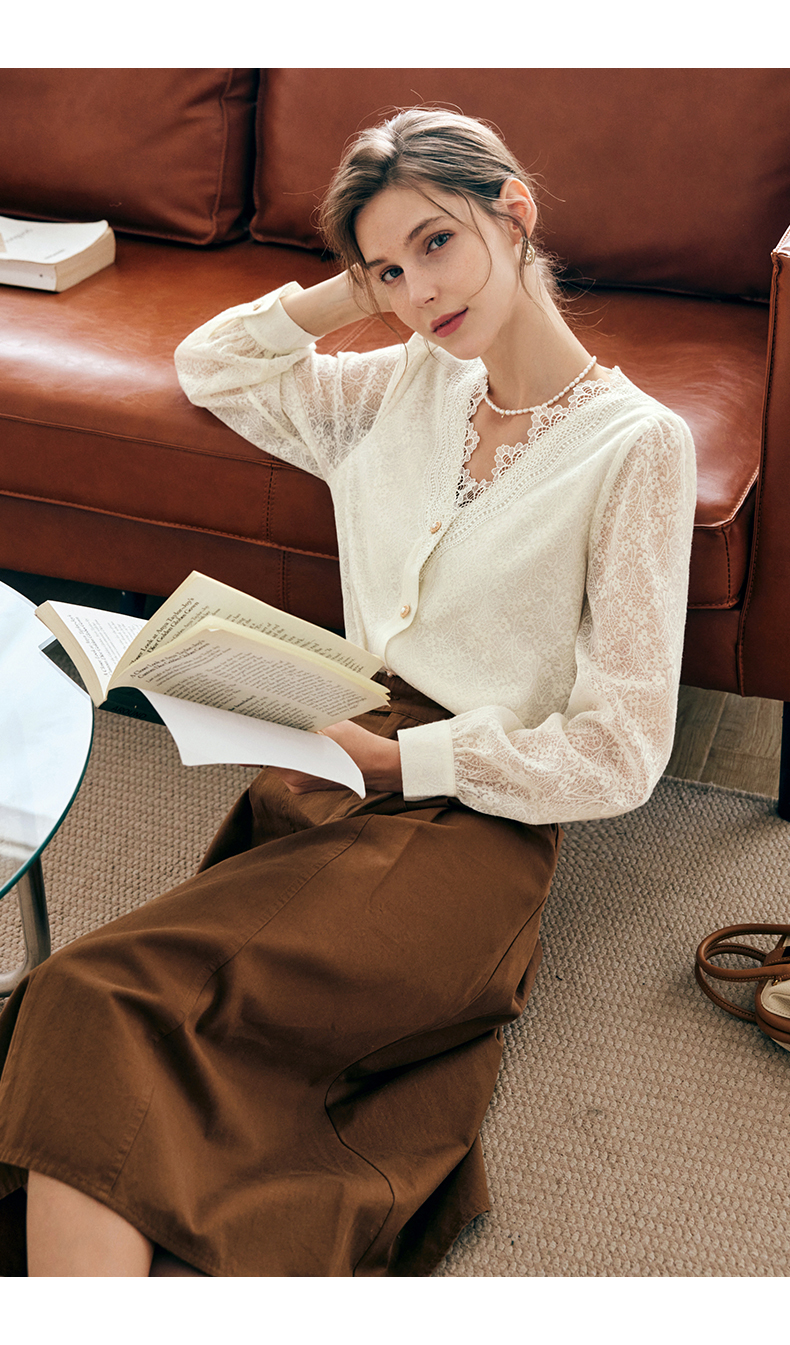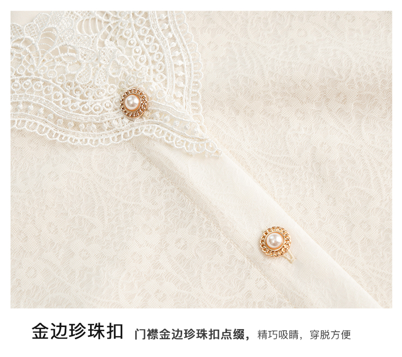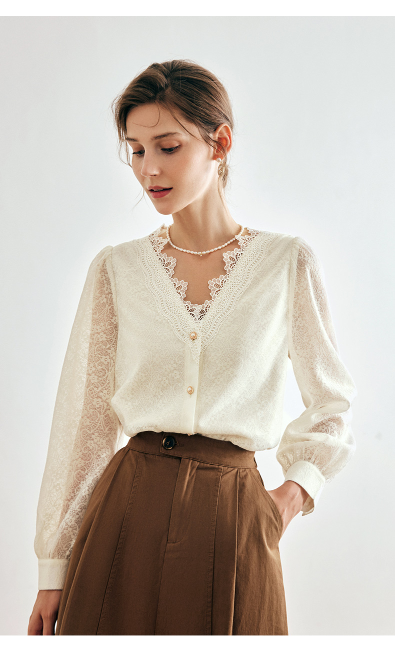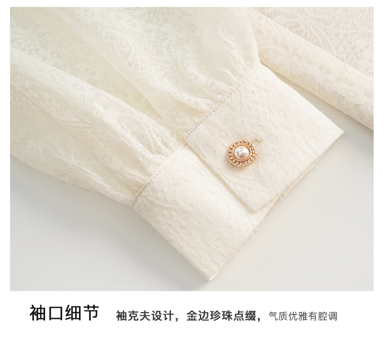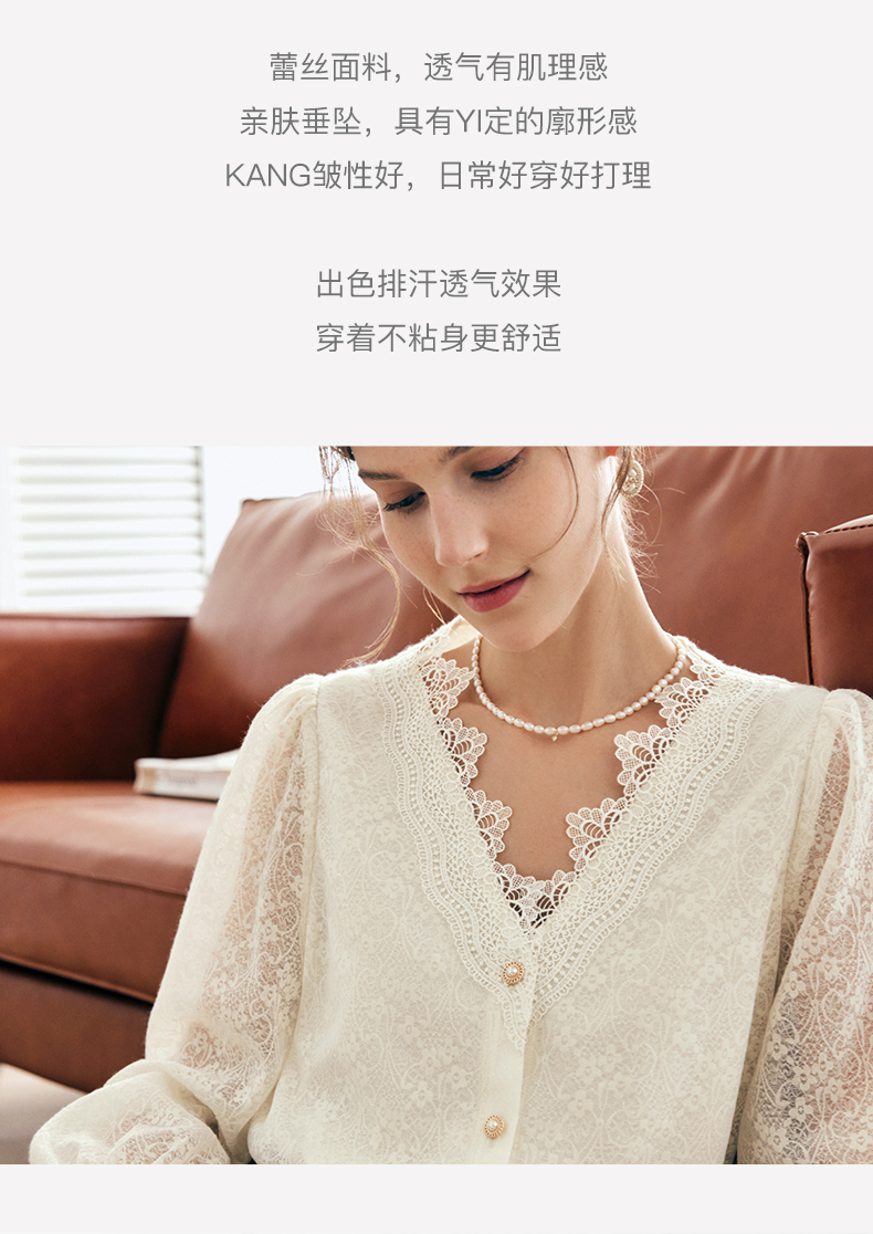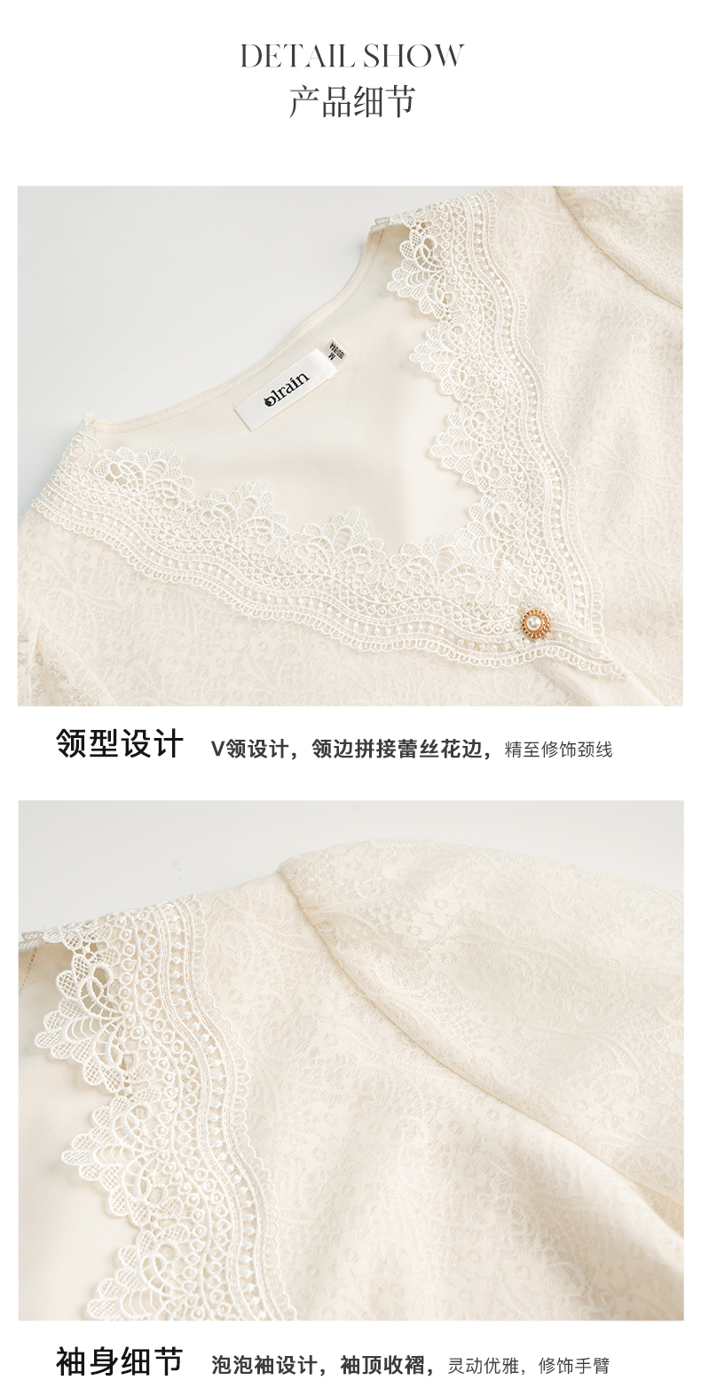 OLrain欧芮儿法式米白色雪纺蕾丝衫女秋季2022年新款v领甜美小衫