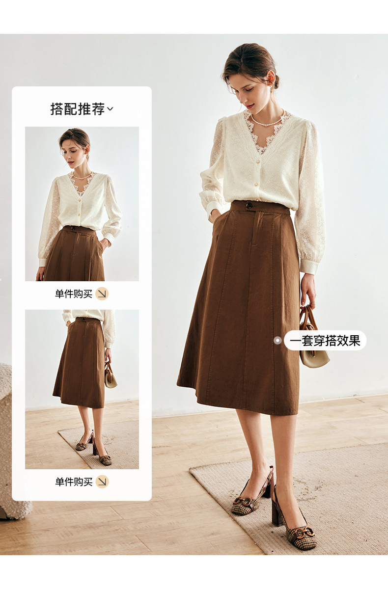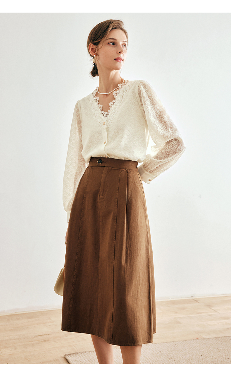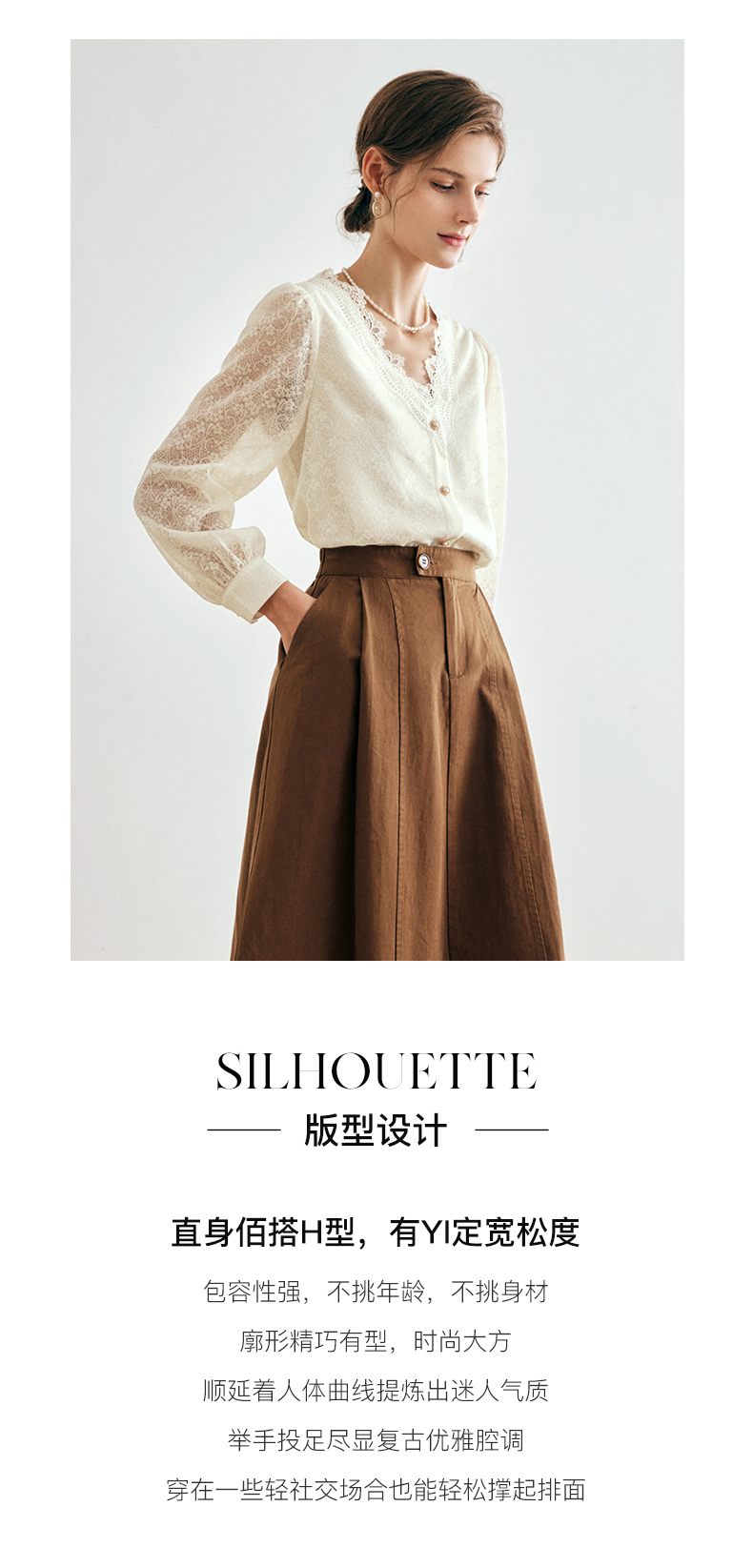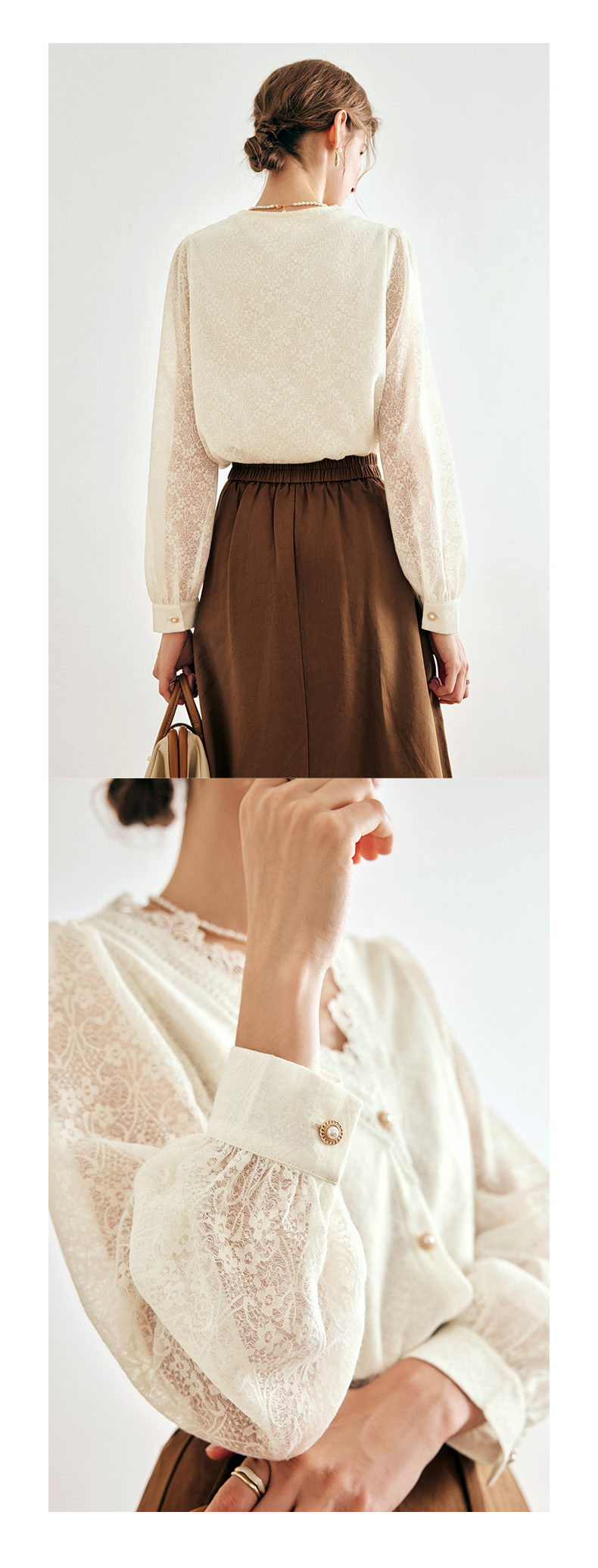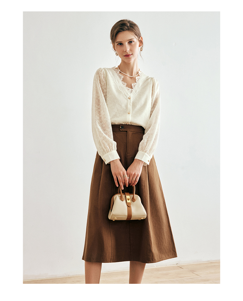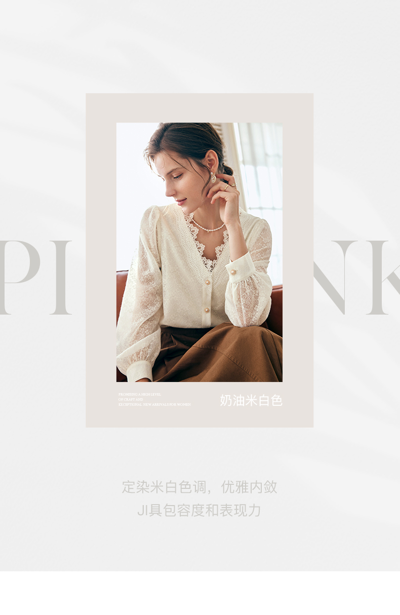 OLrain欧芮儿法式米白色雪纺蕾丝衫女秋季2022年新款v领甜美小衫