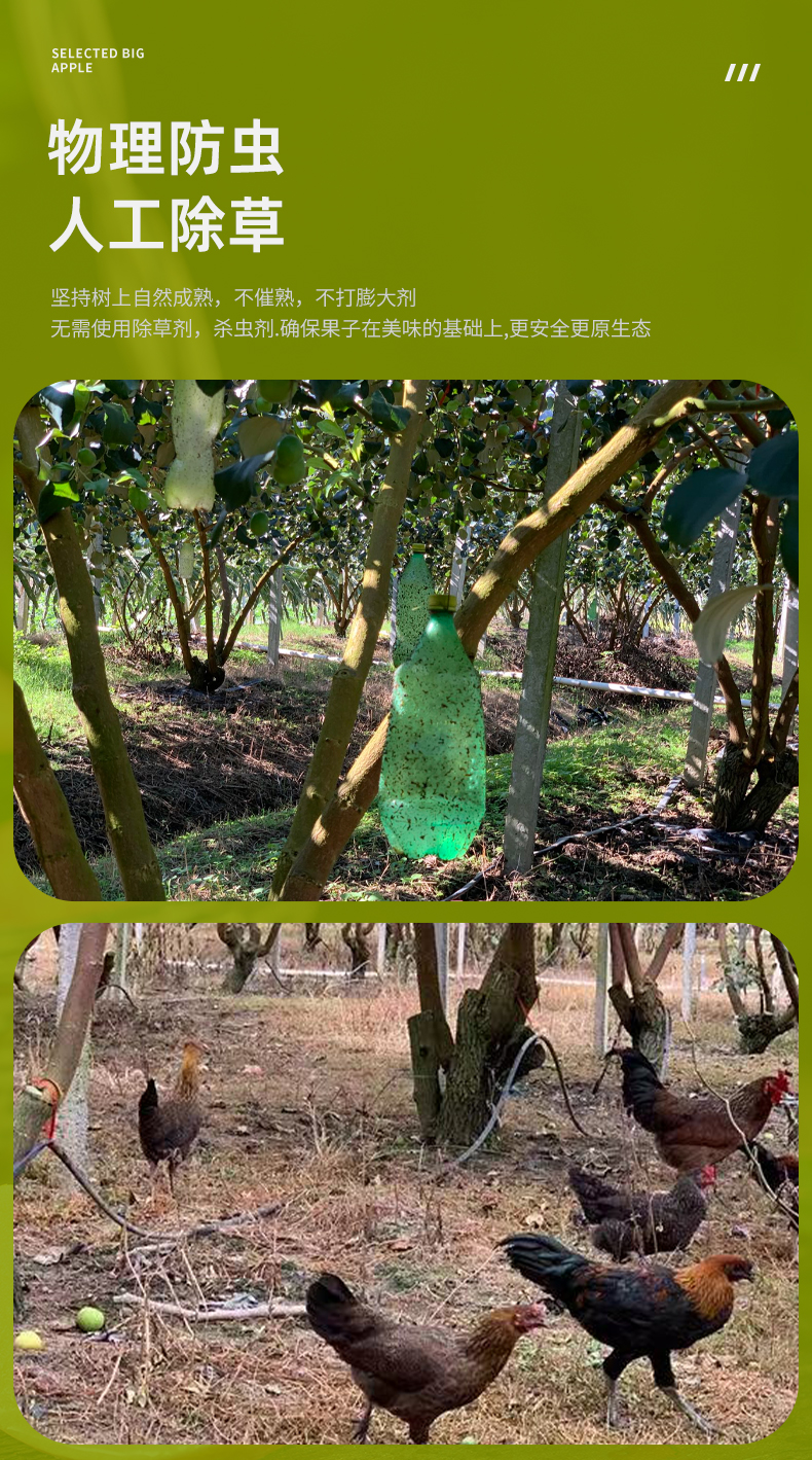 7、生态种植:果园采用生态种植方式,每一枚果子,都在土鸡、大鹅的陪伴下生长