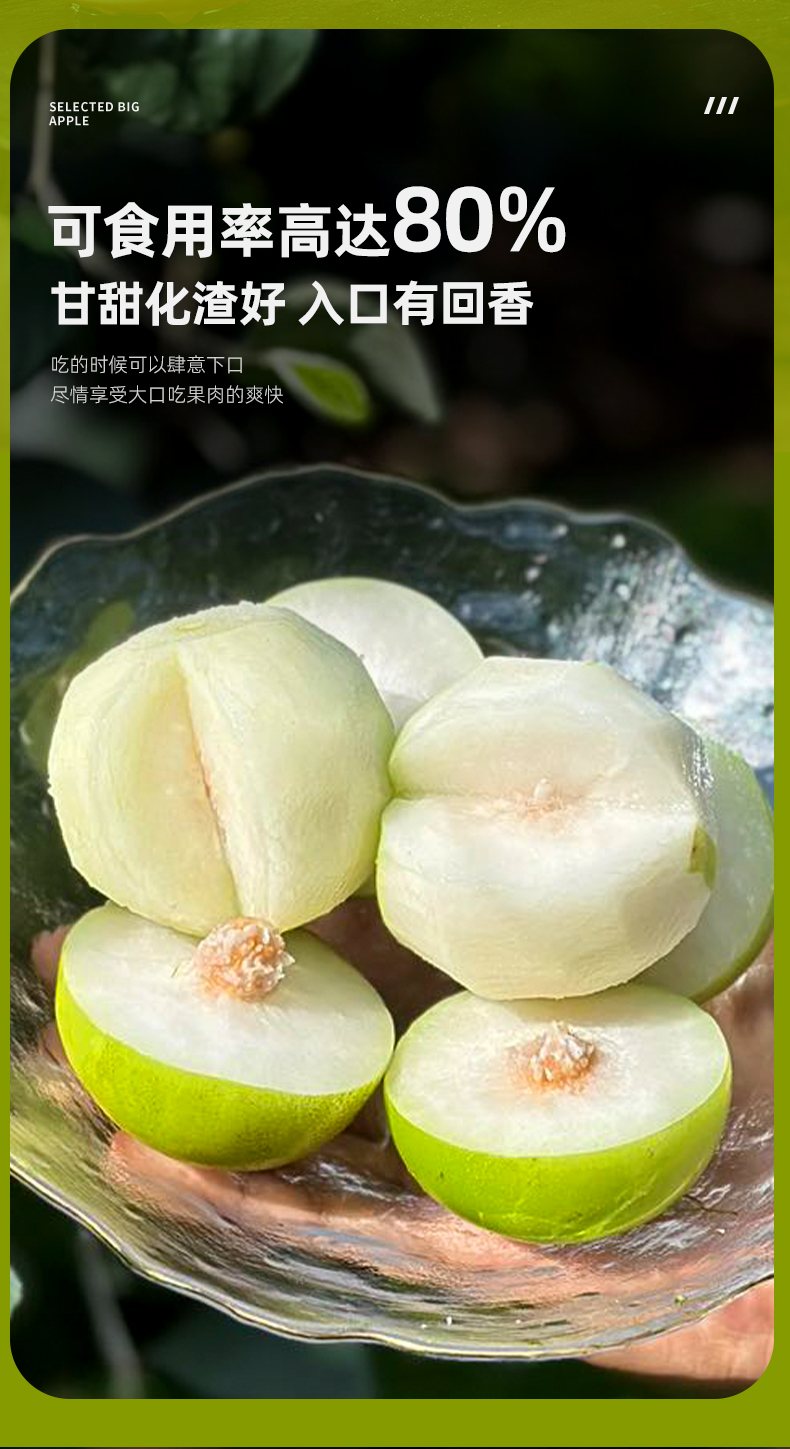 3、极品果肉:果肉白嫩细腻,清香水灵,新鲜脆爽,甜蜜多汁