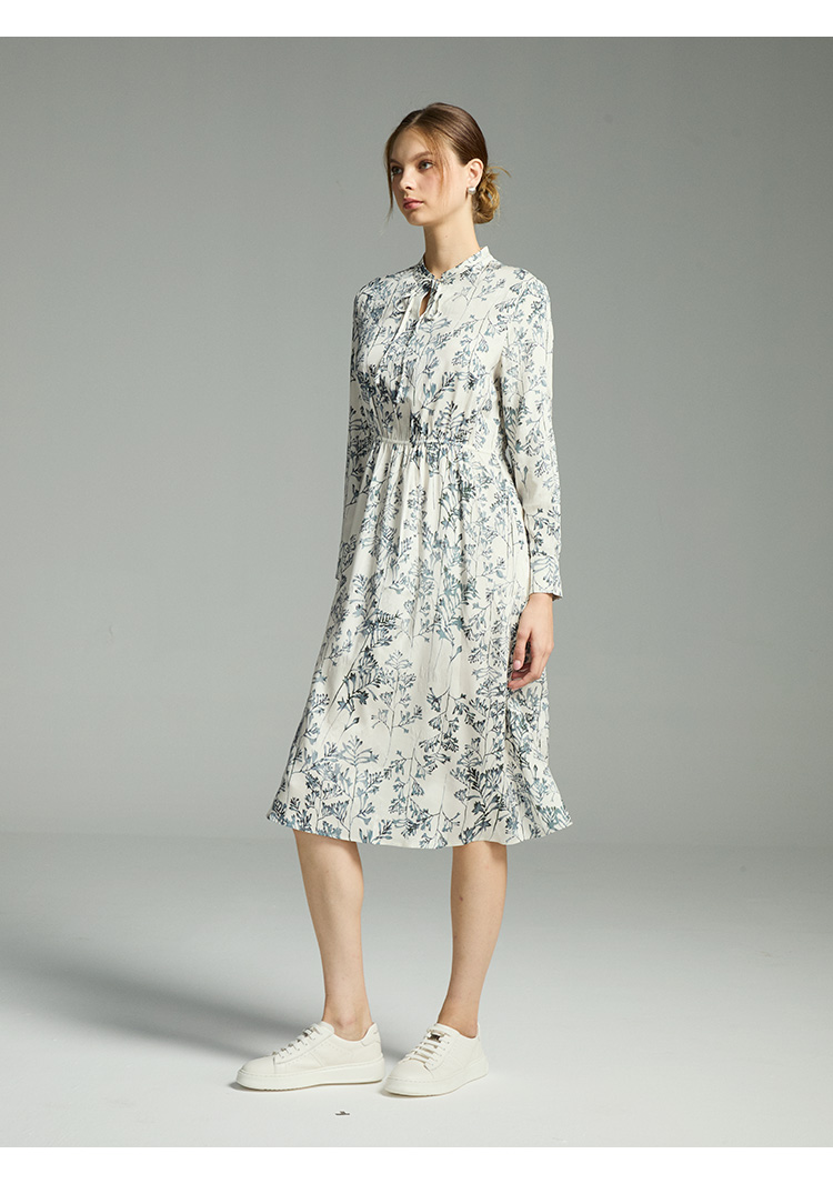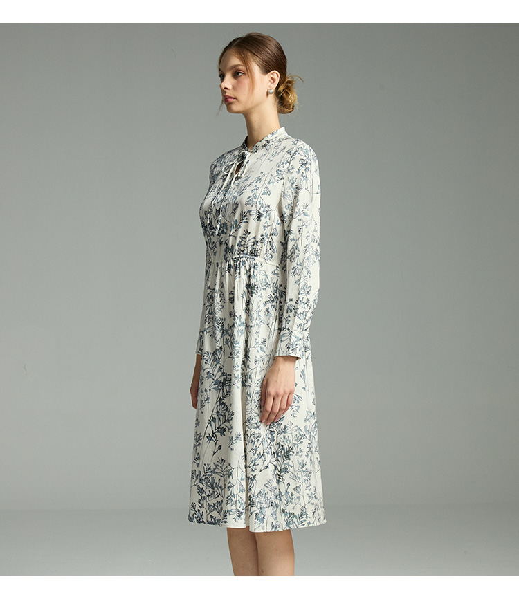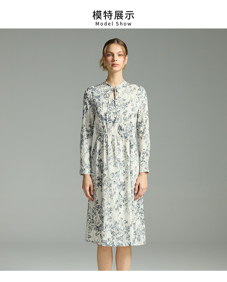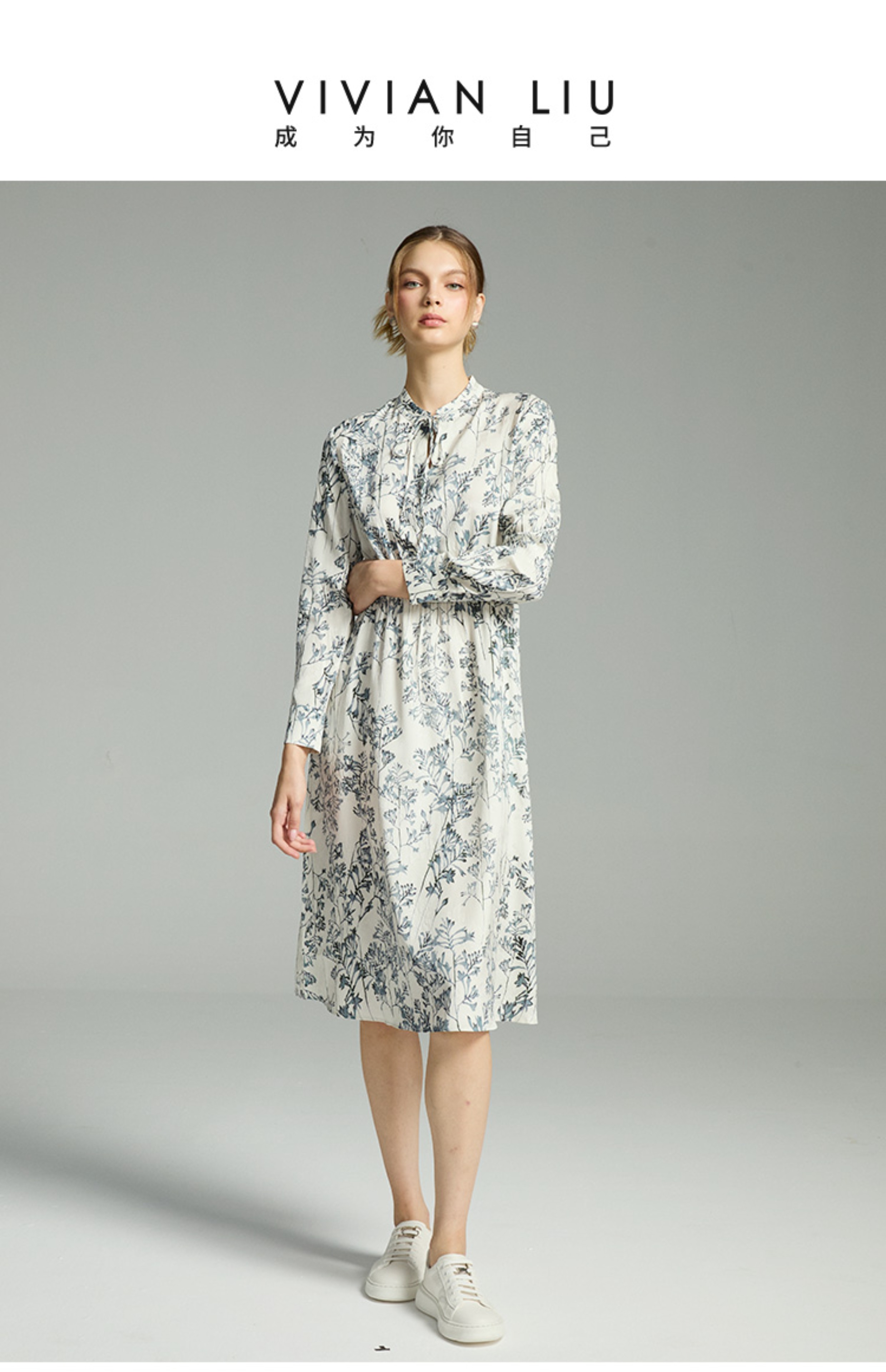 VIVIAN LIU TD2444106初秋女装新款圆领水墨叶影系带长袖连衣裙