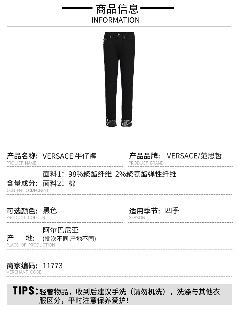 【超惠秒】Versace 范思哲 裤脚太阳花标志印花 男士弹棉休闲牛仔长裤 11773