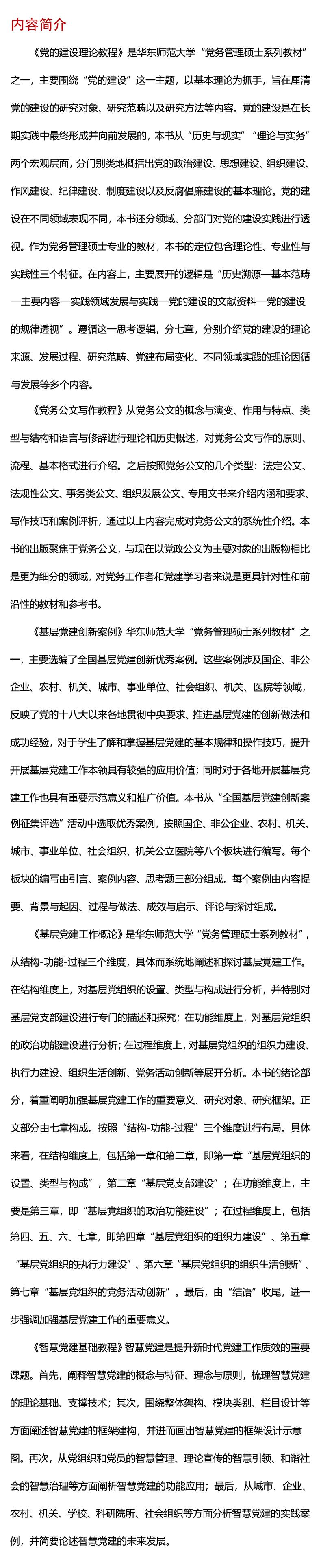 本书主要围绕“党的建设”这一主题,以基本理论为抓手,旨在厘清党的建设的研究对象、研究范畴以及研究方法等内容。党的建设是在长期实践中最终形成并向前发展的,本书从“历史与现实”“理论与实务”两个宏观层面,分门别类的概括出党的政治建设、思想建设、组织建设、作风建设、纪律建设、制度建设以及反腐倡廉建设的基本理论。党的建设在不同领域表现不同,本书还分领域、分部门对党的建设实践进行透视。主要内容:作为党务管理专业的教材,本书的定位包含理论性、专业性与实践性三个特征。在内容涉及上,主要展开的逻辑是“历史溯源—基本范畴—主要内容—实践领域发展与实践—党的建设的文献资料—党的建设的规律透视”。遵循这一思考逻辑,拟涉七个章节。分别介绍党的建设的理论来源、发展过程、研究范畴、党建布局变化、不同领域实践的理论因循与近期新发展等多个内容。