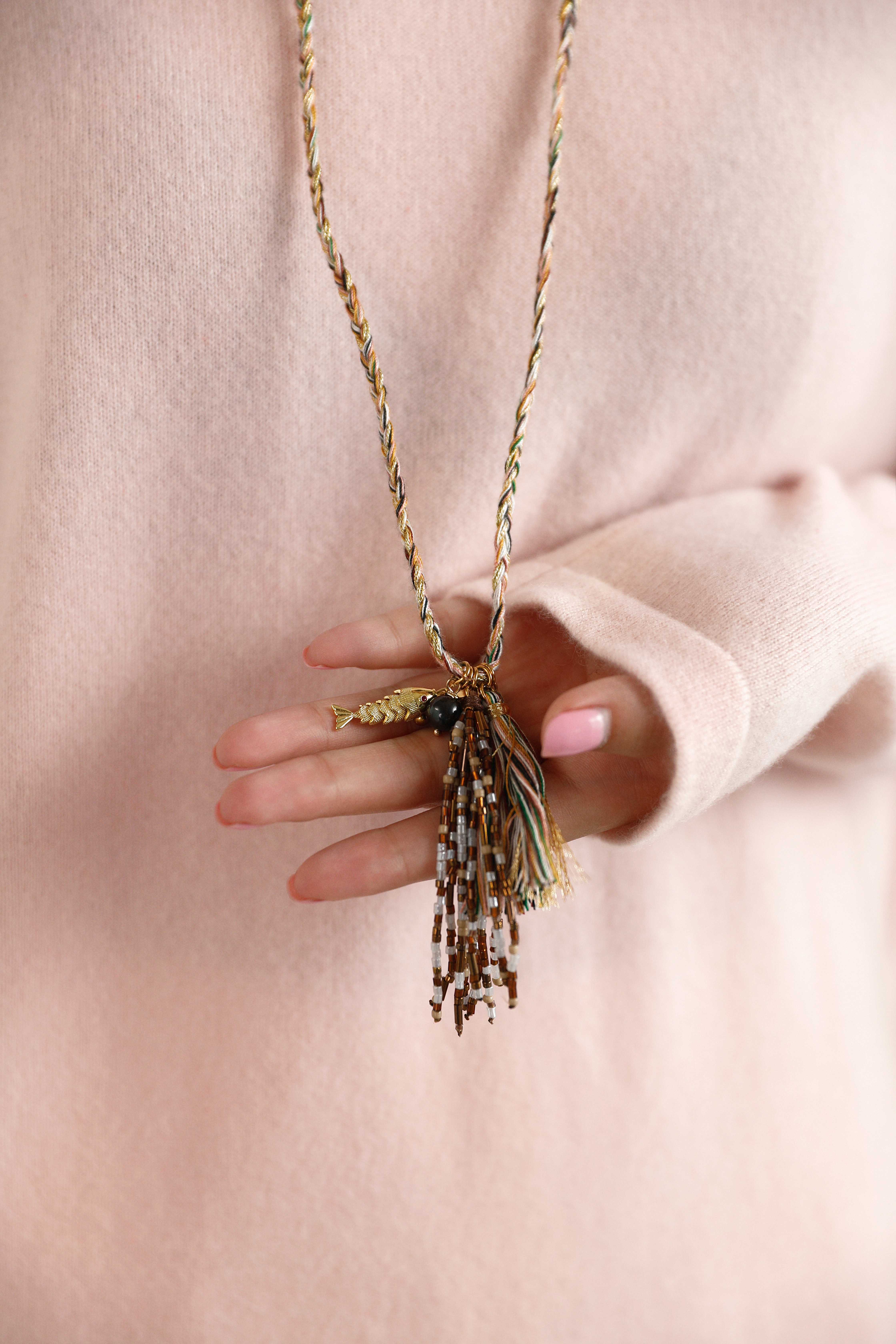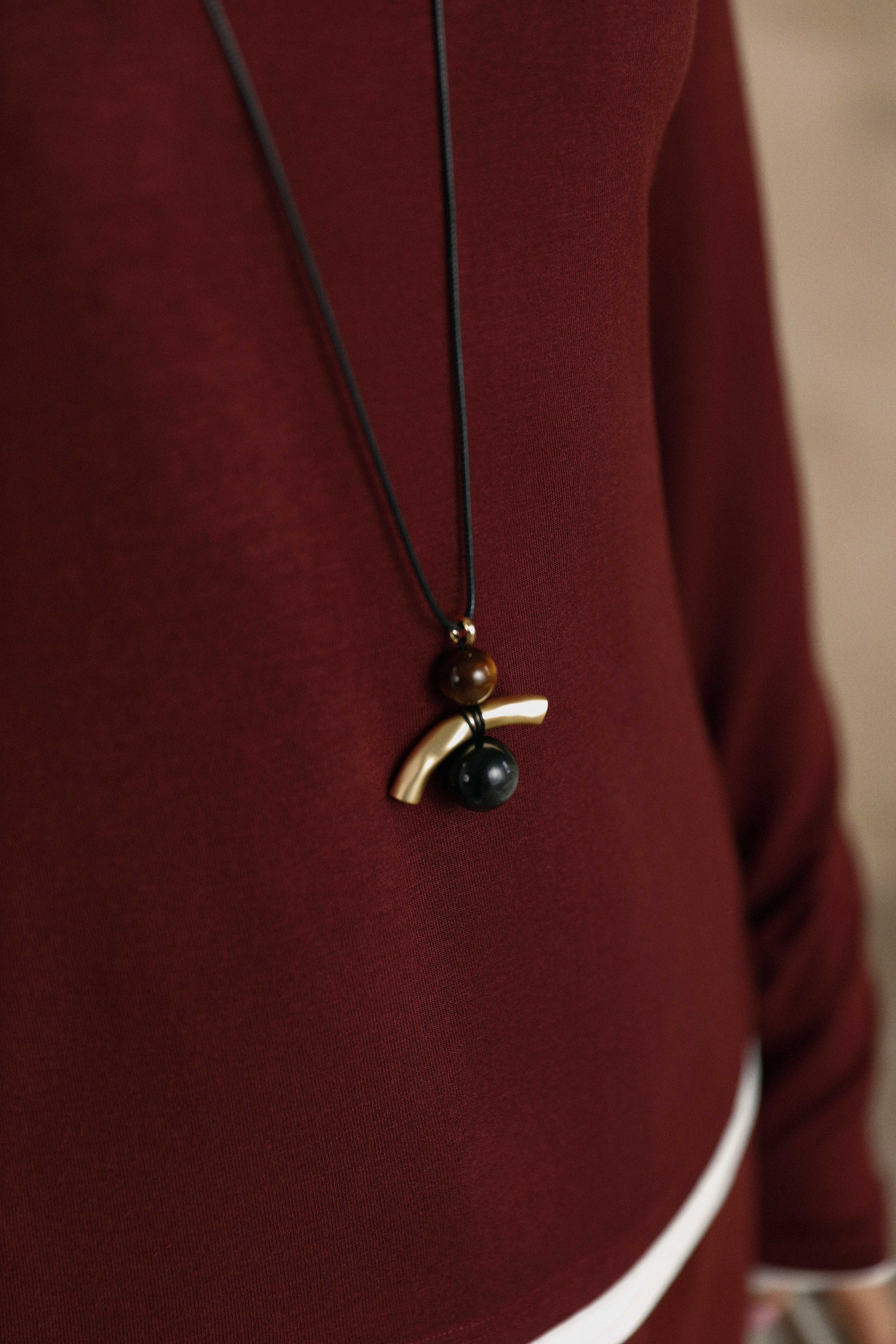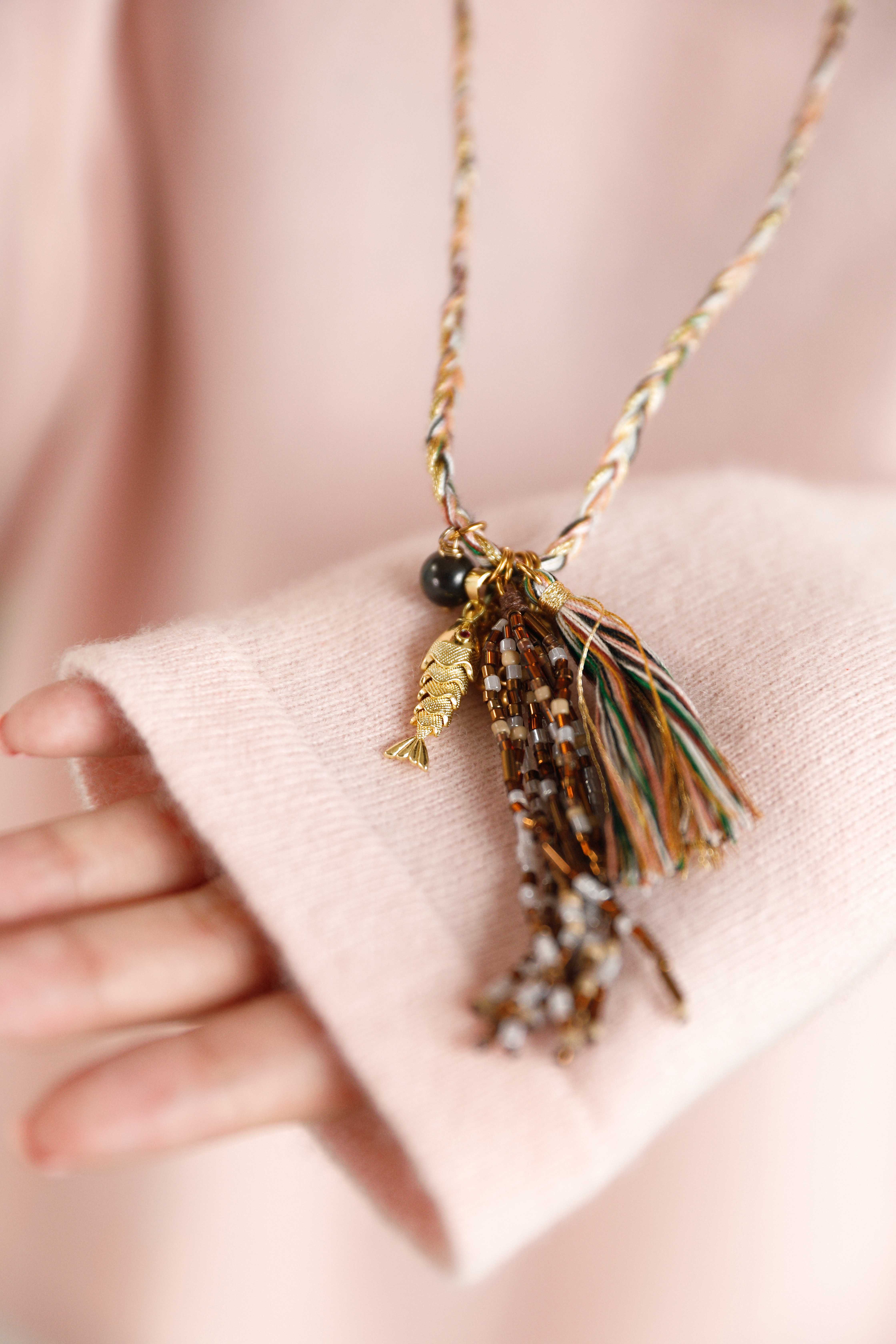 可推拉的结绳设计是它的灵魂,能自由调节项链的形态与长度,上面点缀的水晶与珠子,在滑动间变幻出不同的光彩。