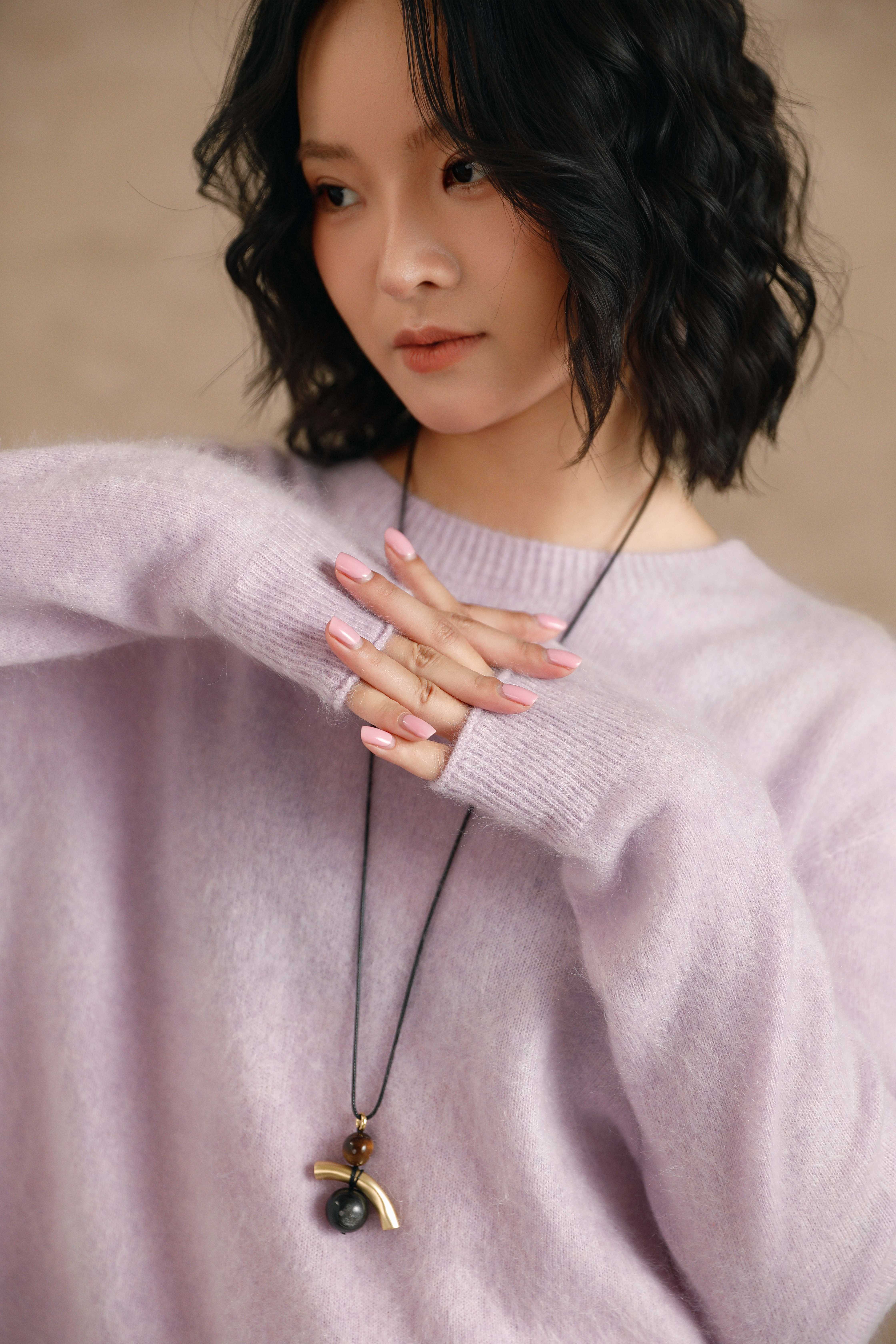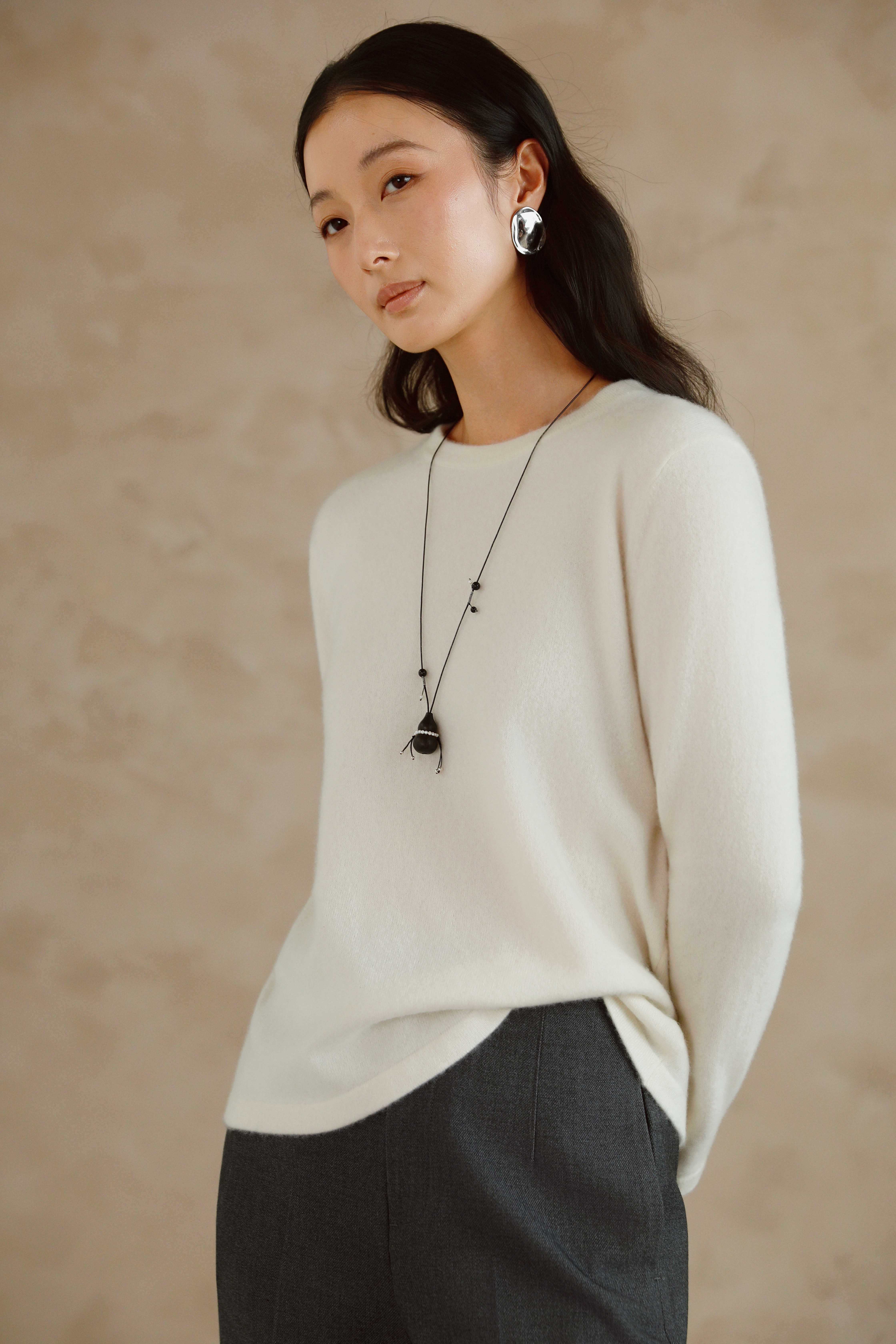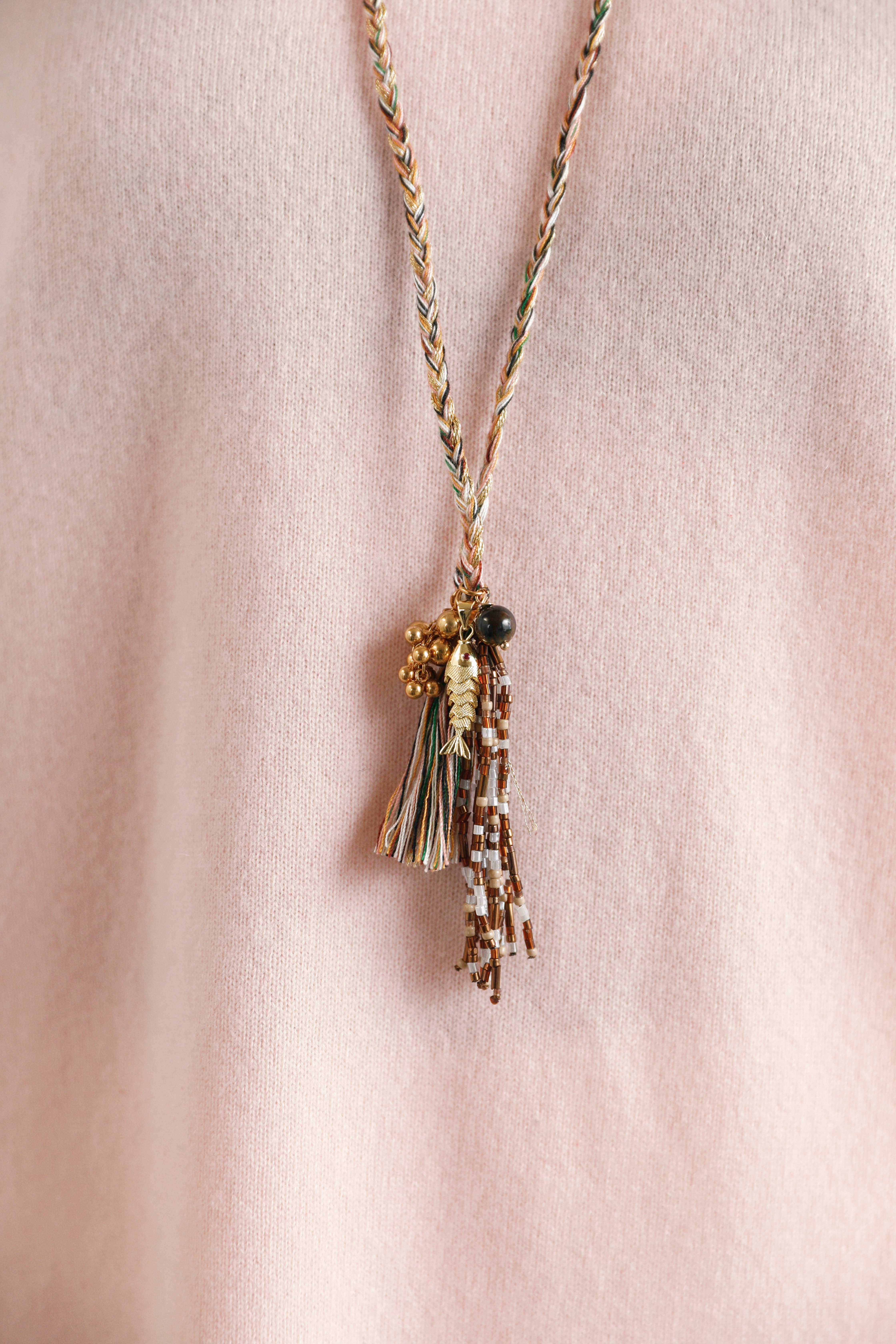 可推拉的结绳设计是它的灵魂,能自由调节项链的形态与长度,上面点缀的水晶与珠子,在滑动间变幻出不同的光彩。