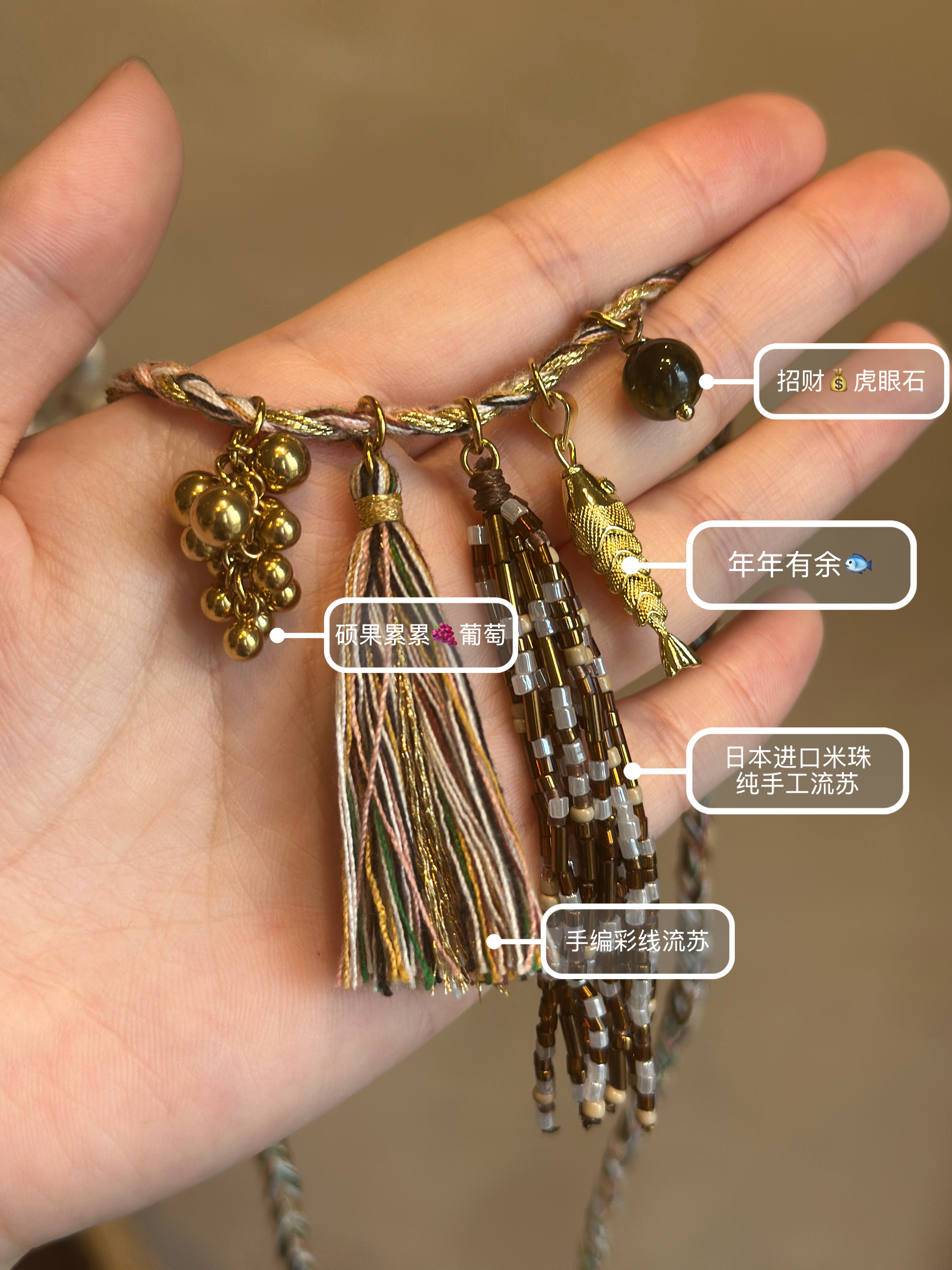 黄铜锻造的实心葡萄,错落有致,模拟自然藤蔓的生动姿态,寓意硕果累累!手编彩线流苏,寓意祈福纳吉,织就锦绣前程;日本进口米珠串流苏,精致灵动,如同收获的稻米;点睛之笔的“年年有余”挂坠与招财虎眼石,共同守护财富与好运!