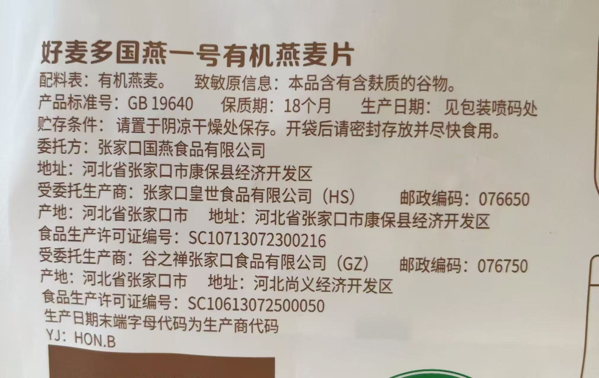 【品名】国燕一号有机燕麦片