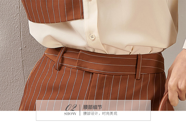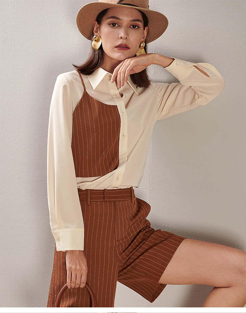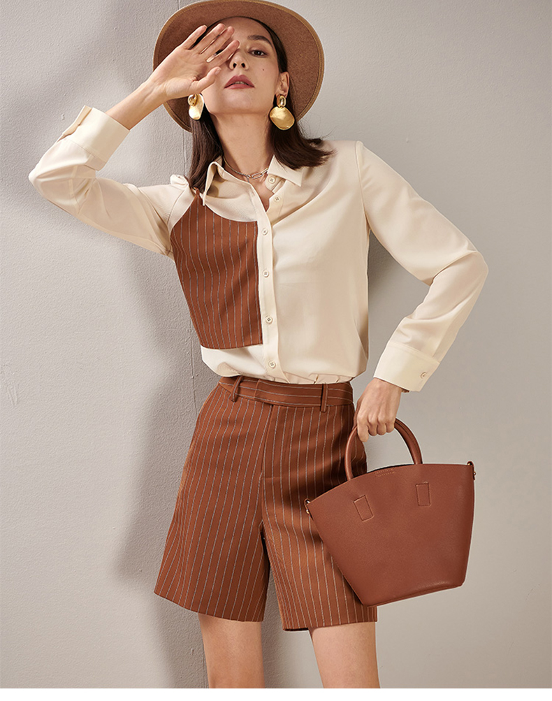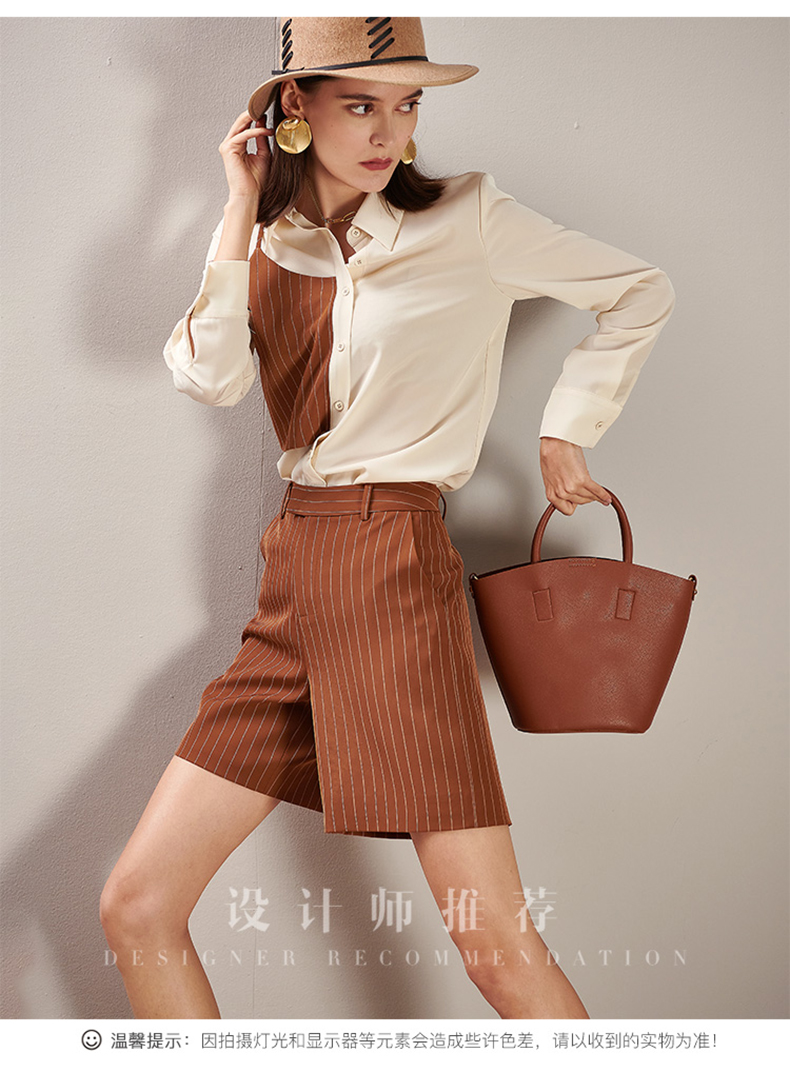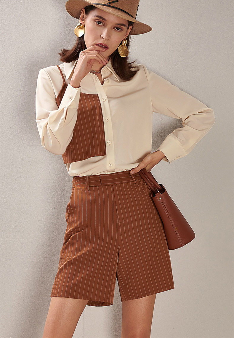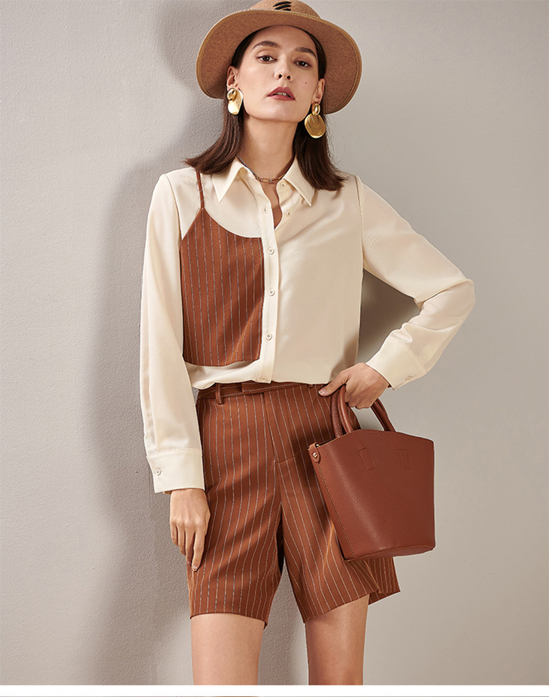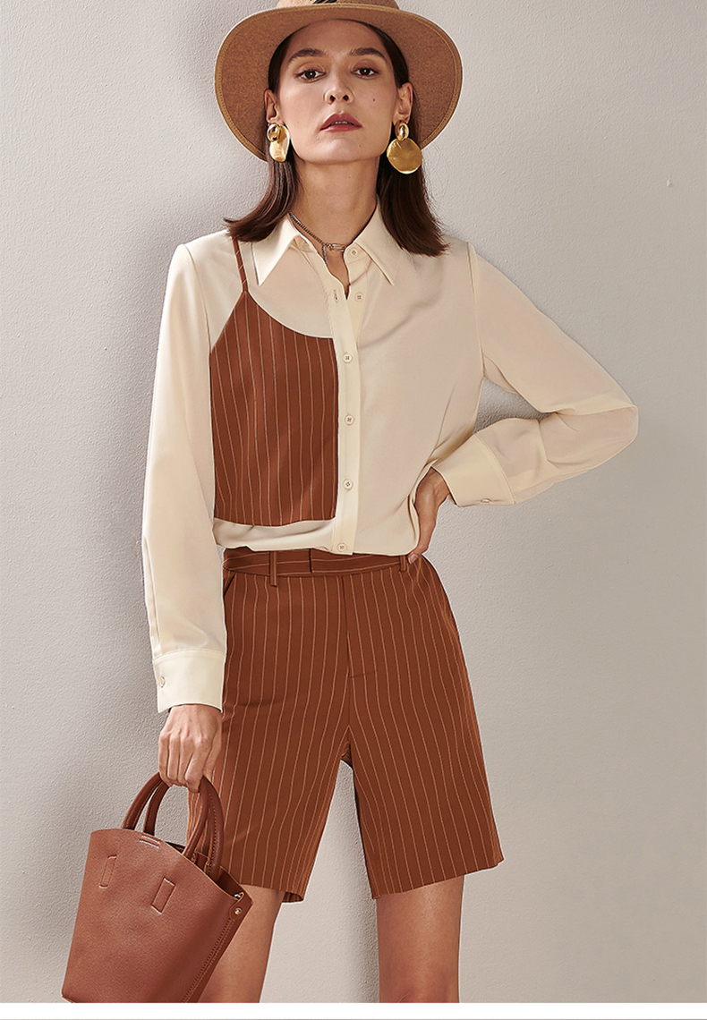 剩XL 芳外春季新款时尚套装拼接长袖衬衫条纹直筒短裤两件套女0194