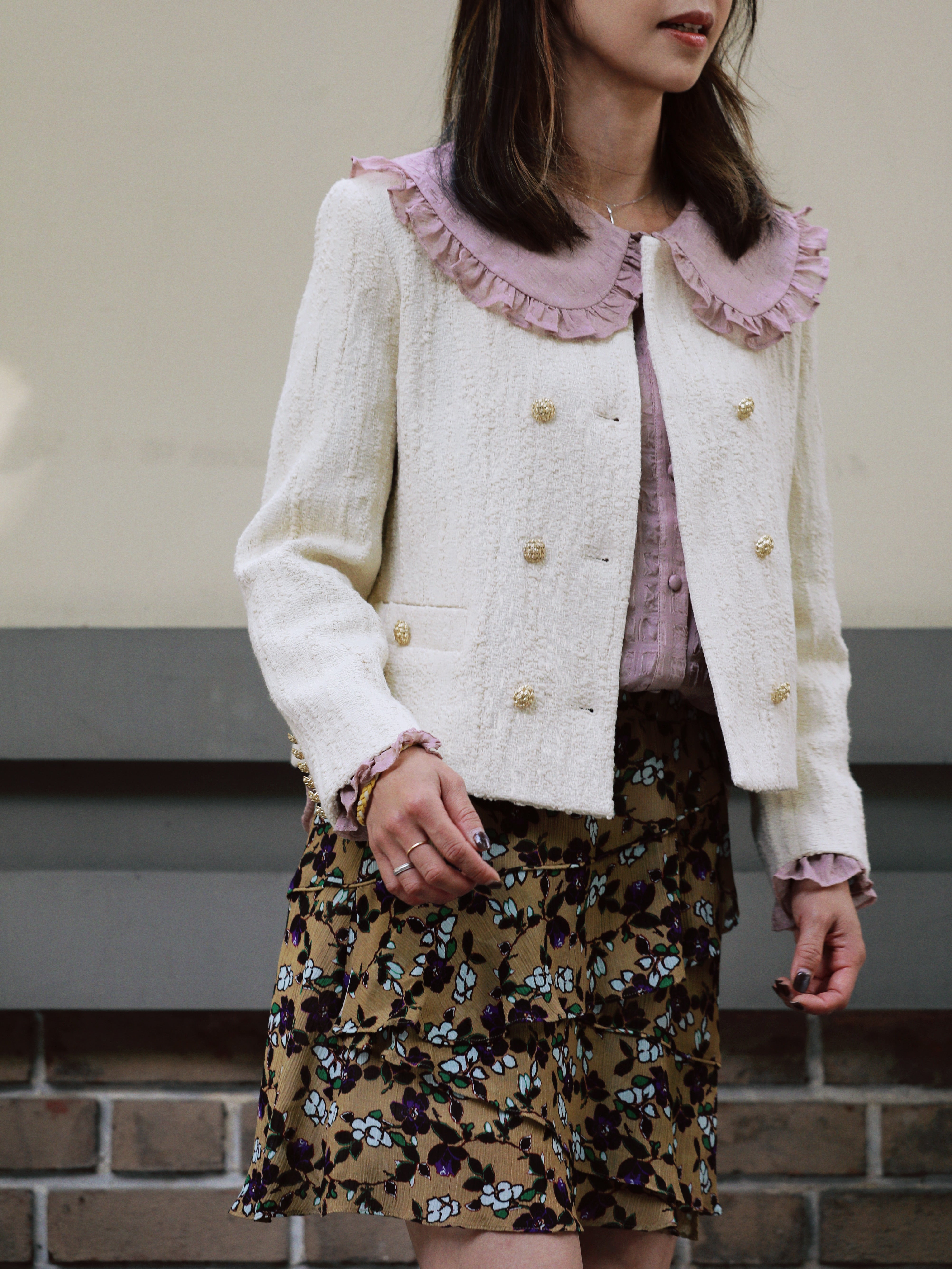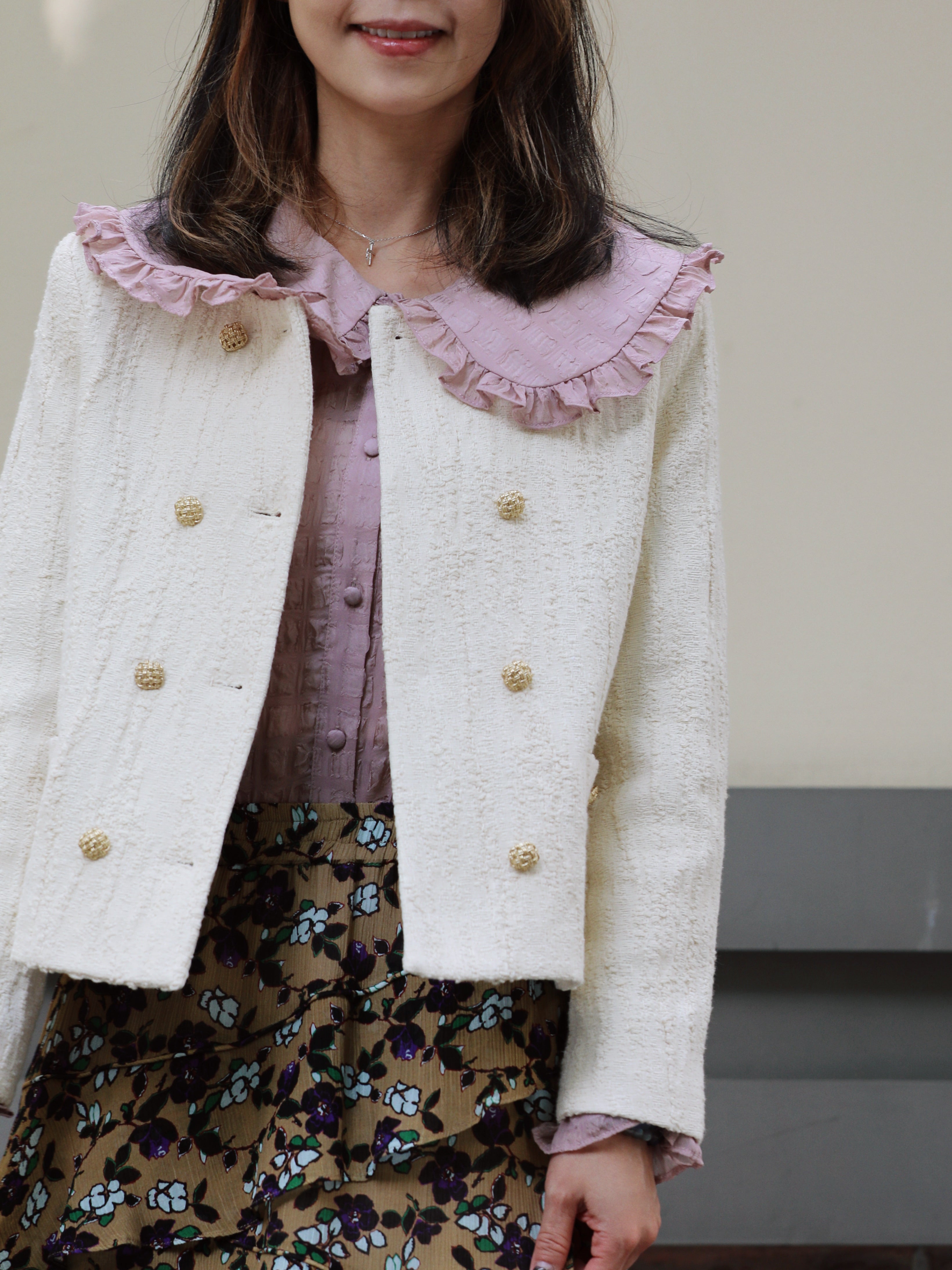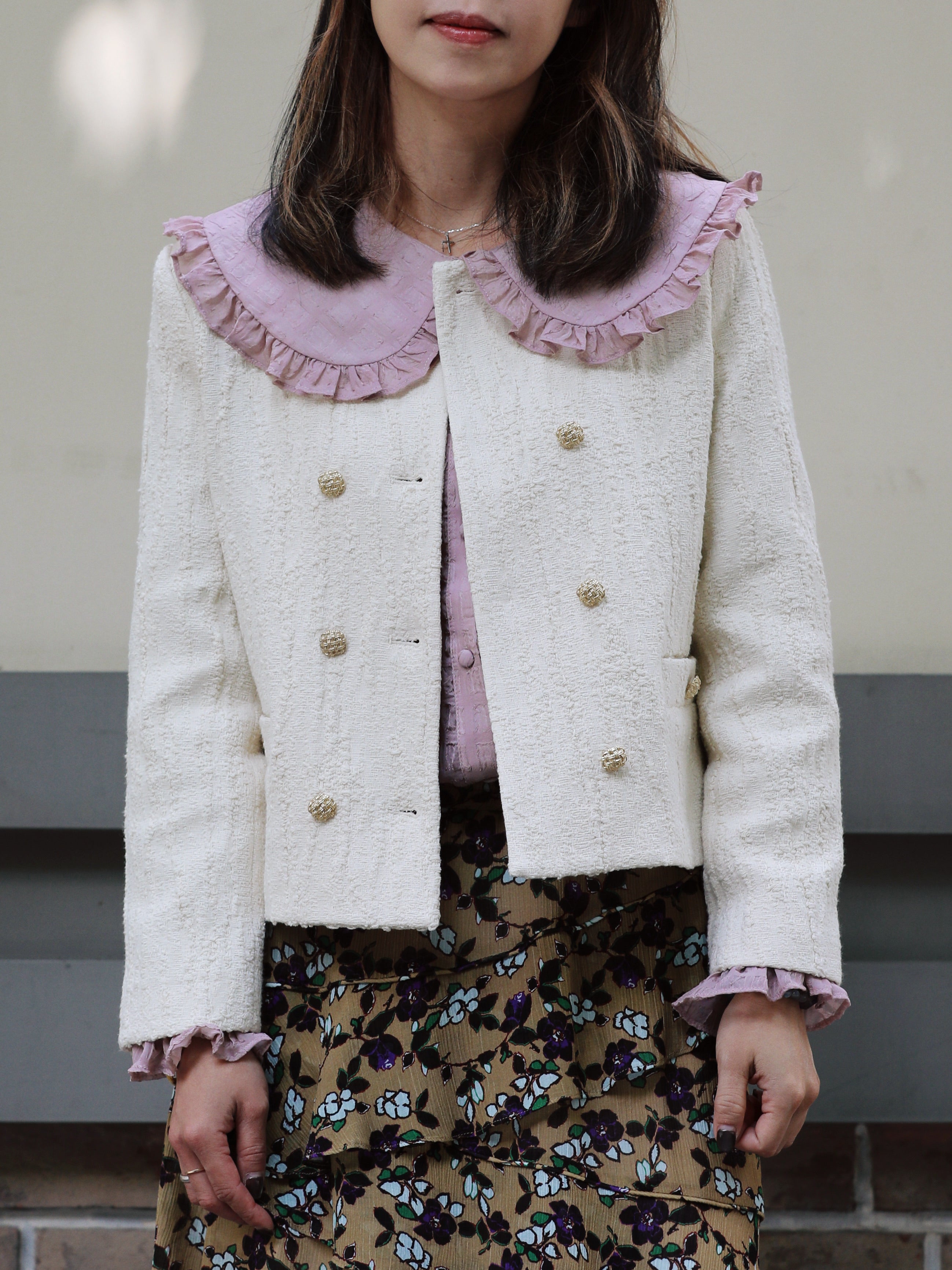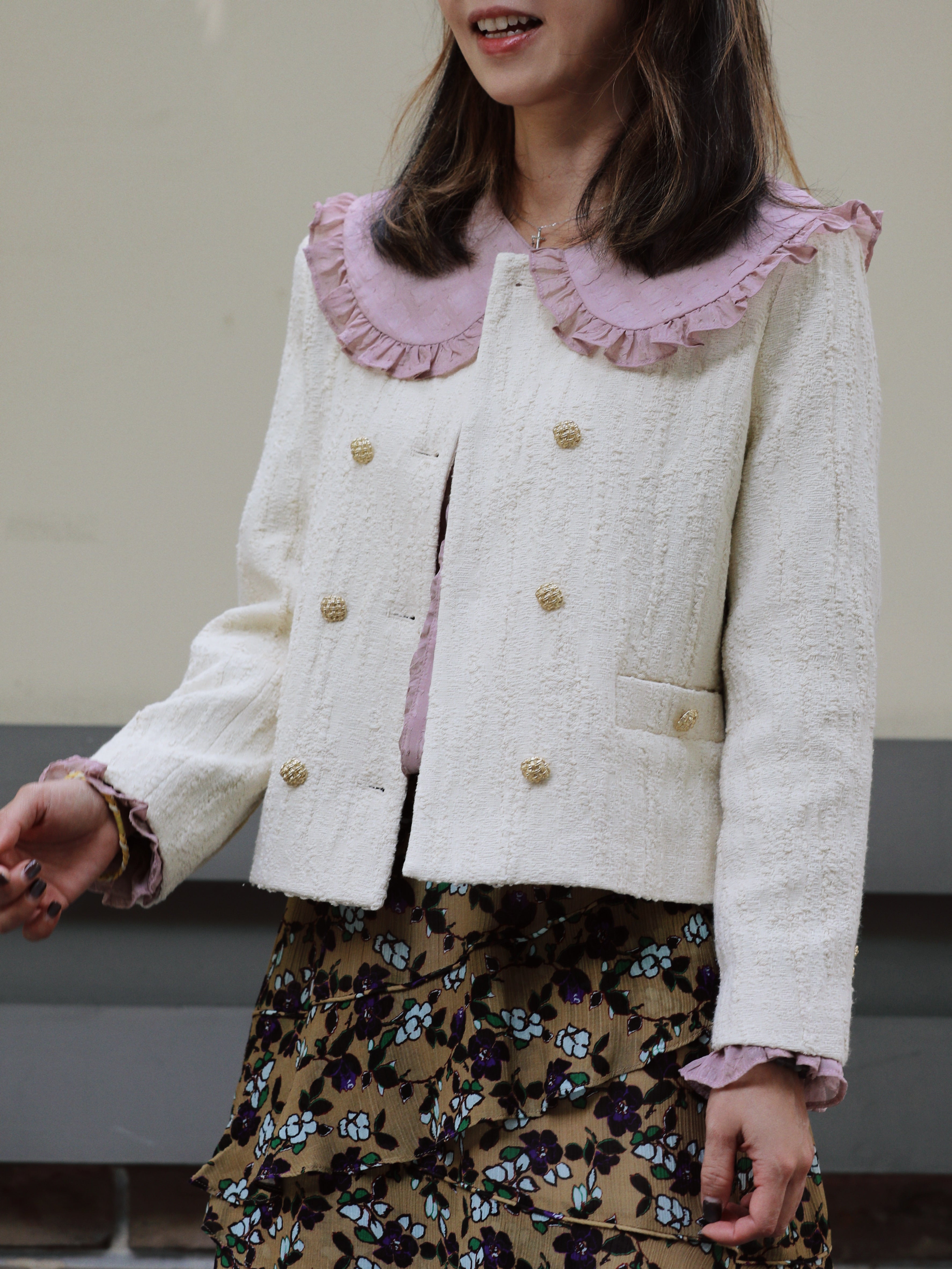 TYNVIE 蓝色泡泡肩V领短花呢夹克