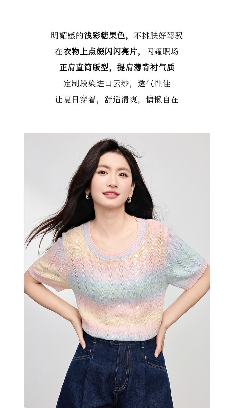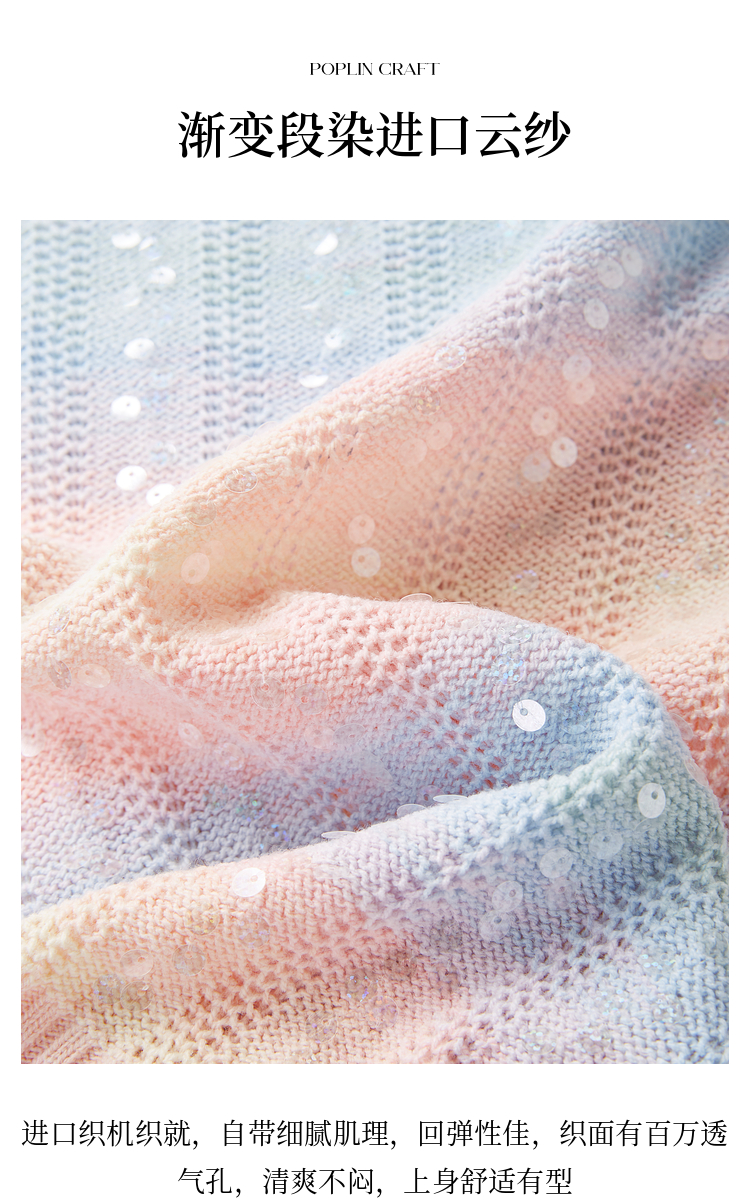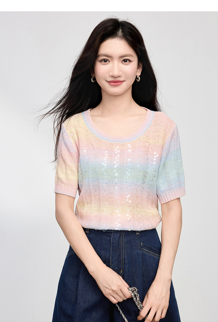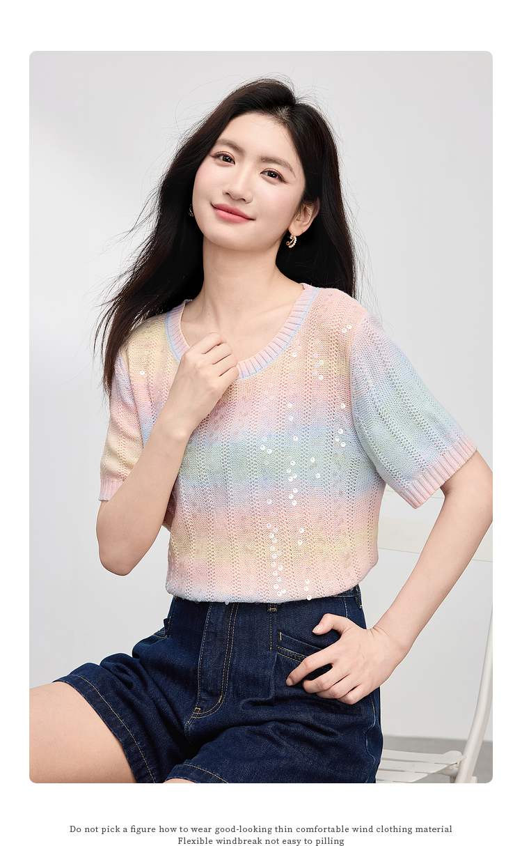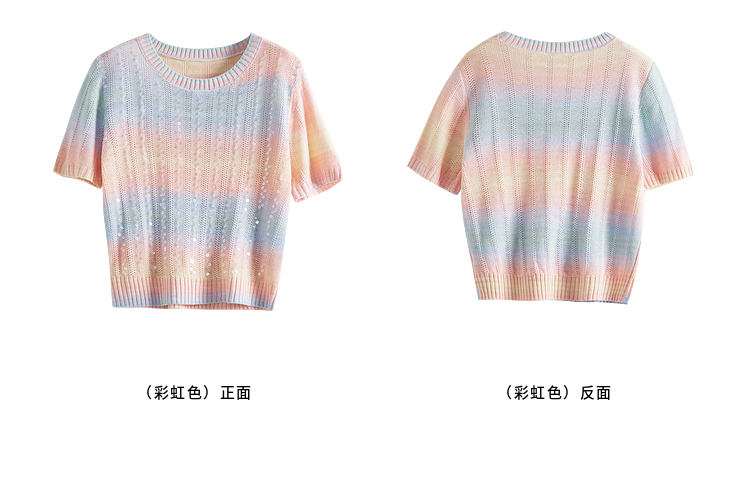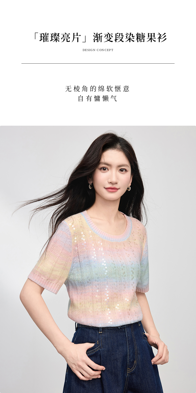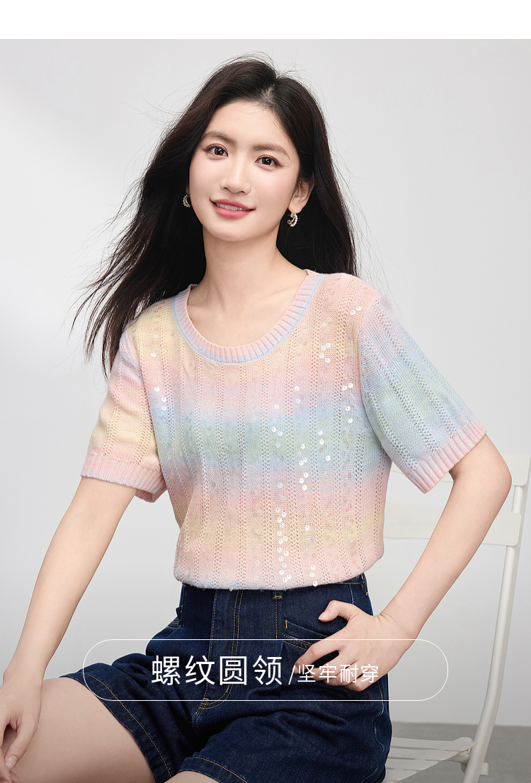 熙世界薄款超好看针织衫女短袖2025夏季新款圆领重工渐变亮片上衣