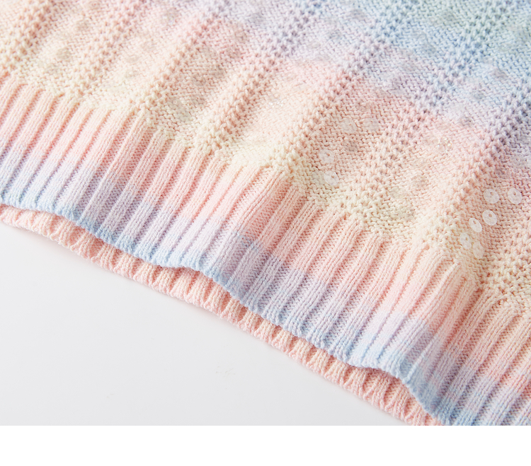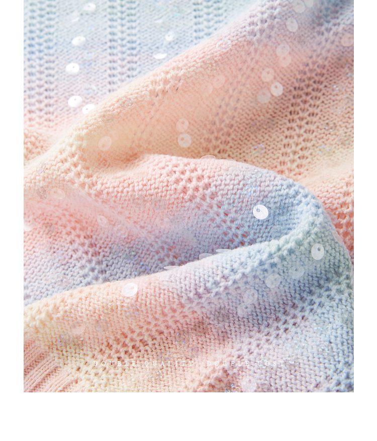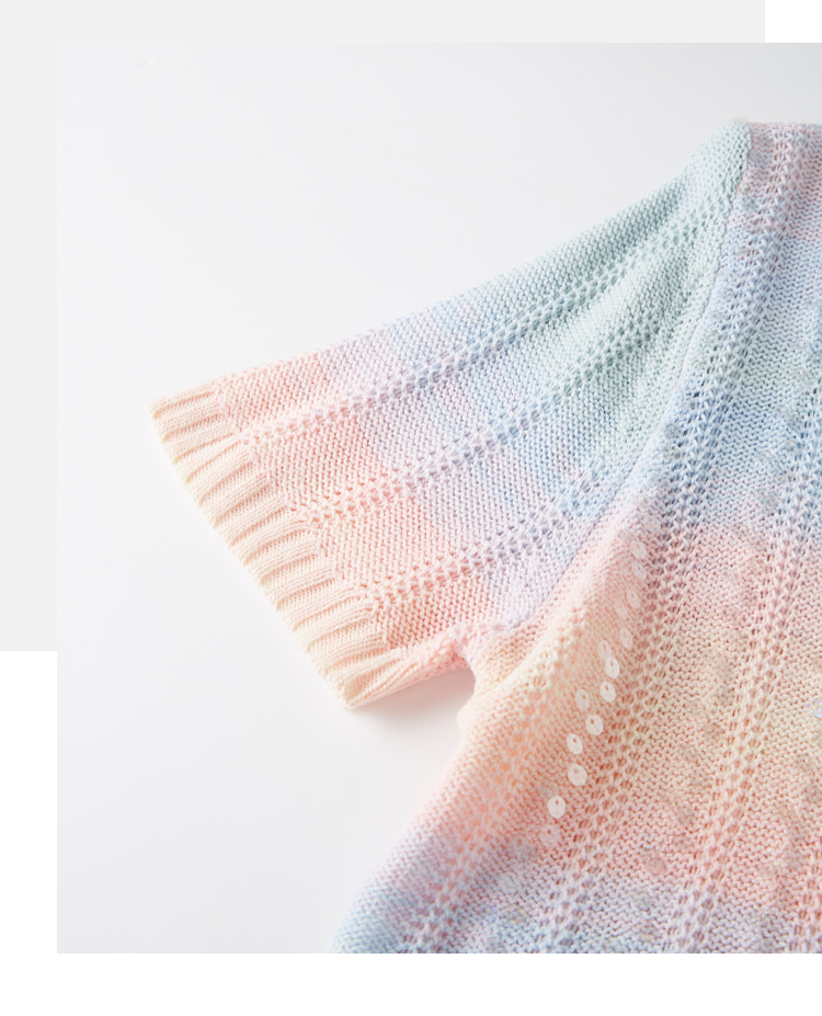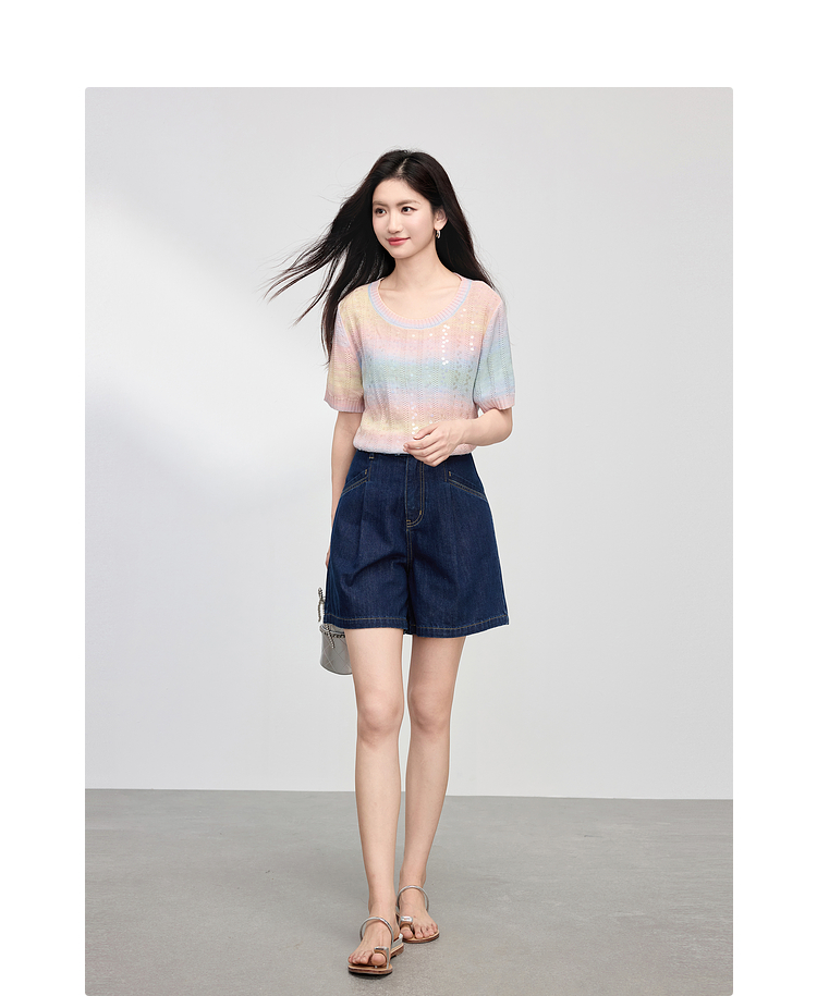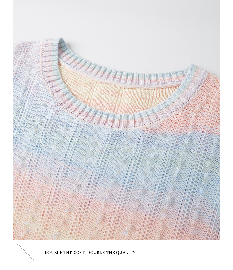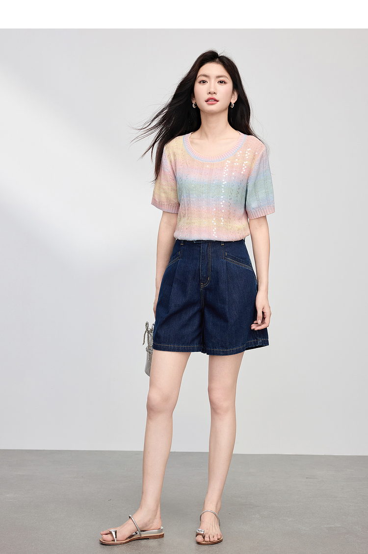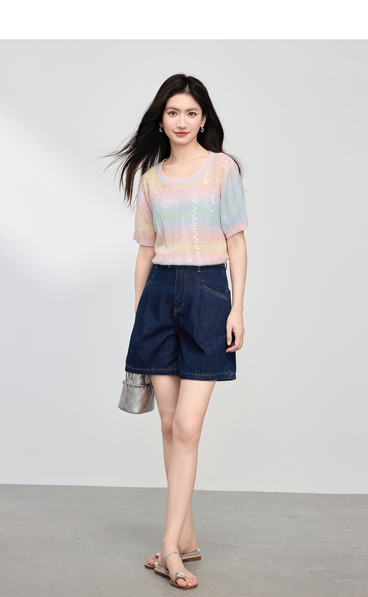 熙世界薄款超好看针织衫女短袖2025夏季新款圆领重工渐变亮片上衣