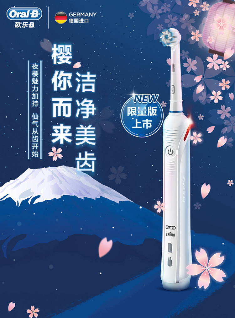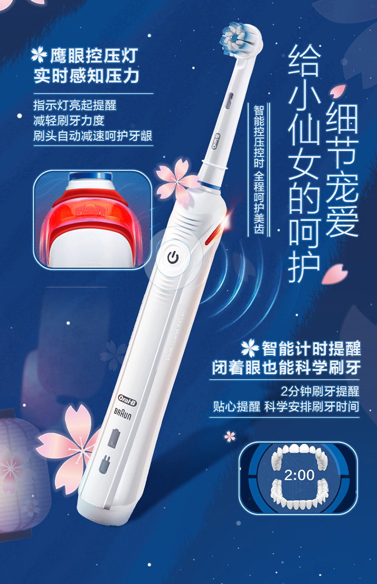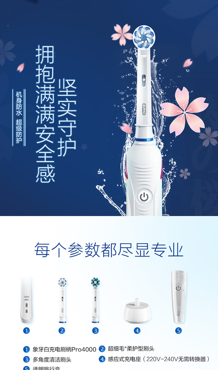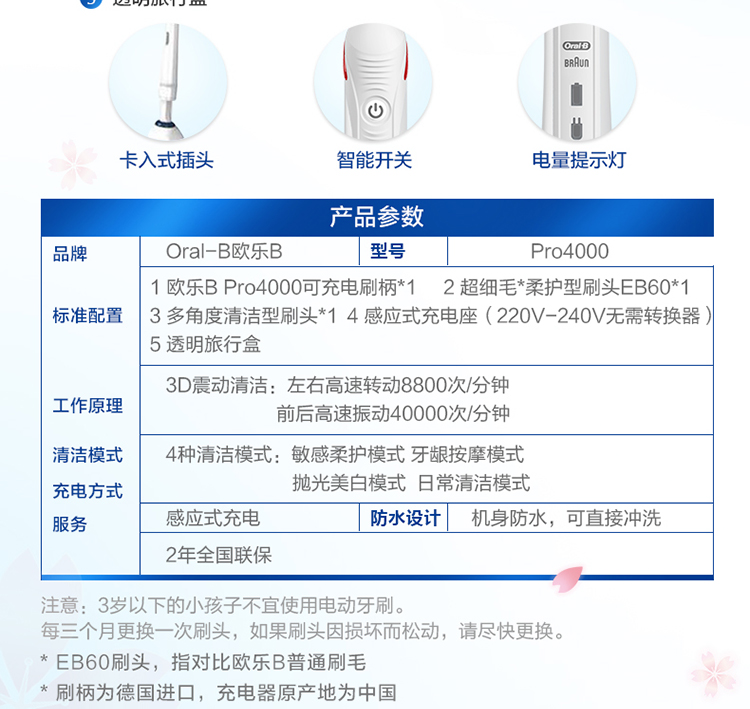欧乐B电动牙刷 3D声波旋转摆动成人情侣充电式(含刷头*2+旅行盒)P4000 白 新年礼物