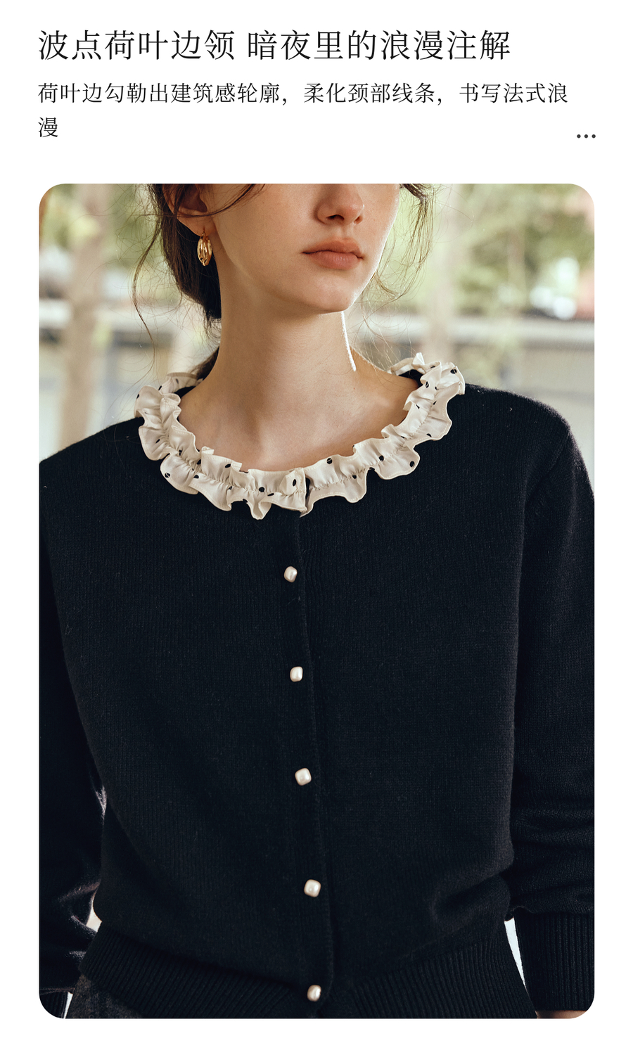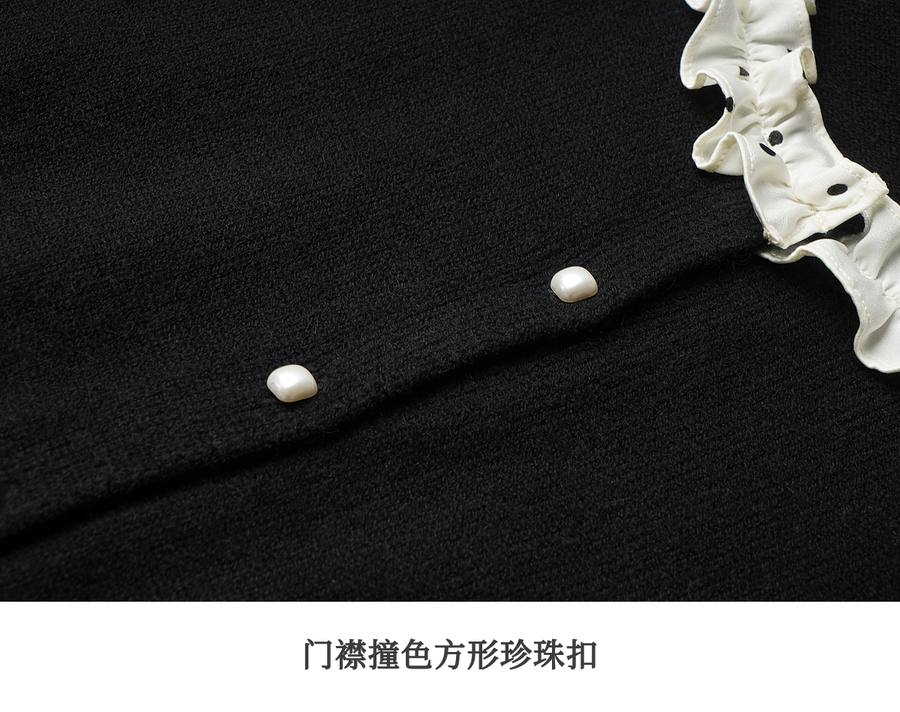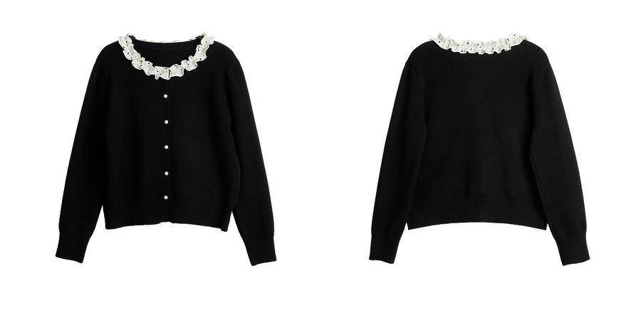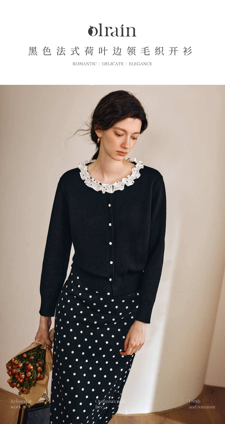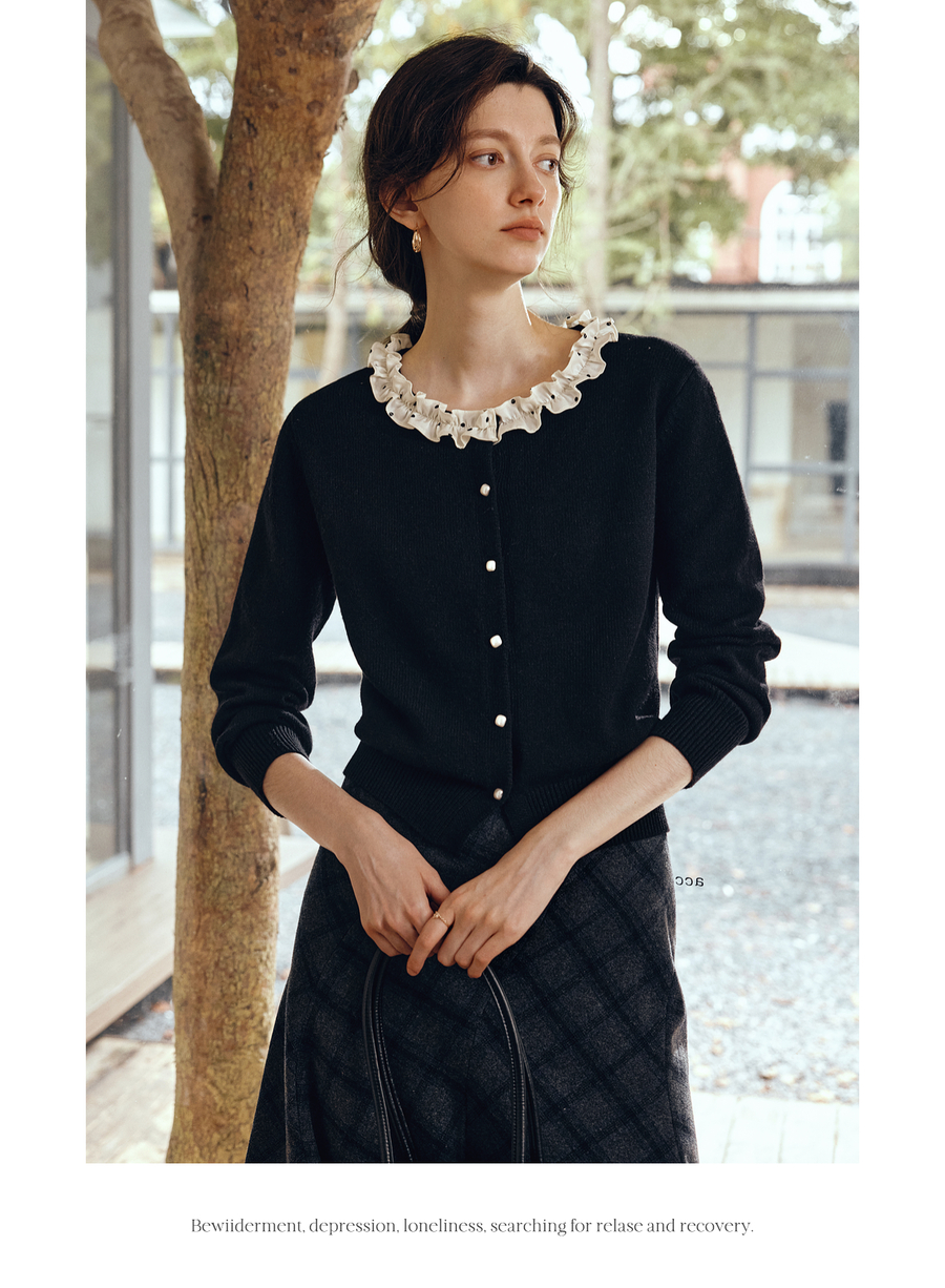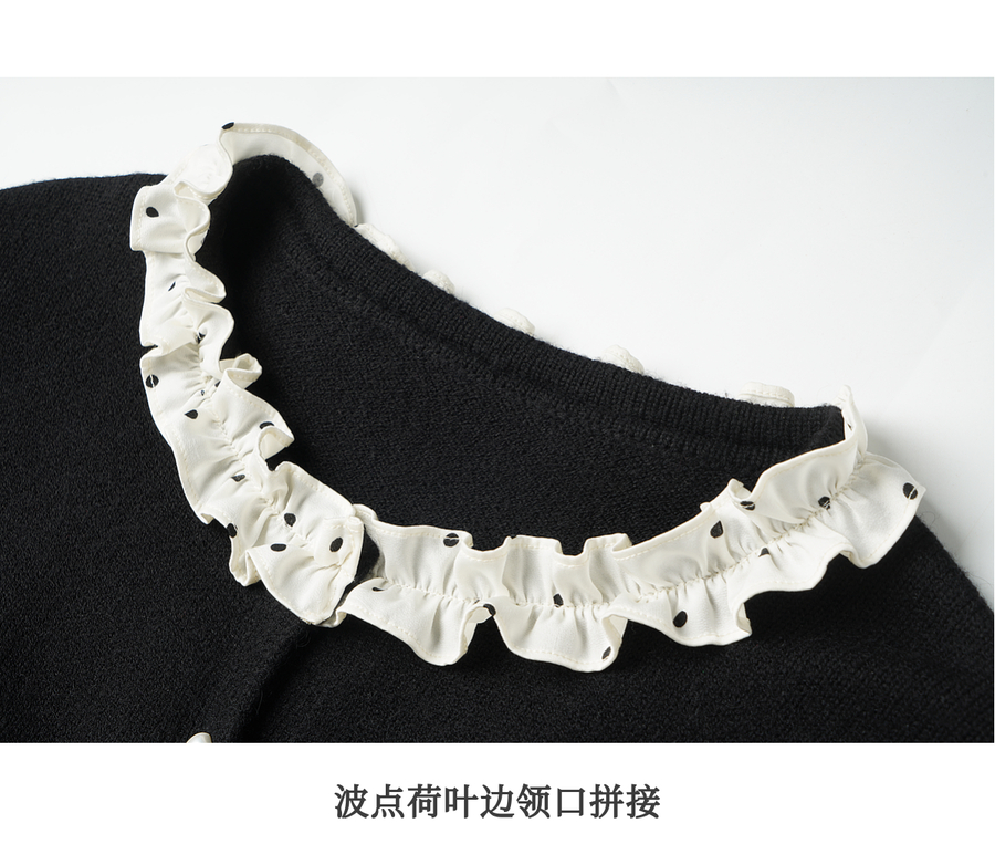 OLrain欧芮儿2025新款女秋季黑色法式荷叶边领毛织开衫精致针织衫