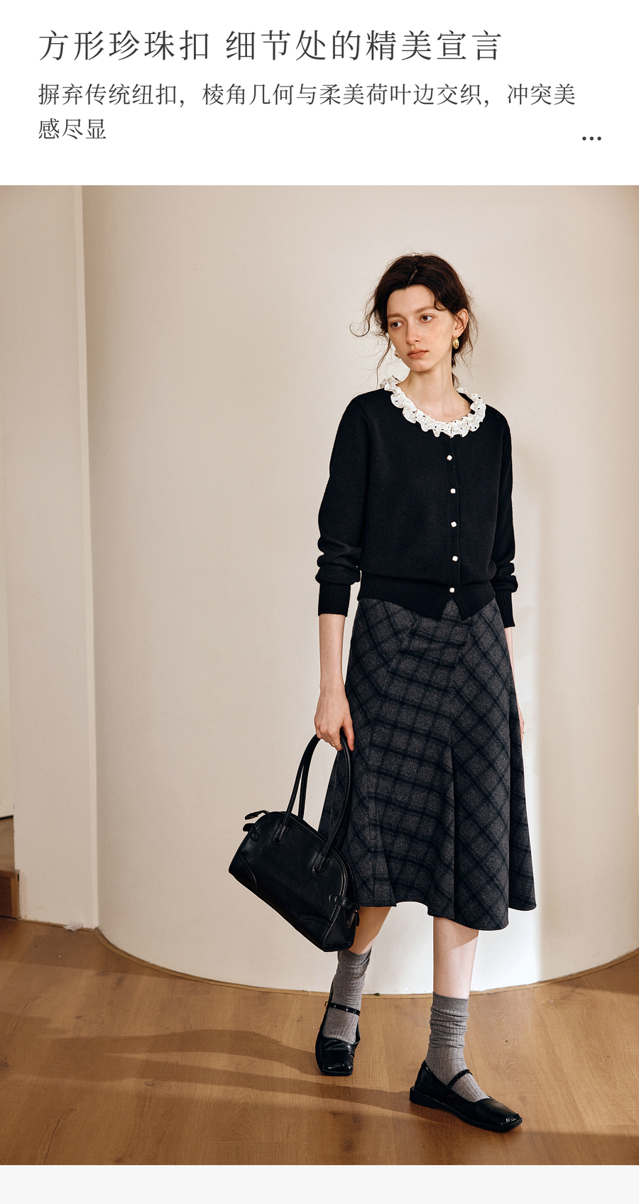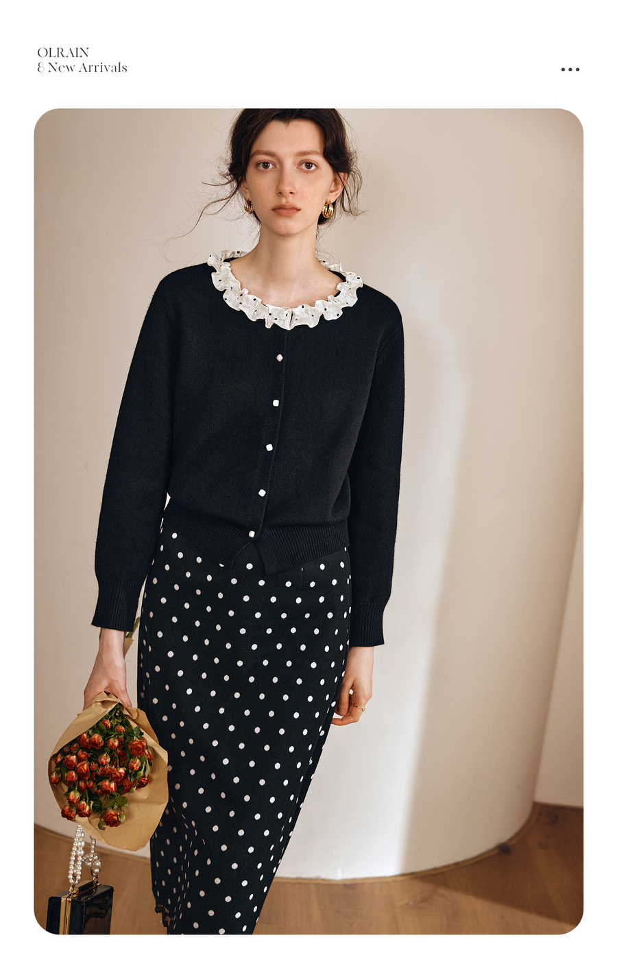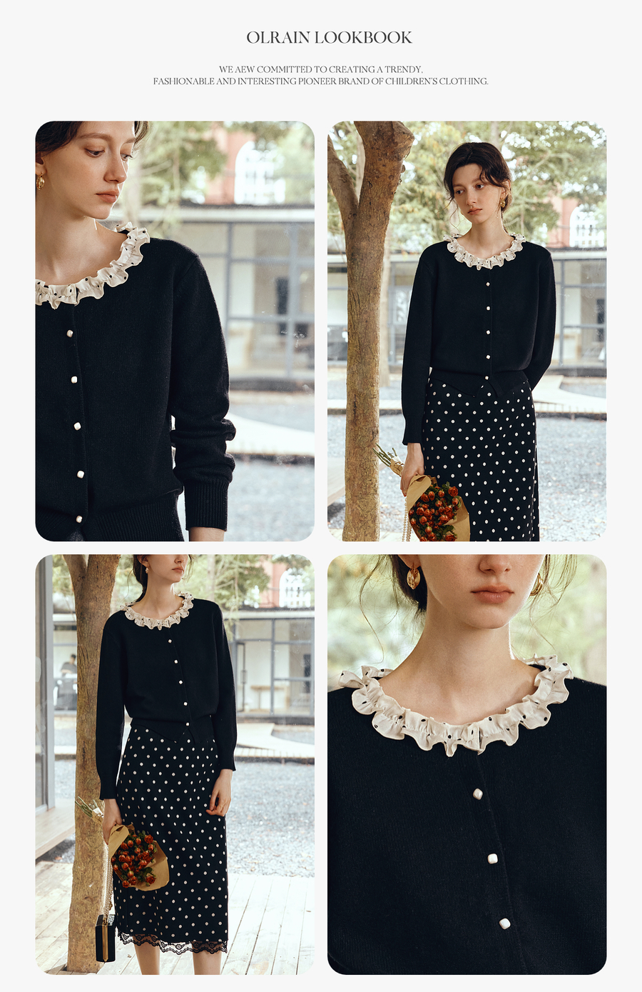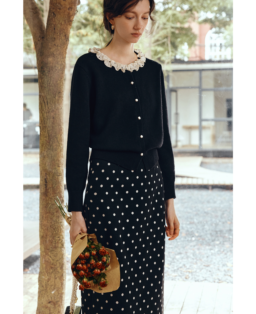 OLrain欧芮儿2025新款女秋季黑色法式荷叶边领毛织开衫精致针织衫