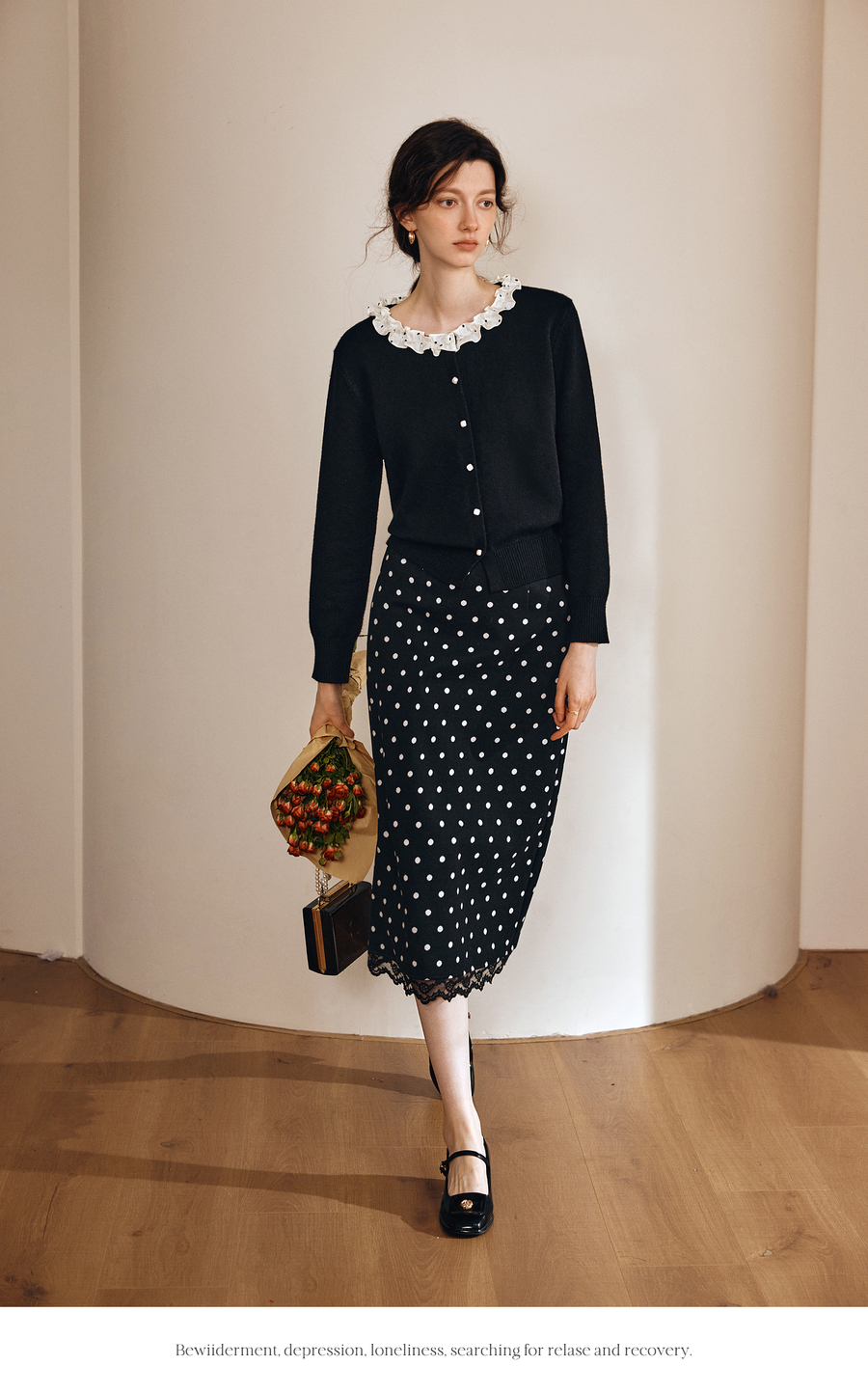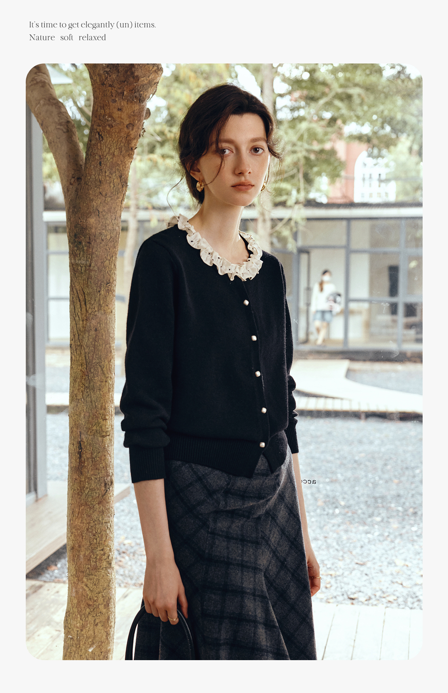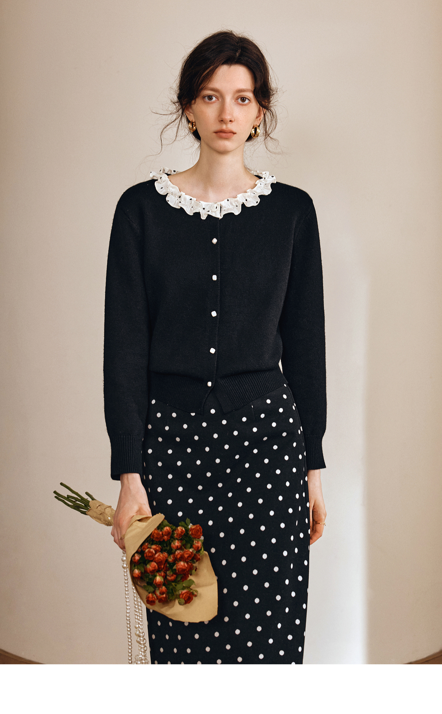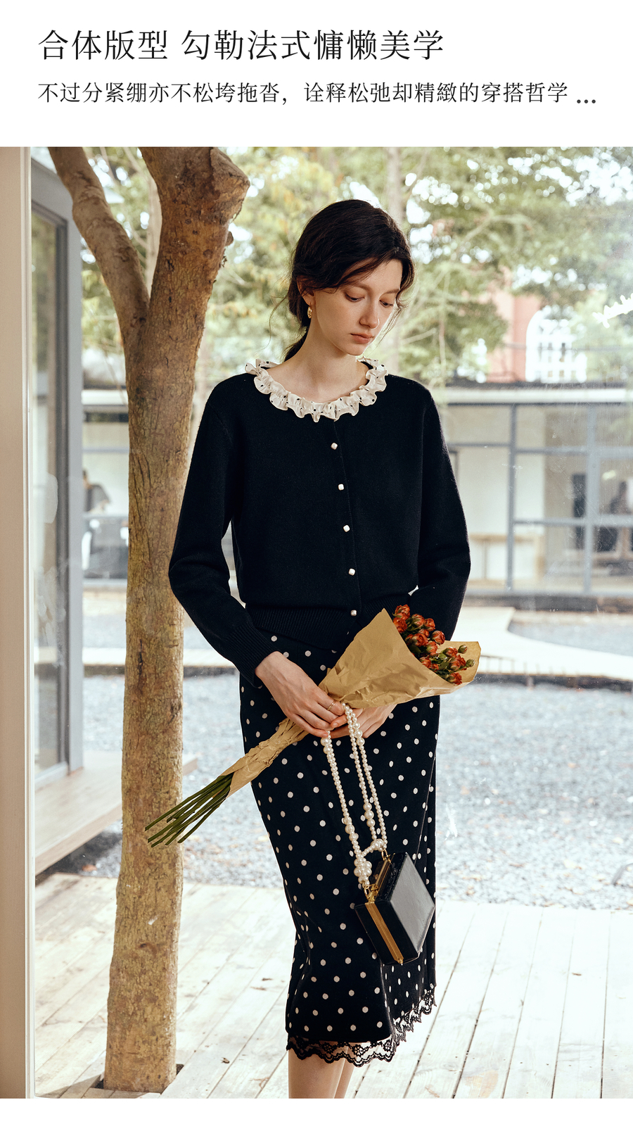OLrain欧芮儿2025新款女秋季黑色法式荷叶边领毛织开衫精致针织衫