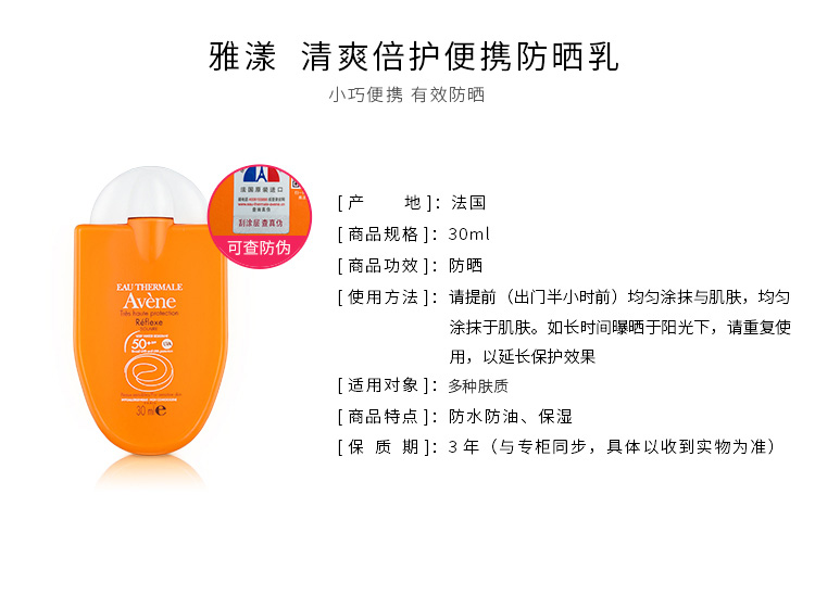 avene雅漾防晒小金刚清爽倍护便携防晒乳霜SPF50+PA+++ 30ml面部JPY带授权招加盟代理