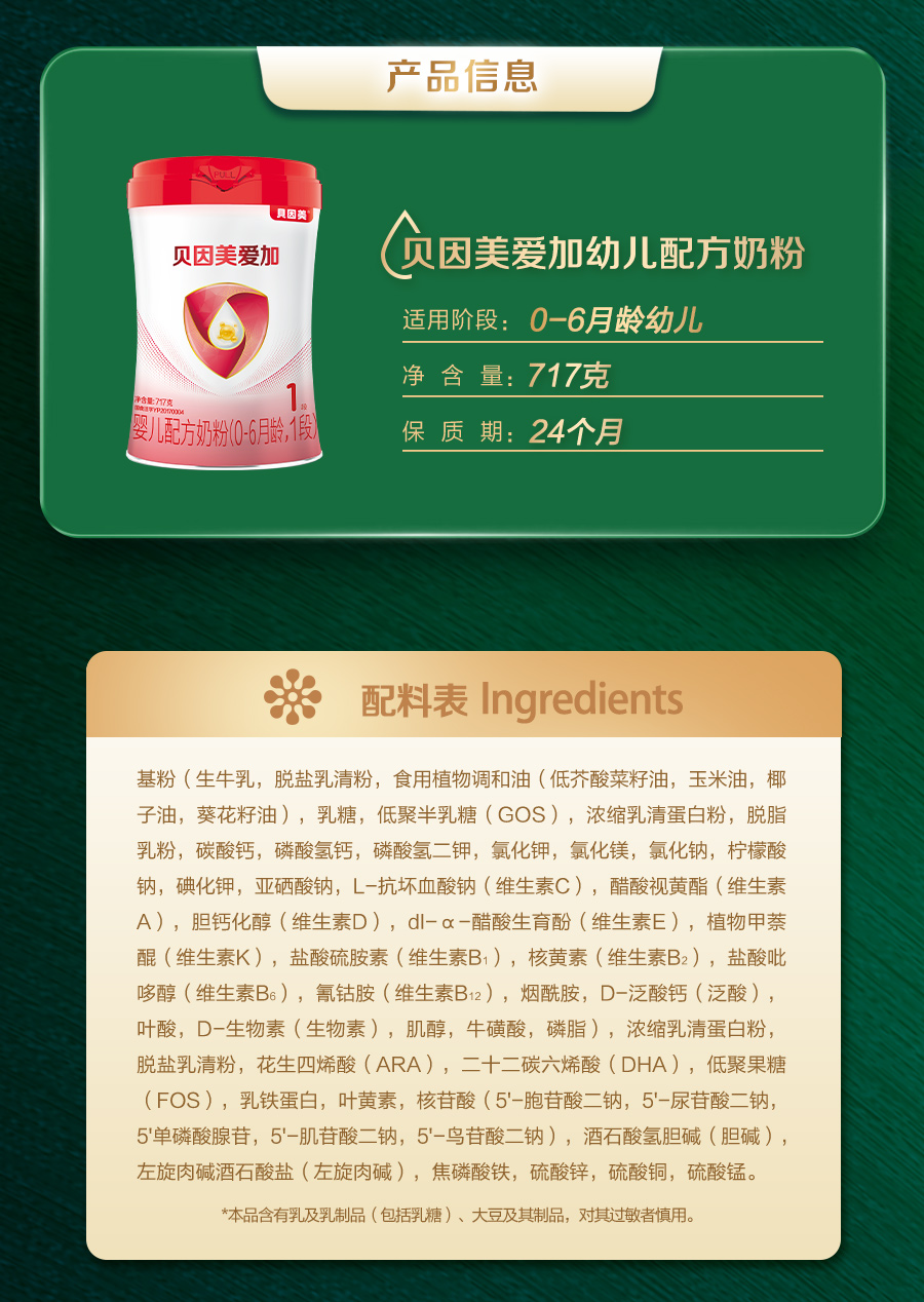 贝因美爱加有机A2婴儿配方奶粉(0-6月龄,1段)717克