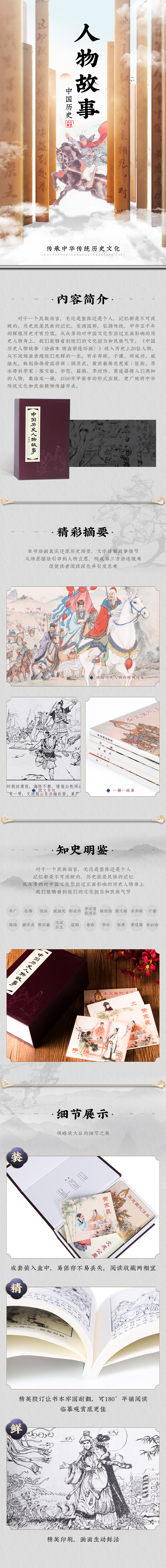 《中国历史人物故事(红皮书系列 套装共20册)》有辛弃疾、于谦、郑成功、戚继光、林则徐等爱国将领;顾炎武、黄宗羲等思想家;张衡、李冰等科学家;蔡文姬、扁鹊、李时珍、黄道婆等人们熟知的人物,集结成一册,以60开平装本的形式出版,更广地将中华传统文化和民族精神传播开去。