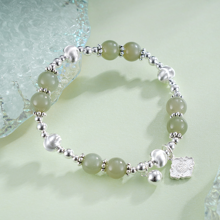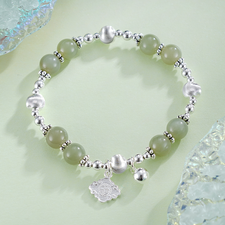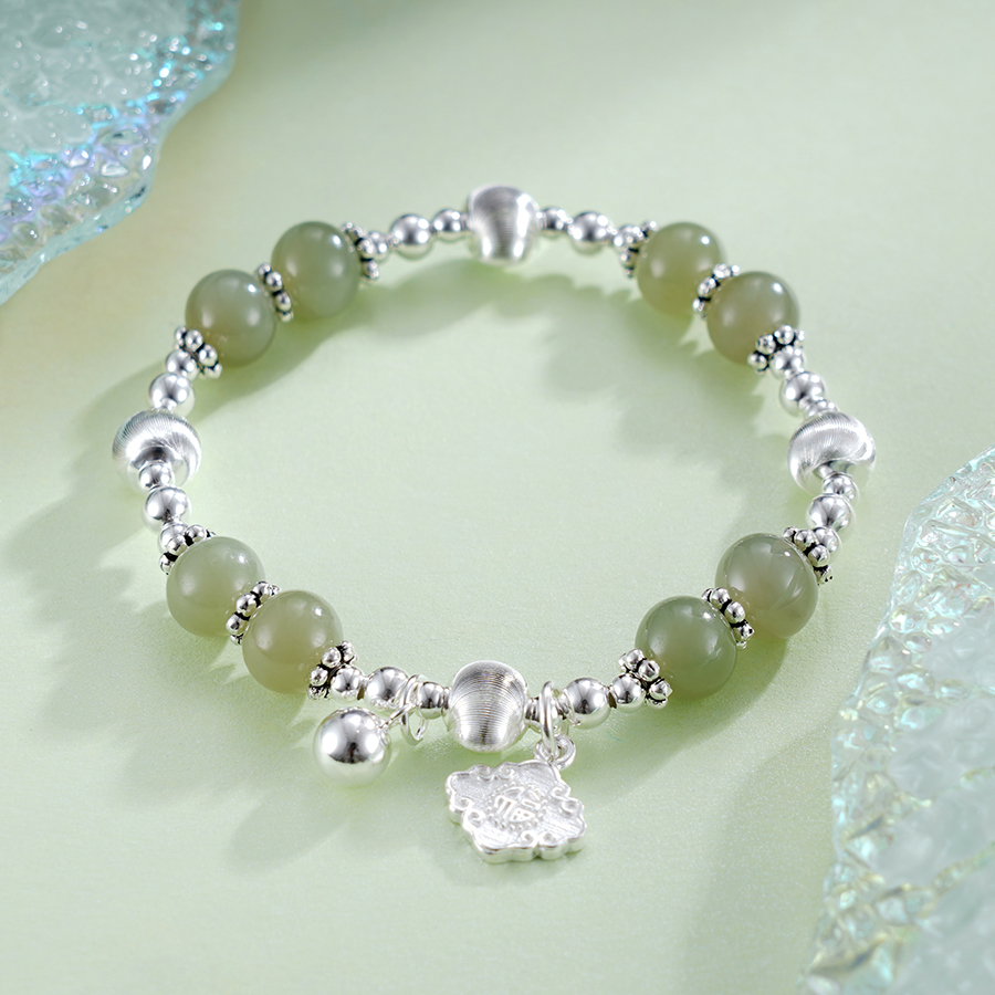 【寓意】:细腻圆润的银珠手串,间隔点缀着青玉,形成独特韵律之美。翠色欲滴,尽显高雅韵味。
