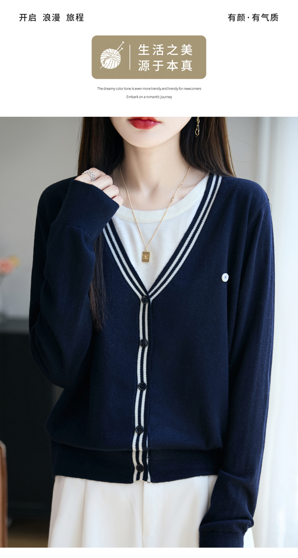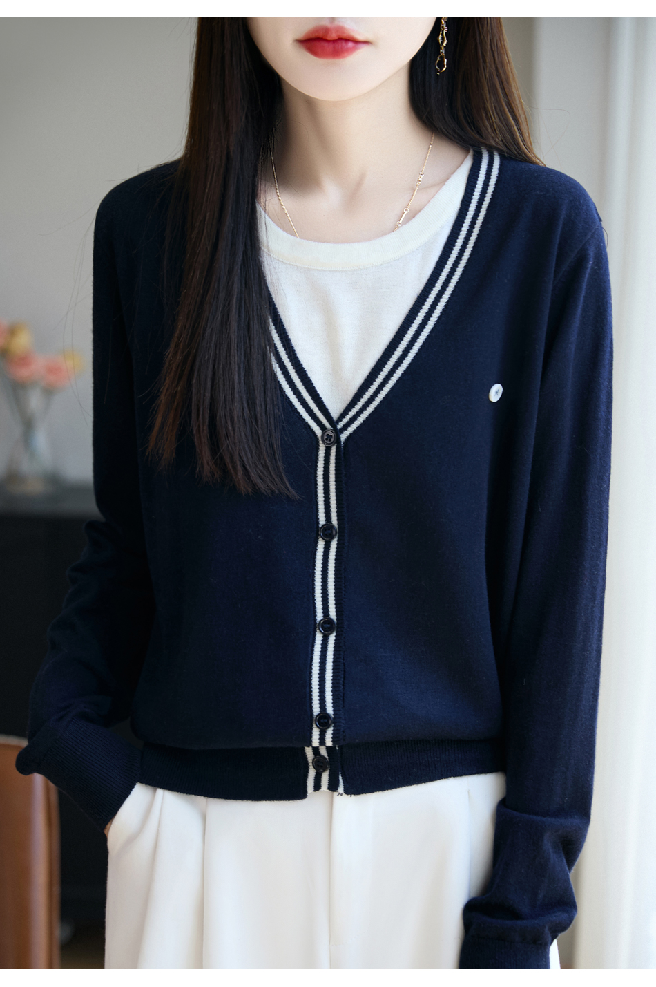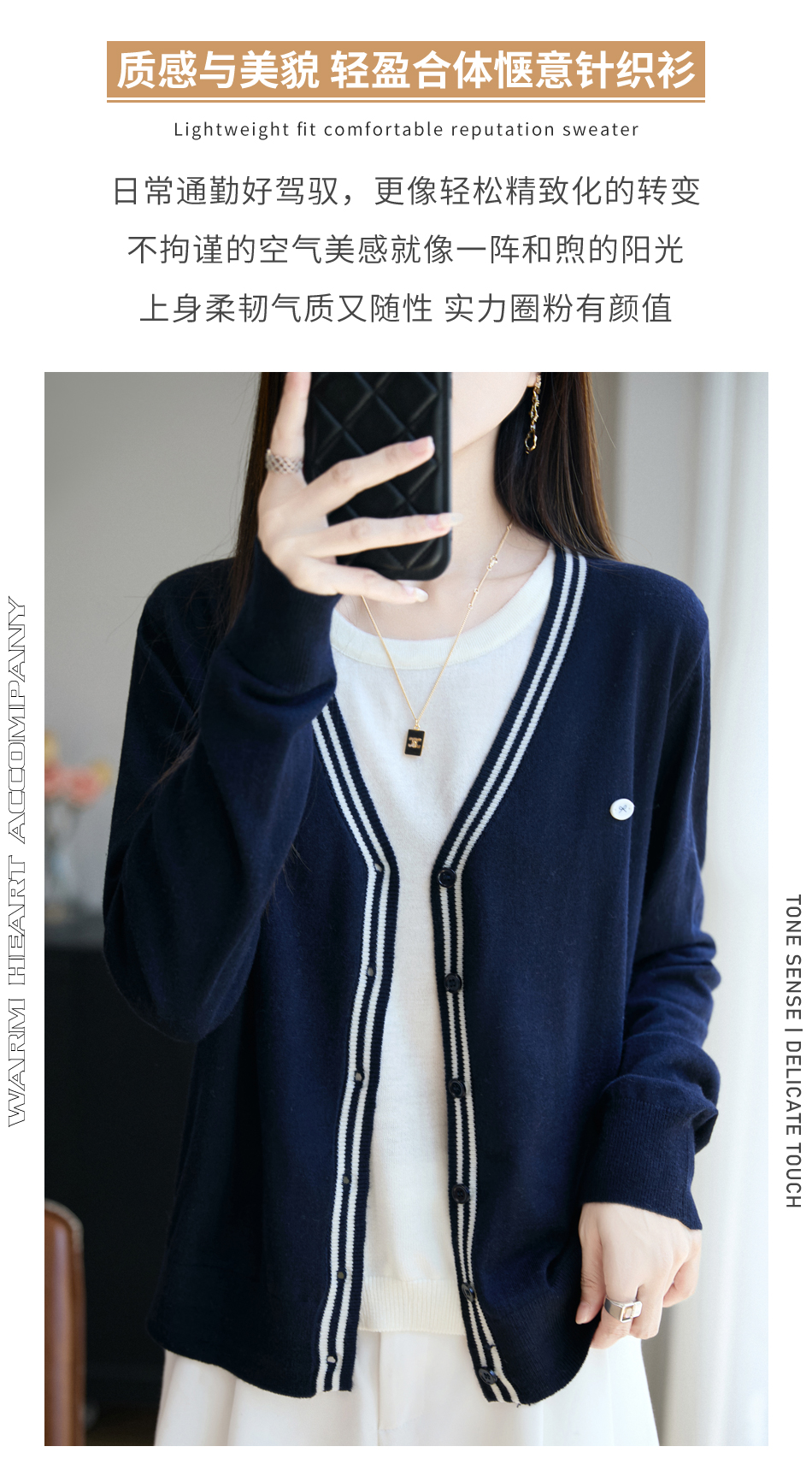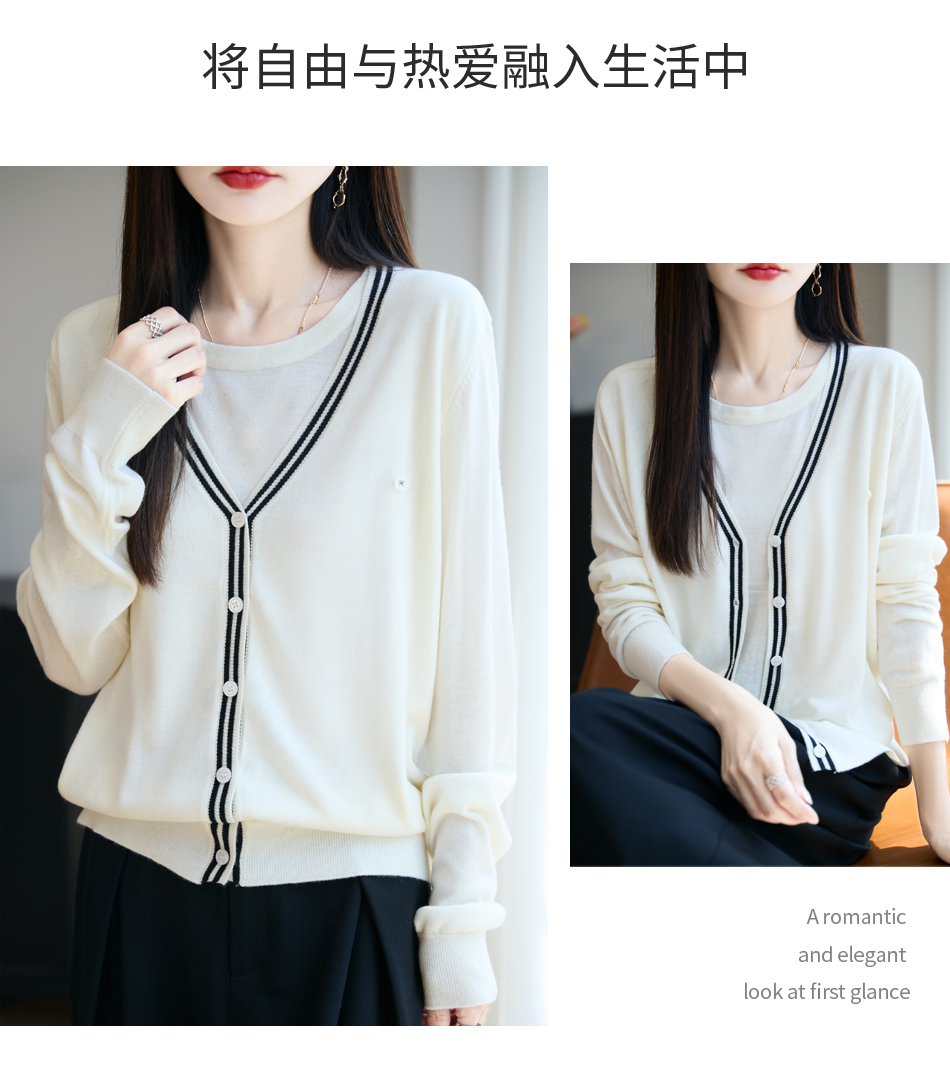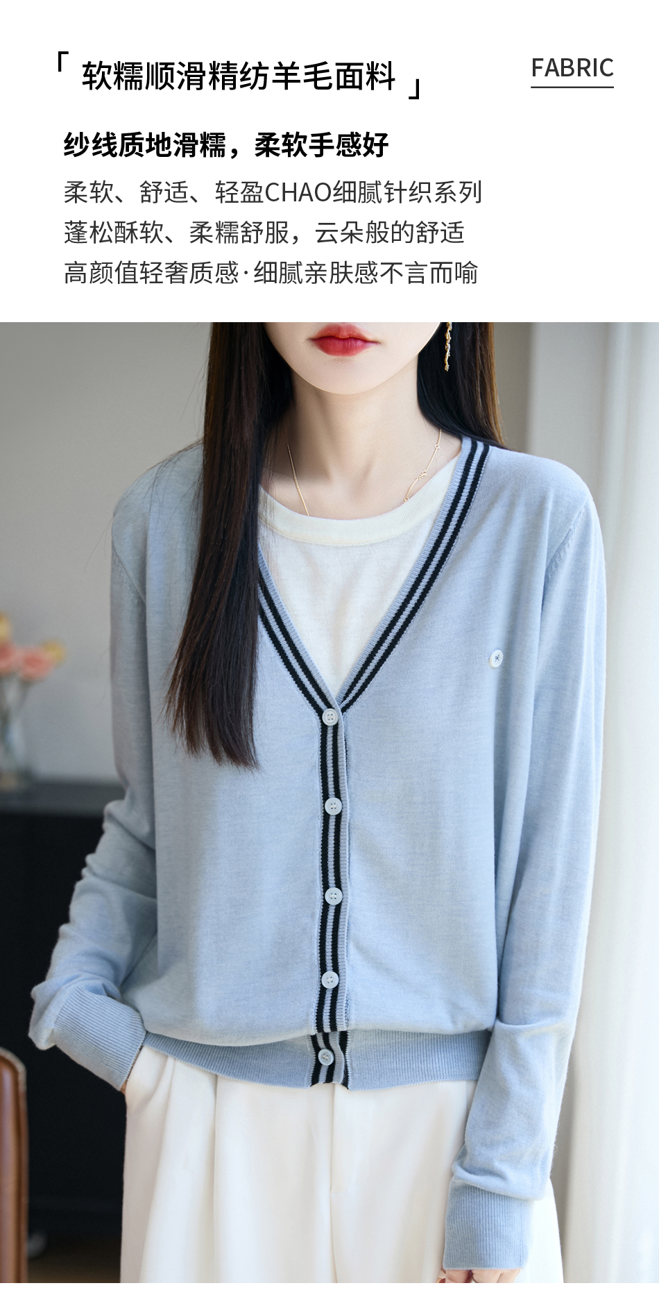 【名称】:青乔慕染精纺条纹边V领假两件开衫CM206