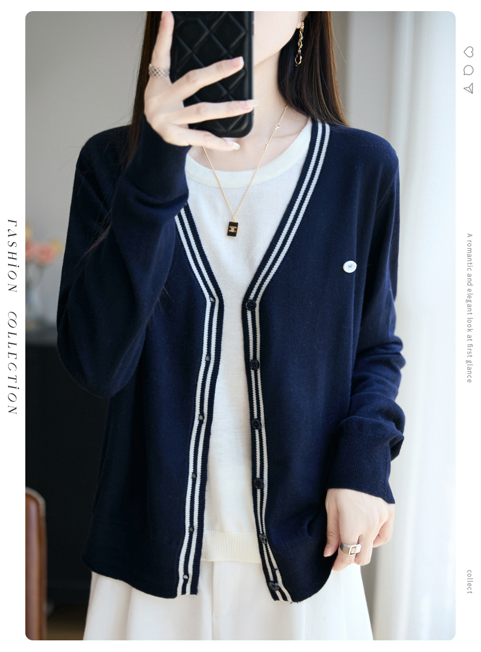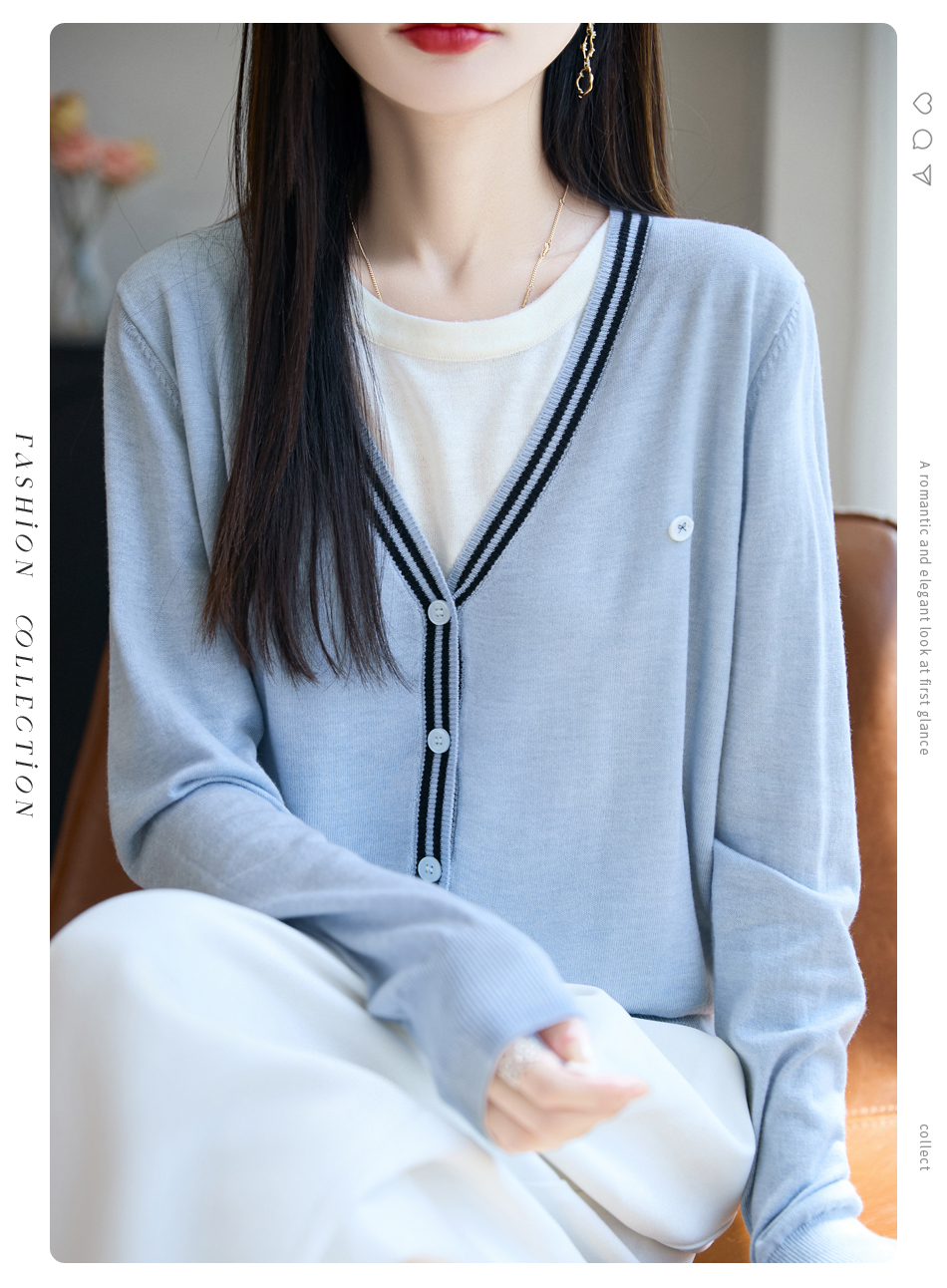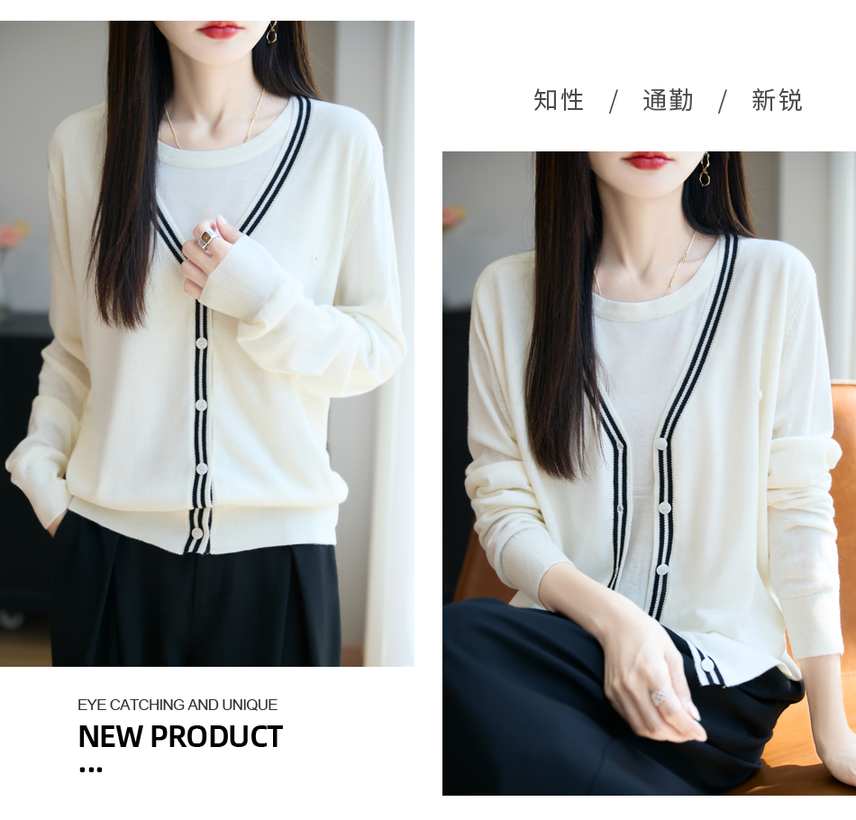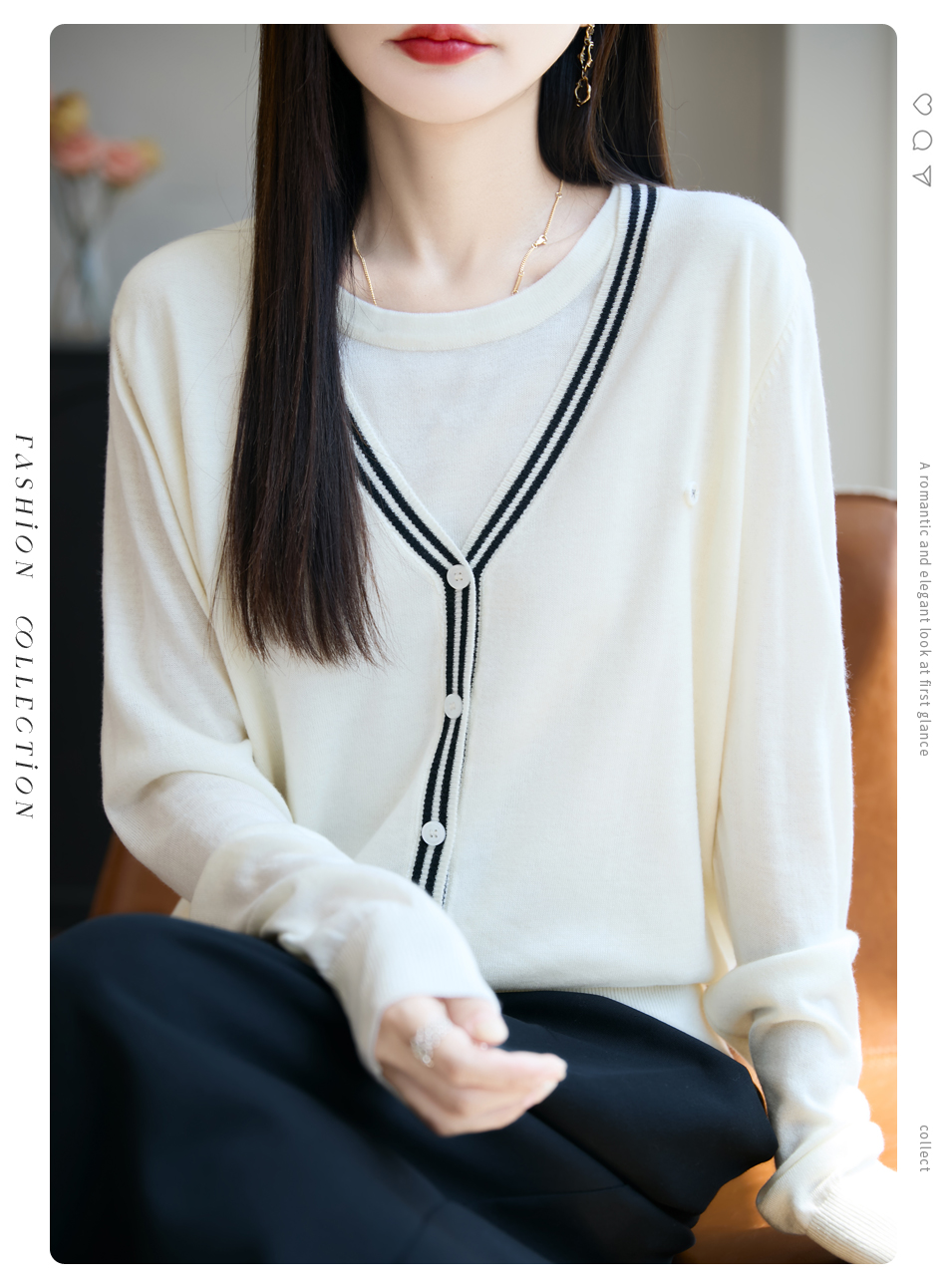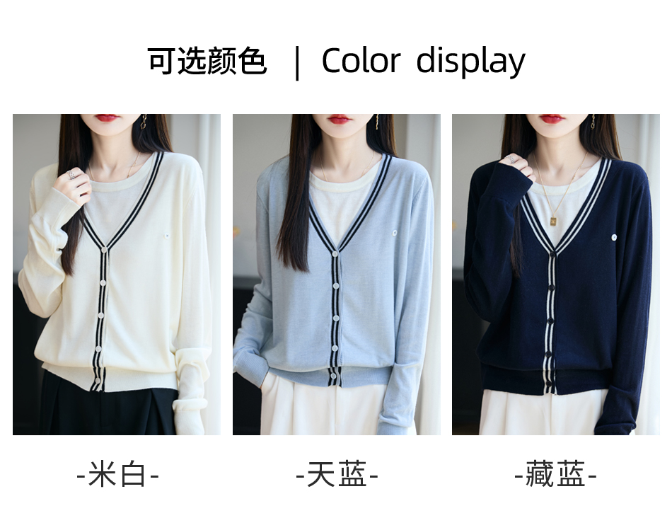 【名称】:青乔慕染精纺条纹边V领假两件开衫CM206