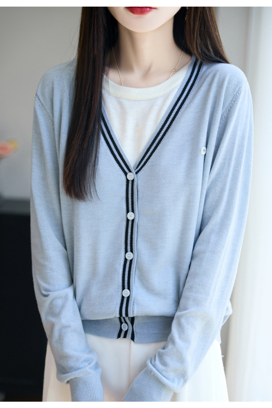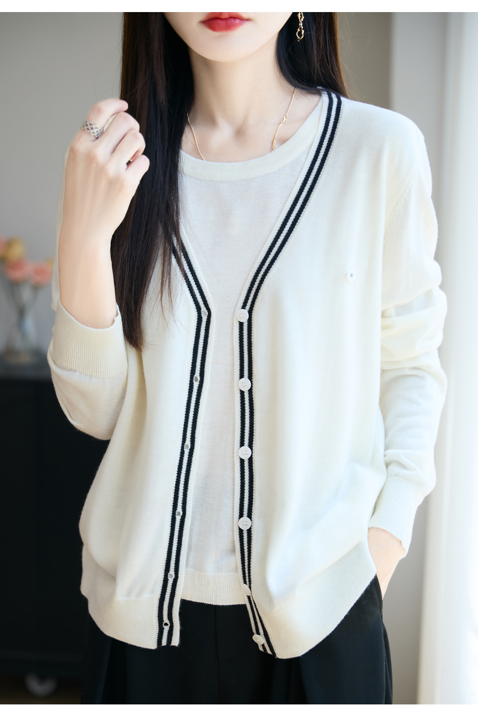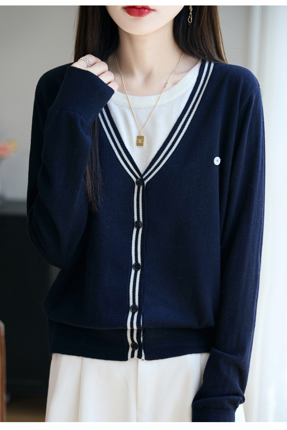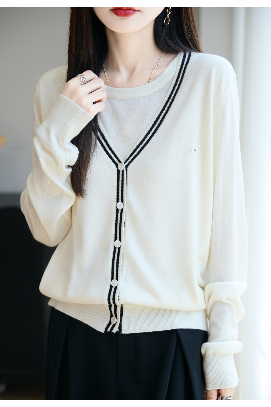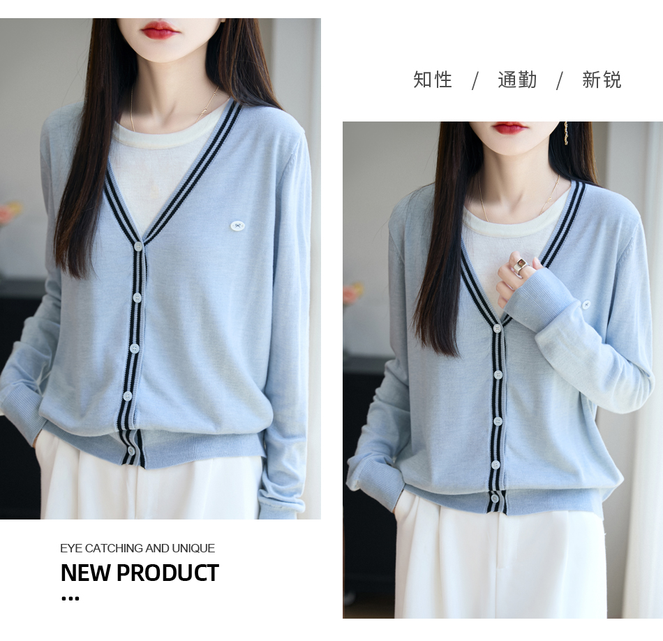 【名称】:青乔慕染精纺条纹边V领假两件开衫CM206