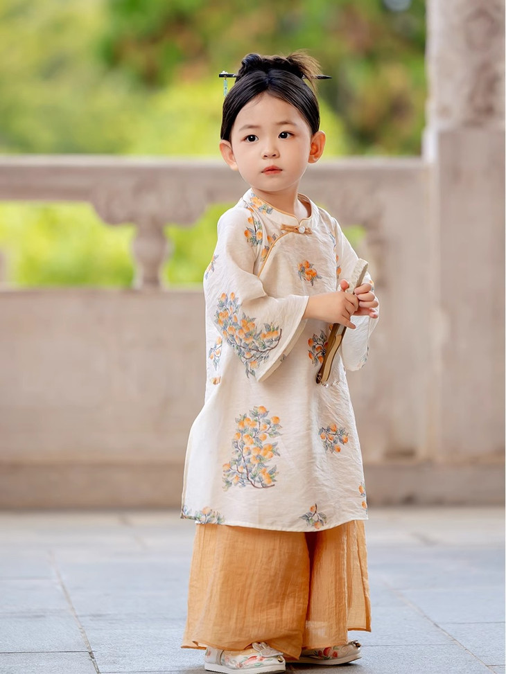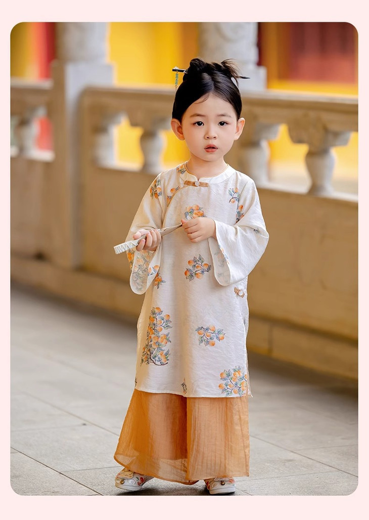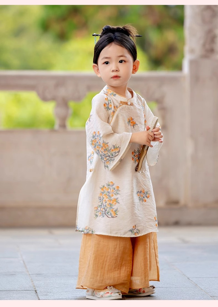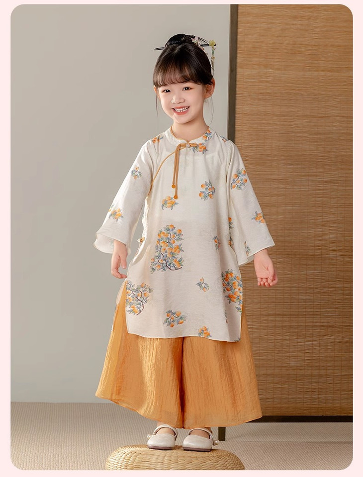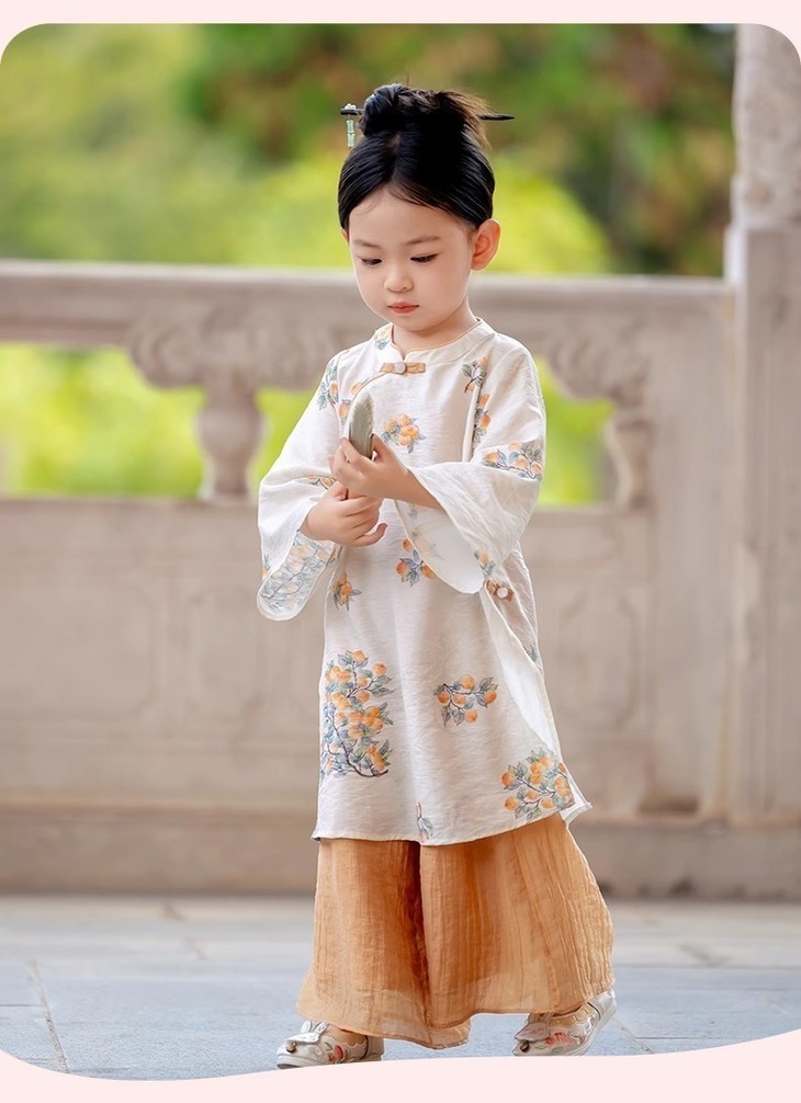 第一款:[米色黄果子] 非常有少女朝气 采用了黄色为主色调 这种清新的颜色给人温暖又自然的感觉 与小朋友的纯真可爱真是绝配! 衣服上的花朵以淡雅的色彩表现 让整件衣服充满生机与活力 同时也融入了现代审美和实用性考虑 让穿着展现古典韵味的同时 也能够感受到舒适与时尚。
