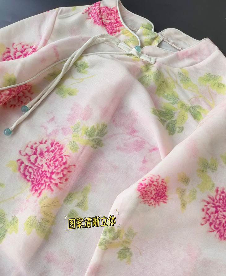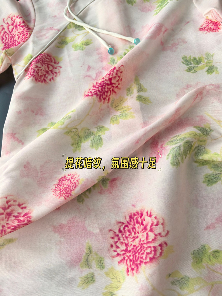 第二款[粉色团花] 非常有少女朝气 太适合春游赏花拍照穿了 颜色上做了米色+粉色设计 整套采用了上衣+下裙的设计 高清印花的图案,点缀了你的衣身 裙面高开叉的设计是灵魂 随便转个圈圈都是移不开眼的美丽