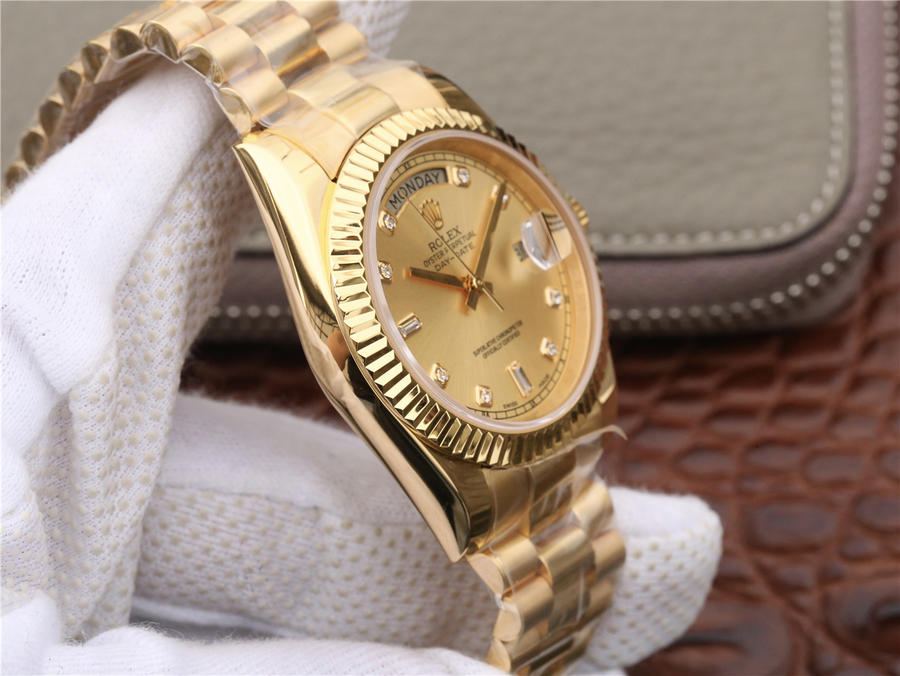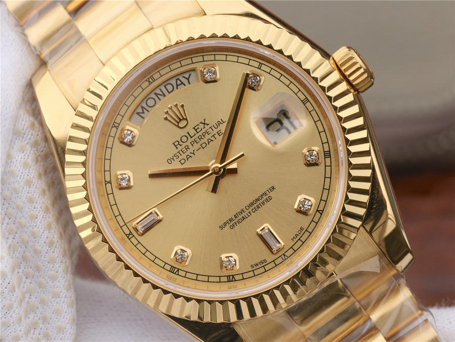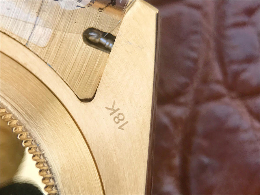 CR劳力士星期日历型218238男士手表。41毫米直径,颠覆以往传统工艺!一:904L精钢。二:18厚金部分采用台湾最新铸金技术,永久不褪色,比市场一般的"包金"耐用三倍以上(铸金:一种使金层和精钢粘合度更加紧密的新技术,又叫电铸,市场不太懂的人叫镀K)。三:真夹板3255机芯(假夹板的隐患:假钻和假齿轮容易脱落,卡死,导致机芯偷停损坏)。机芯调时方向与正品一致,(市面上的仿机调时是大拇指往下拉,长荣星期日历型是大拇指往上推)。四:1表1号表壳内影与吊牌和保证卡号码全部一致。配长荣防伪和包装