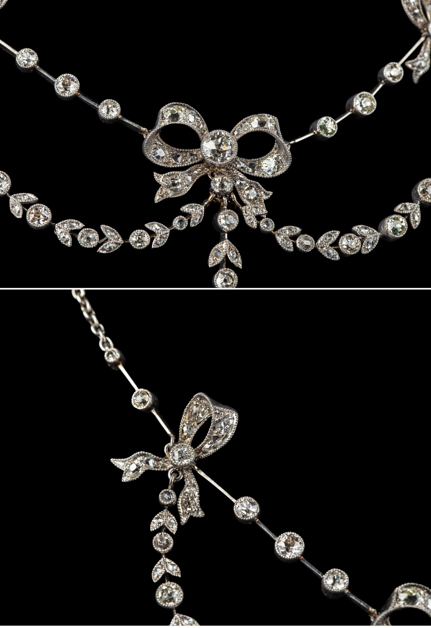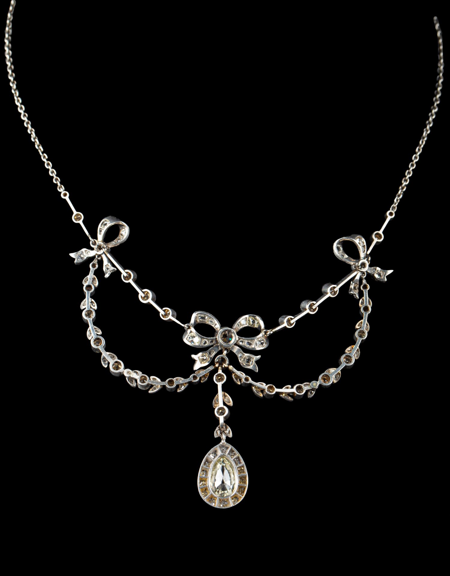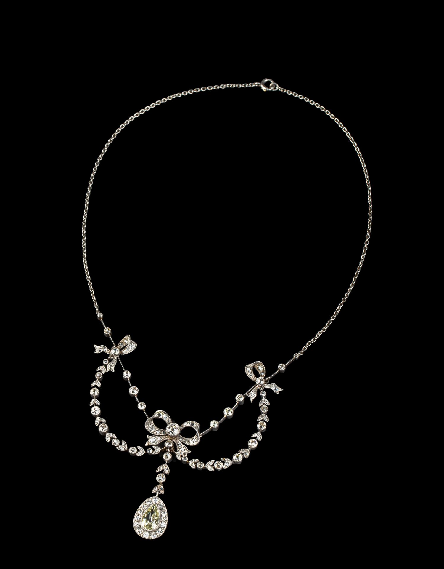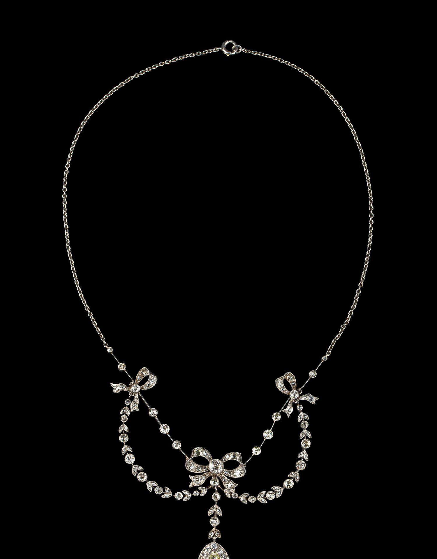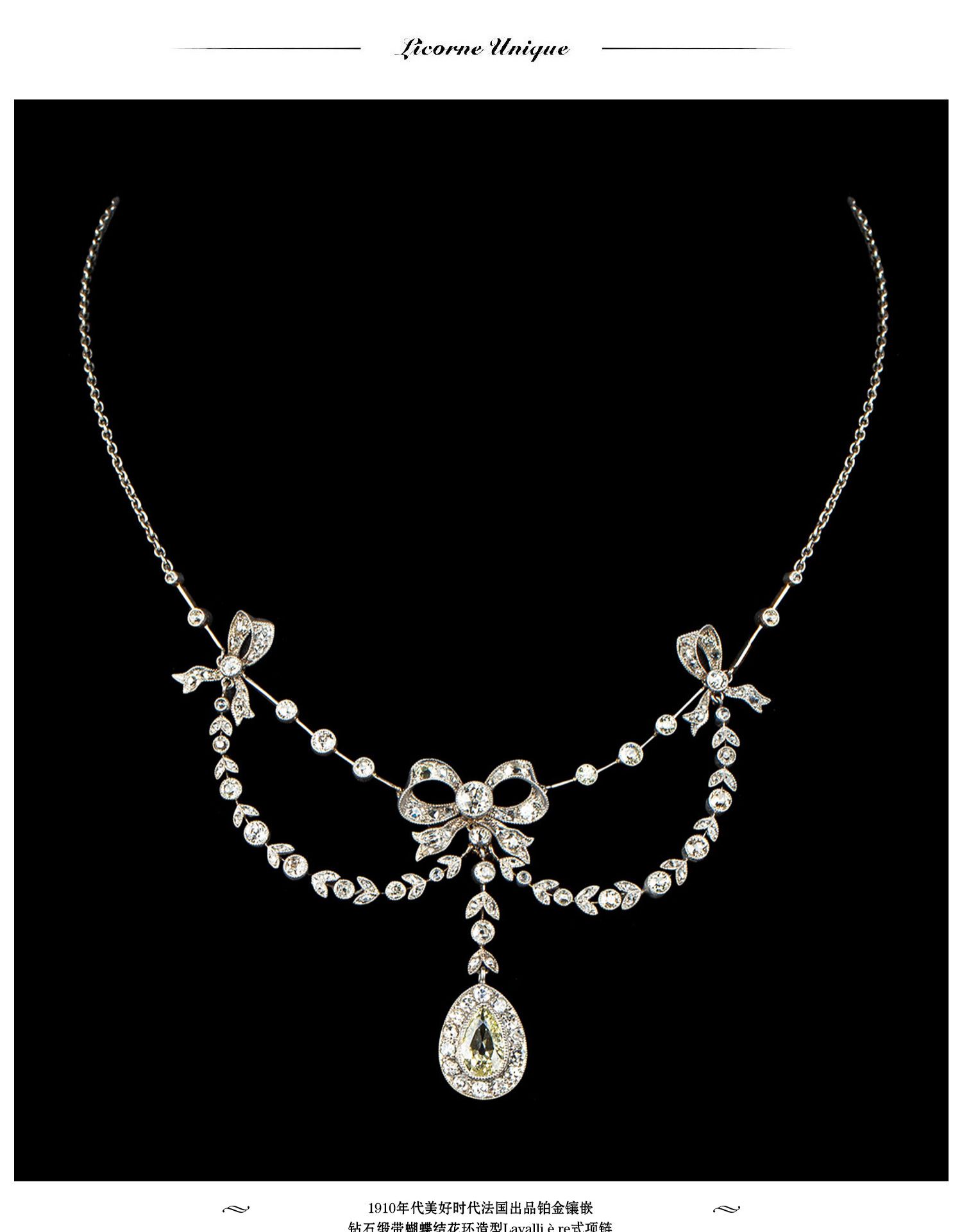 独角鹿西洋古董珠宝首饰美好时代铂金镶嵌钻石缎带蝴蝶结花环项链