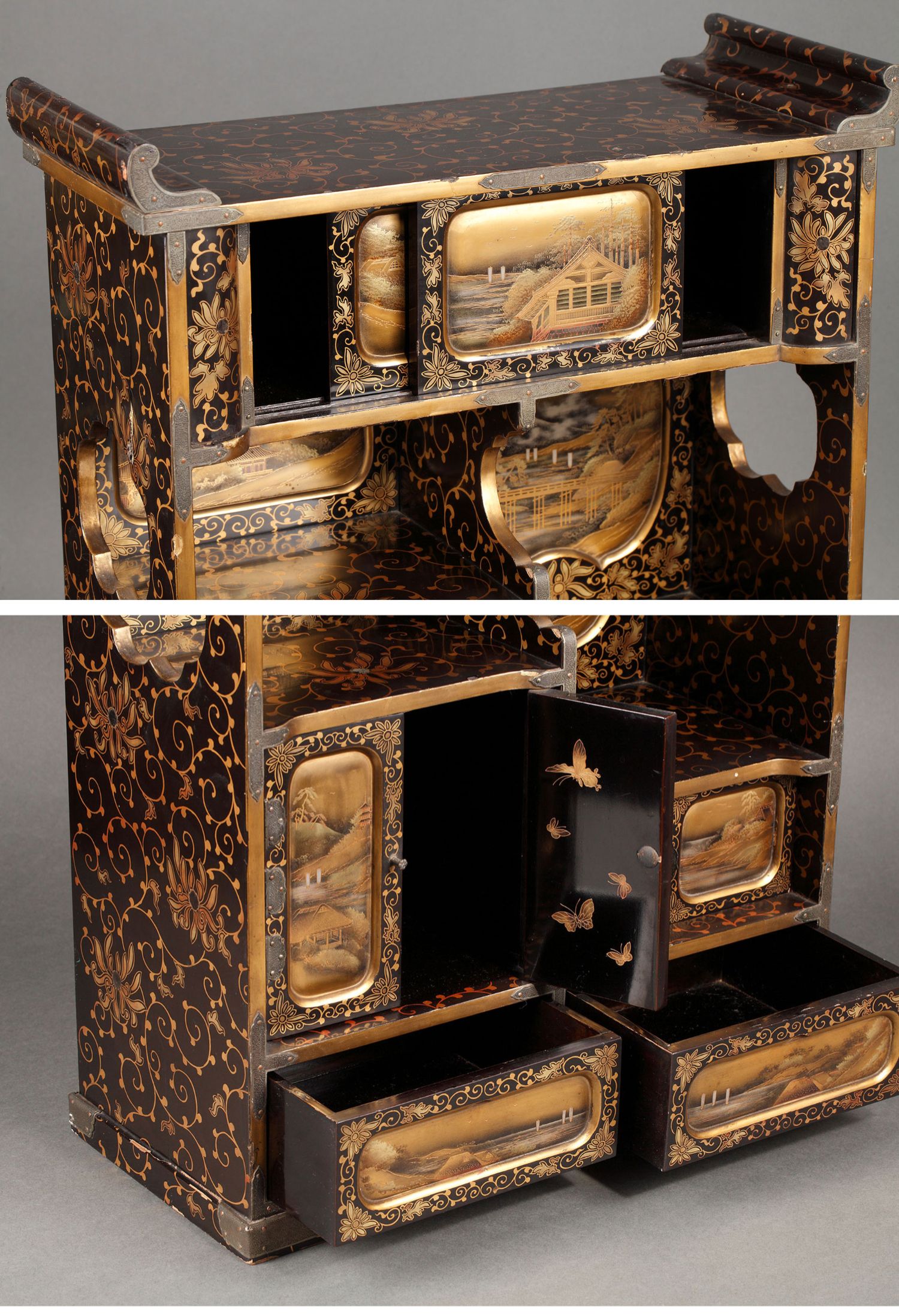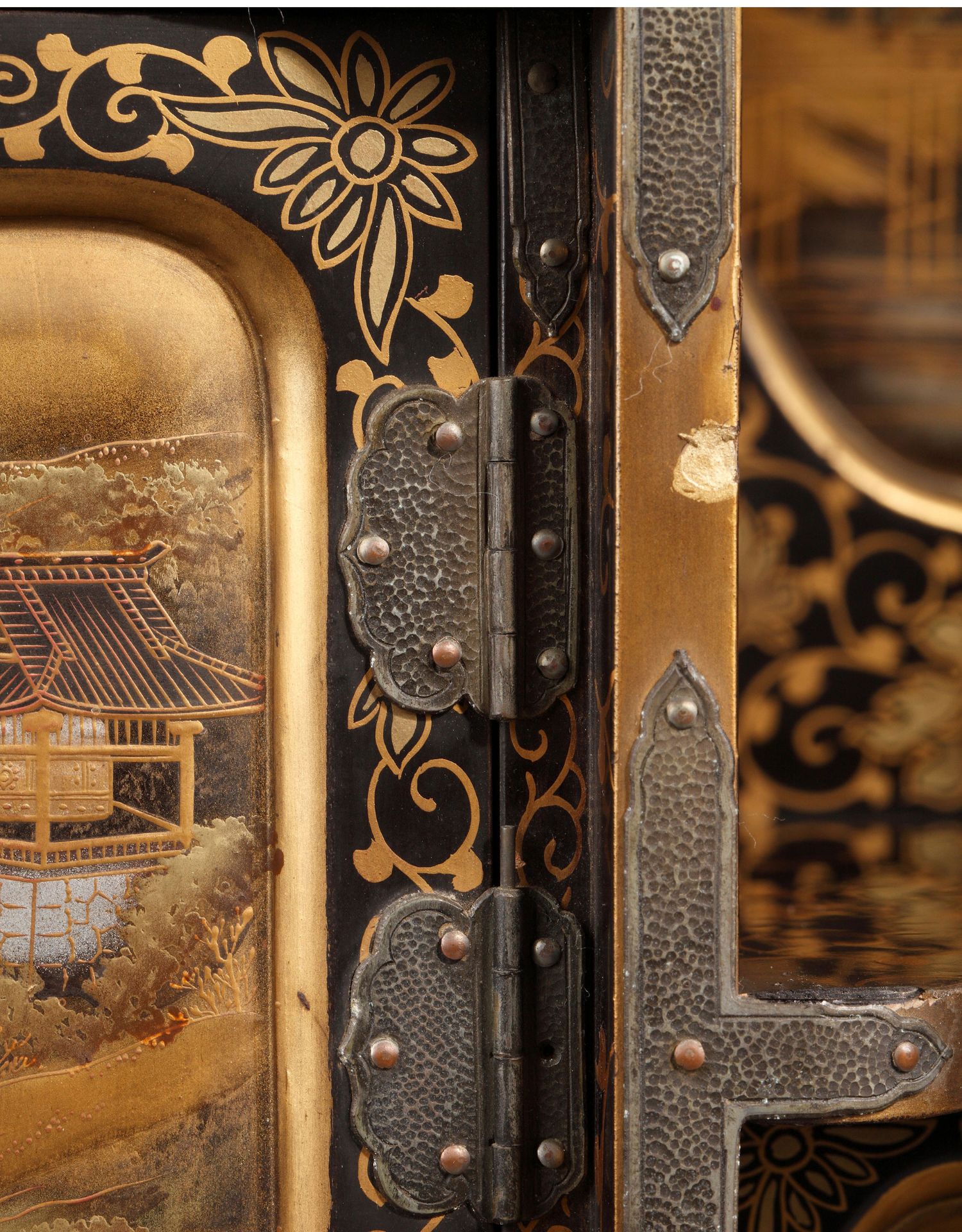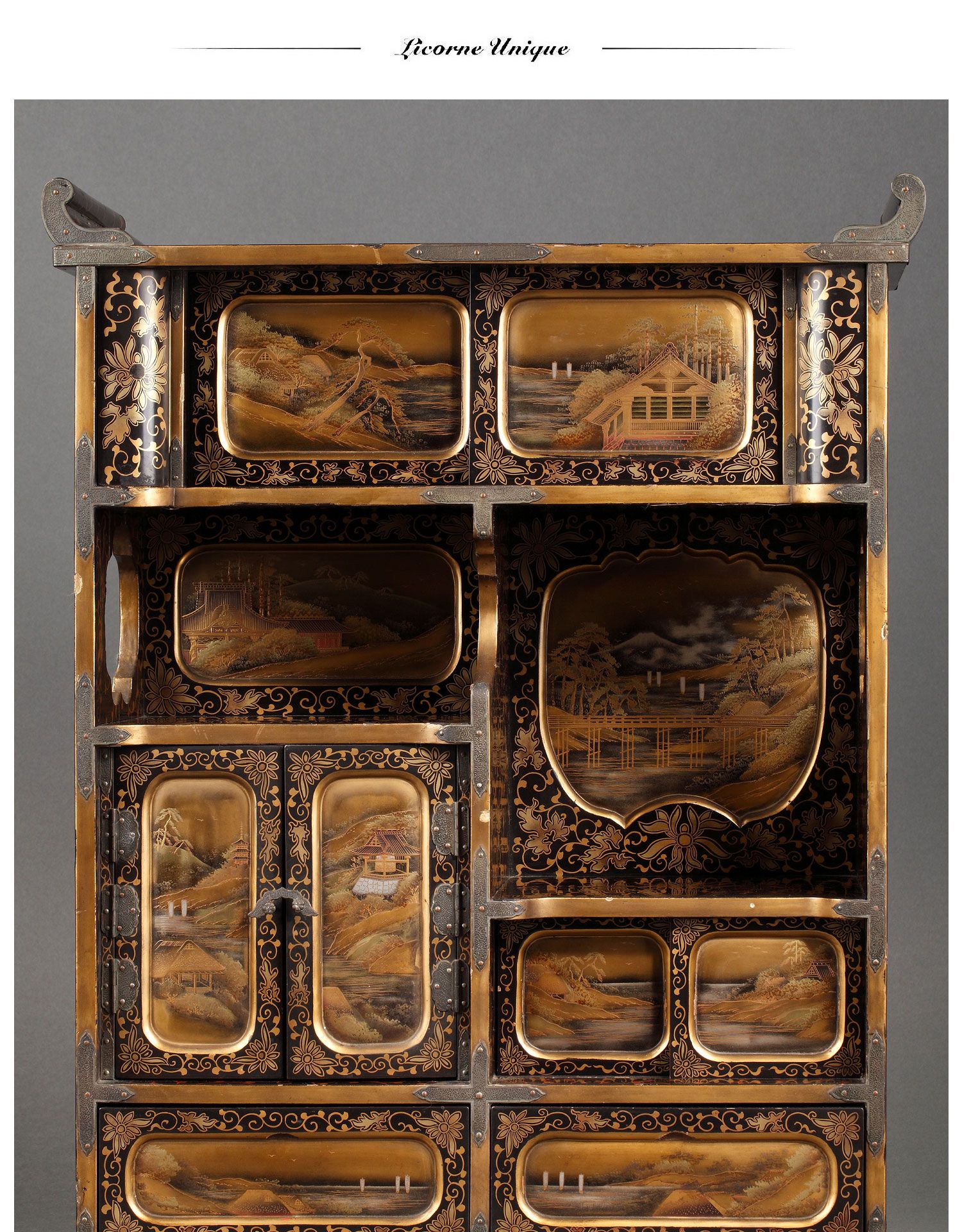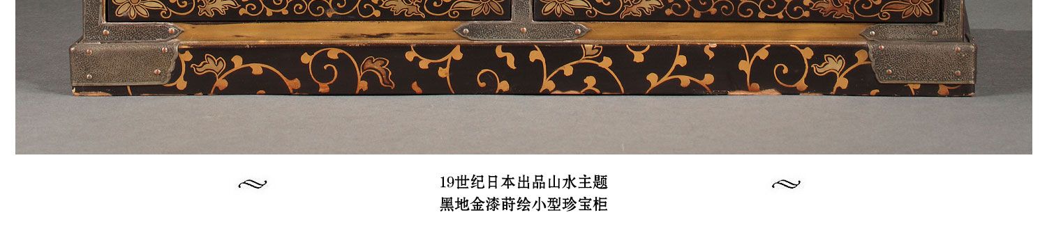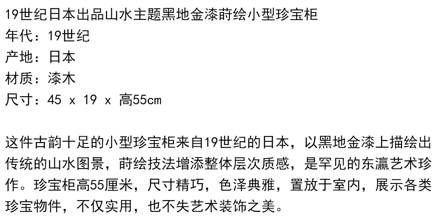 独角鹿西洋古董19世纪日本山水主题黑地金漆莳绘小型珍宝柜置物柜