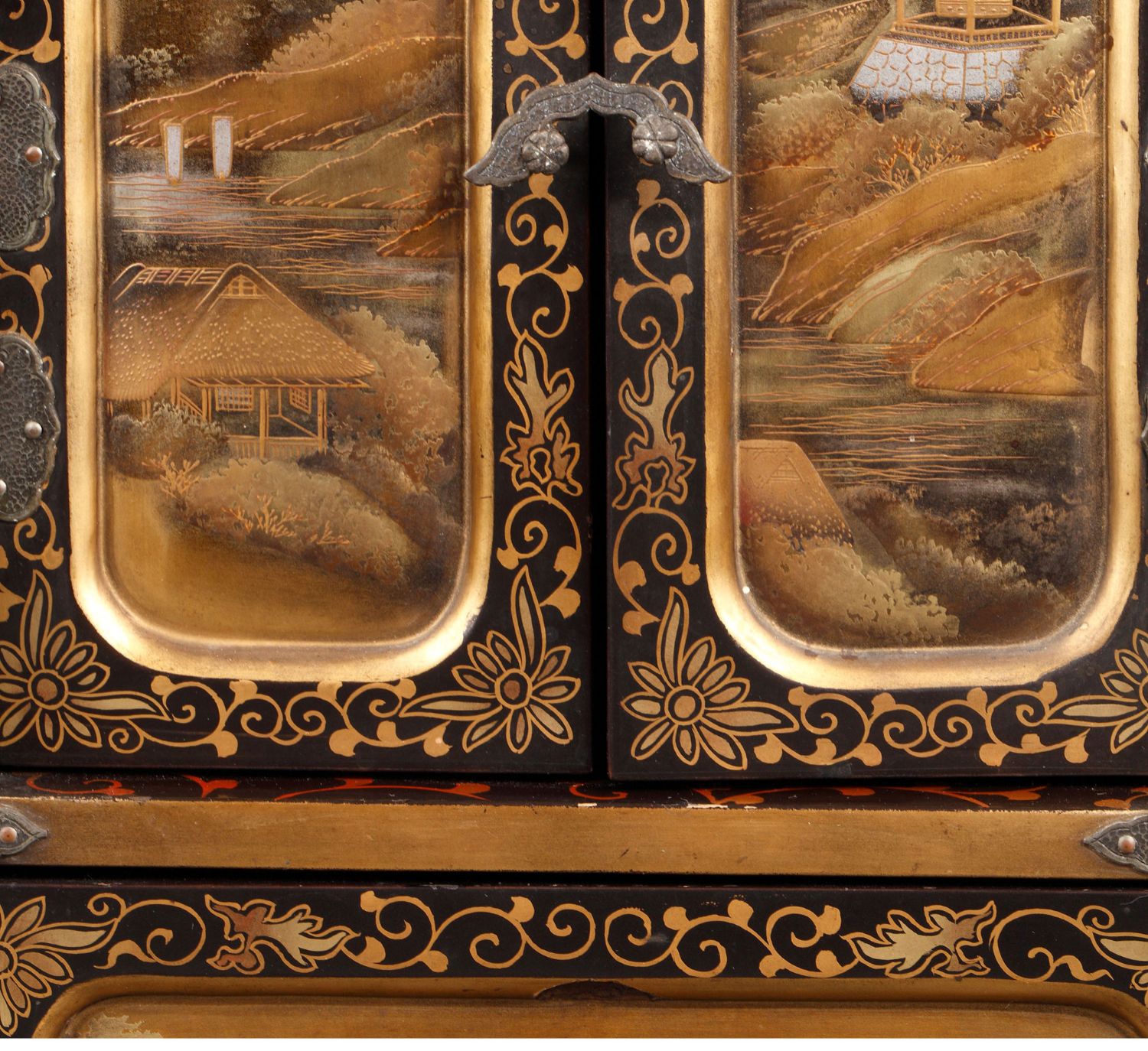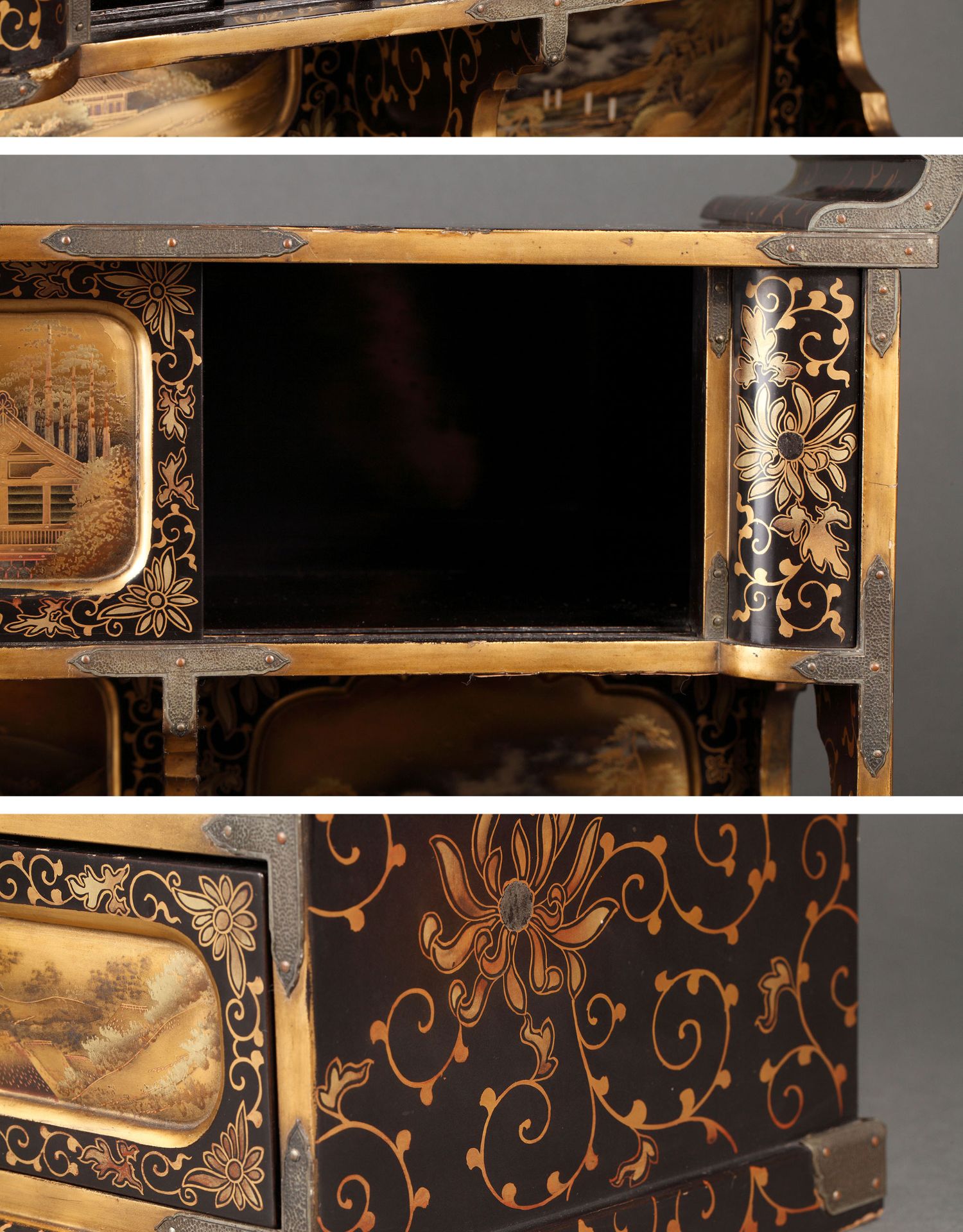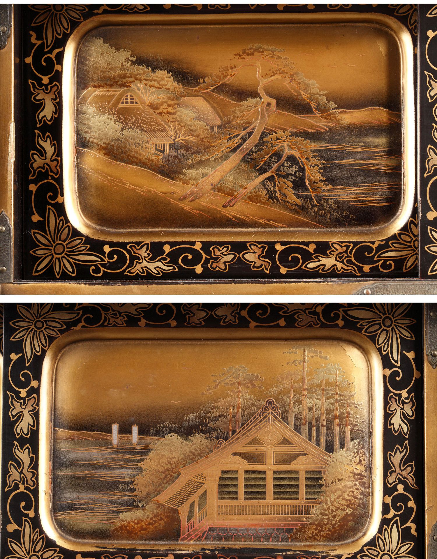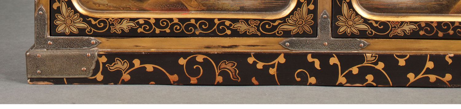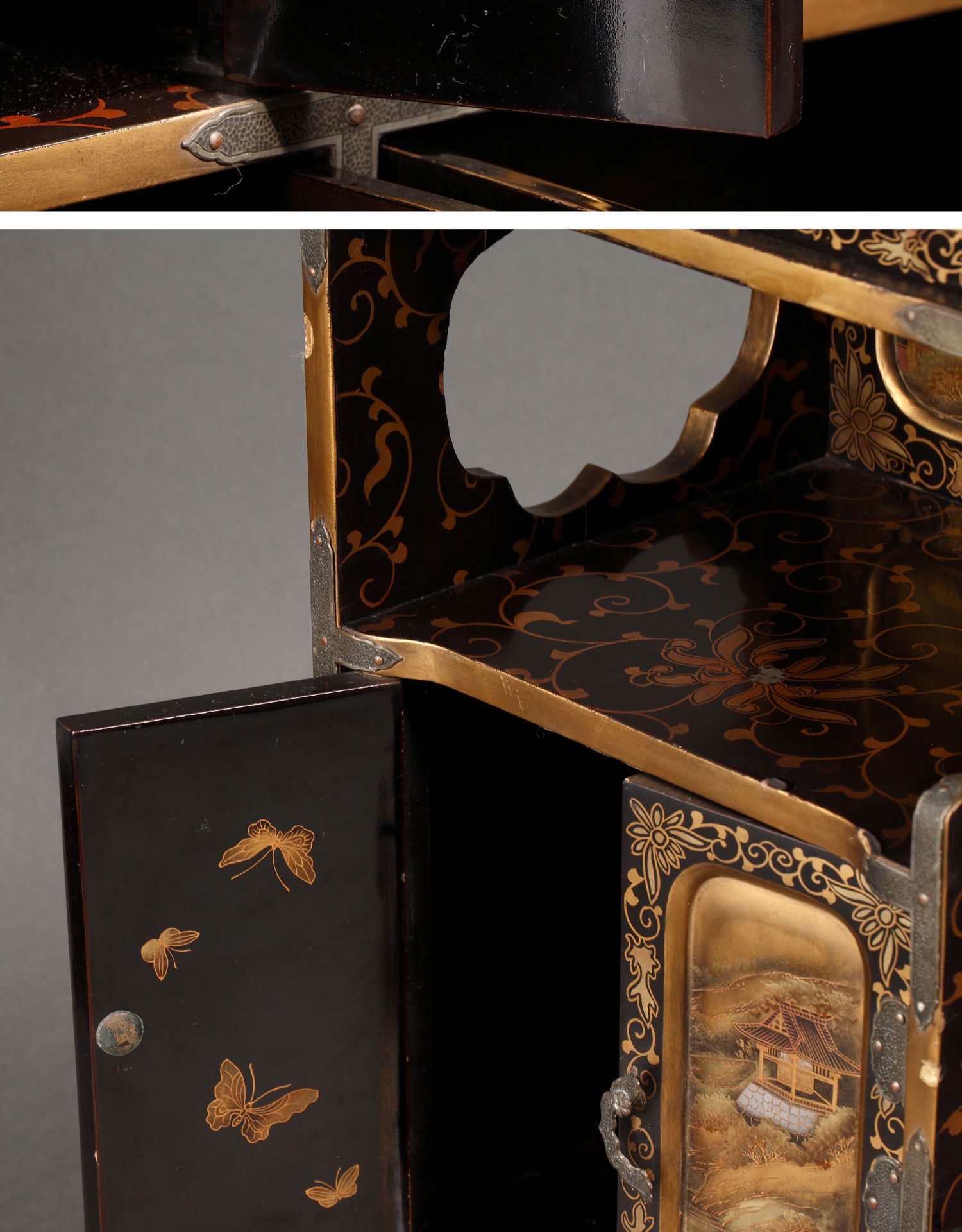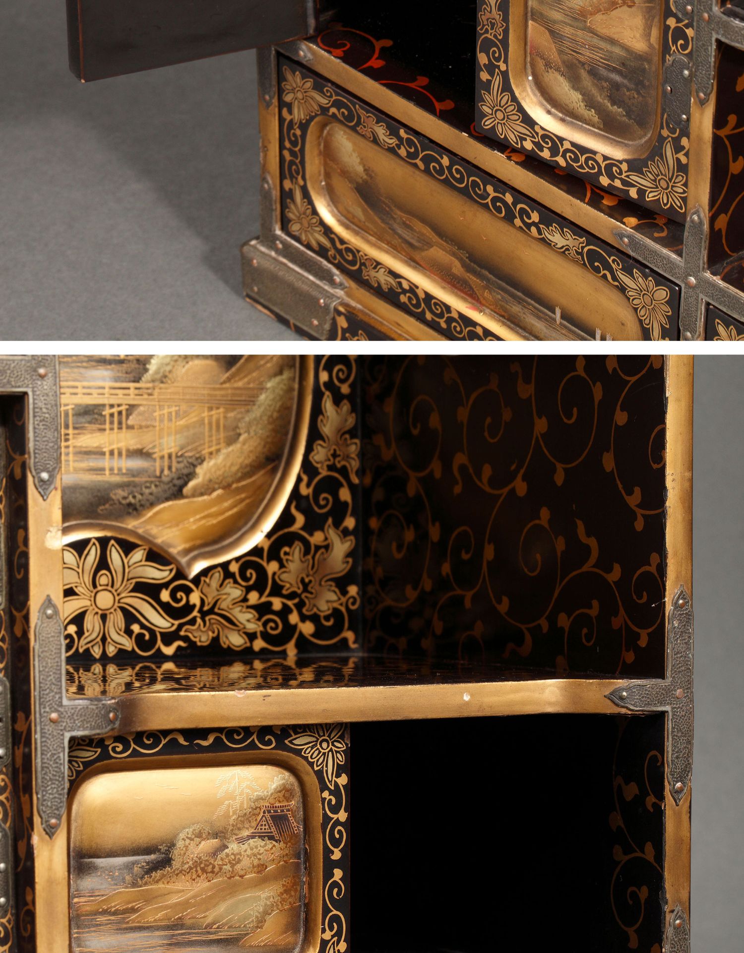 独角鹿西洋古董19世纪日本山水主题黑地金漆莳绘小型珍宝柜置物柜