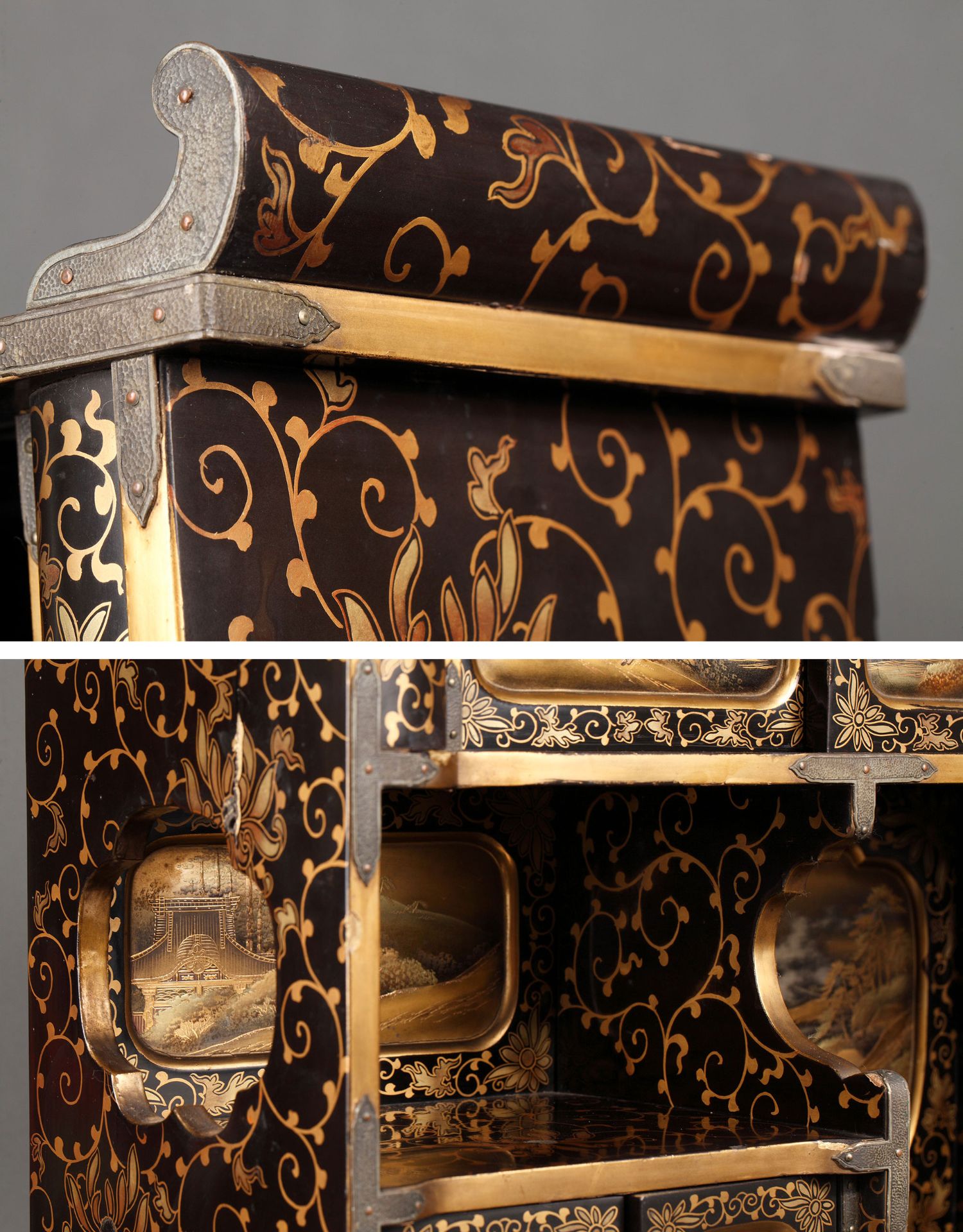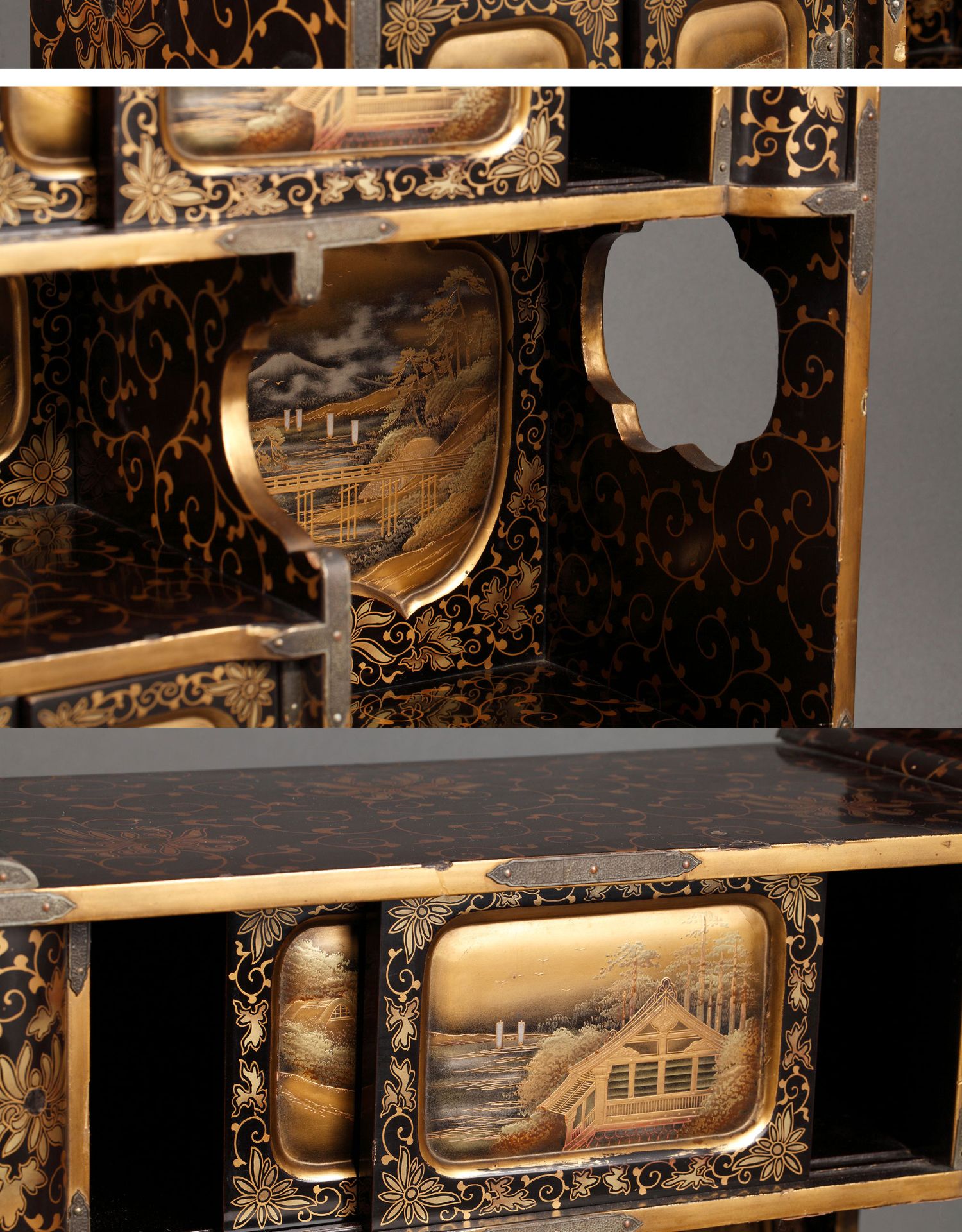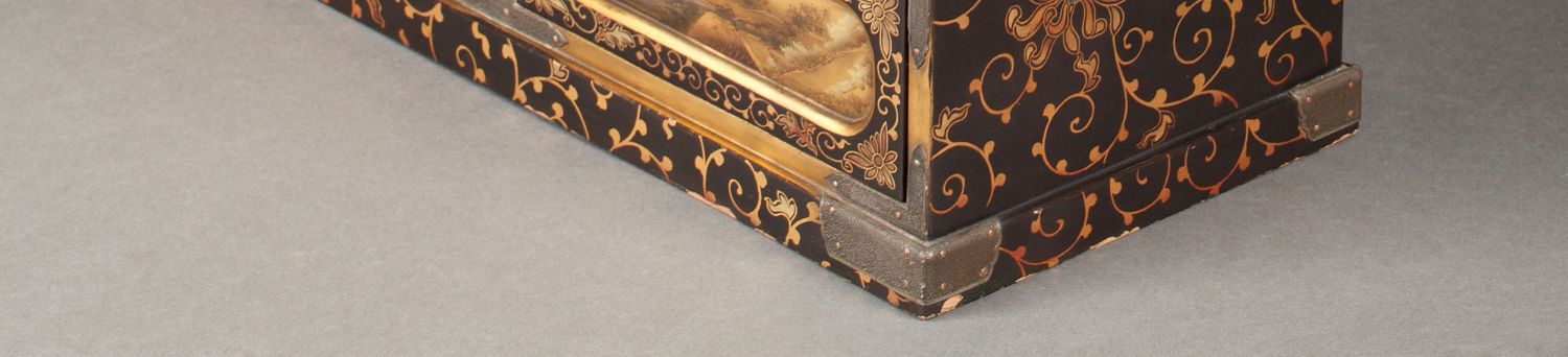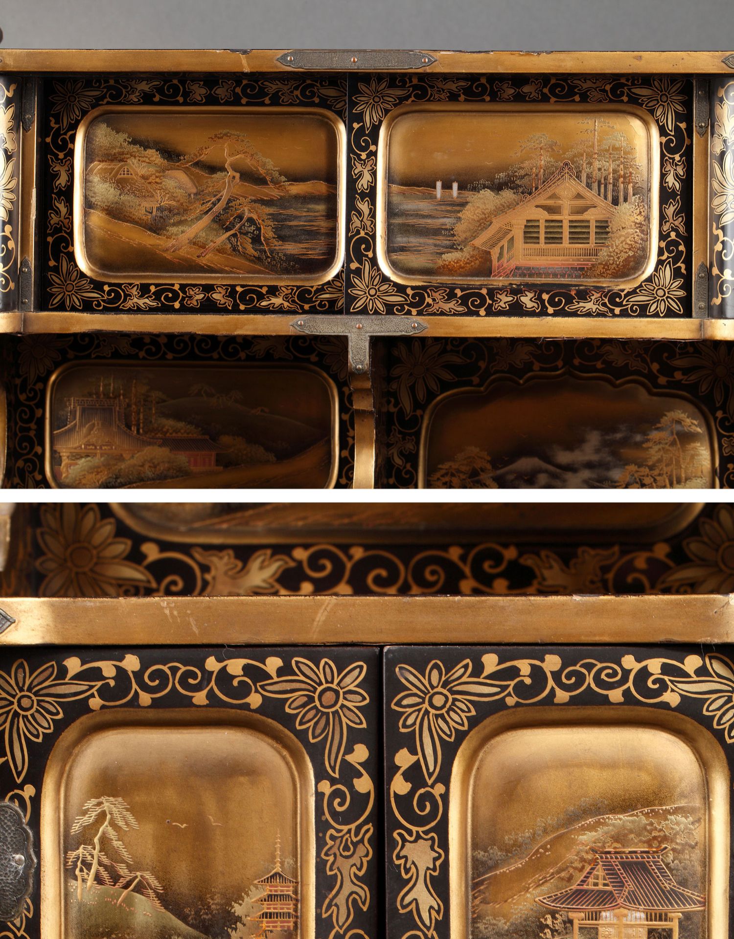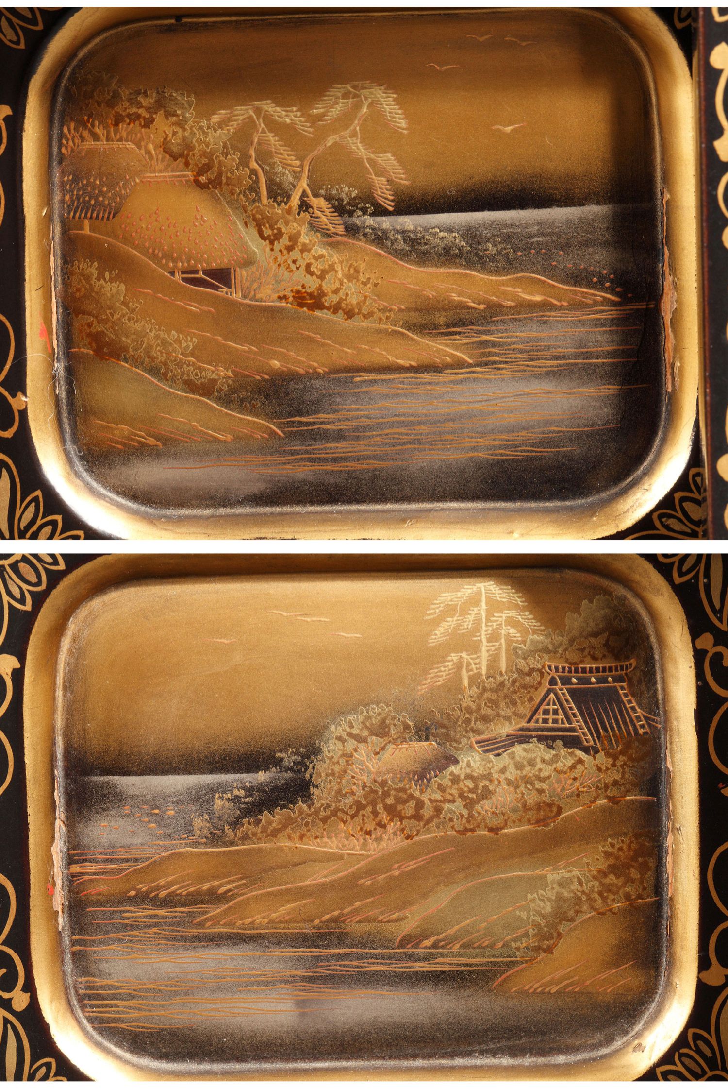 独角鹿西洋古董19世纪日本山水主题黑地金漆莳绘小型珍宝柜置物柜