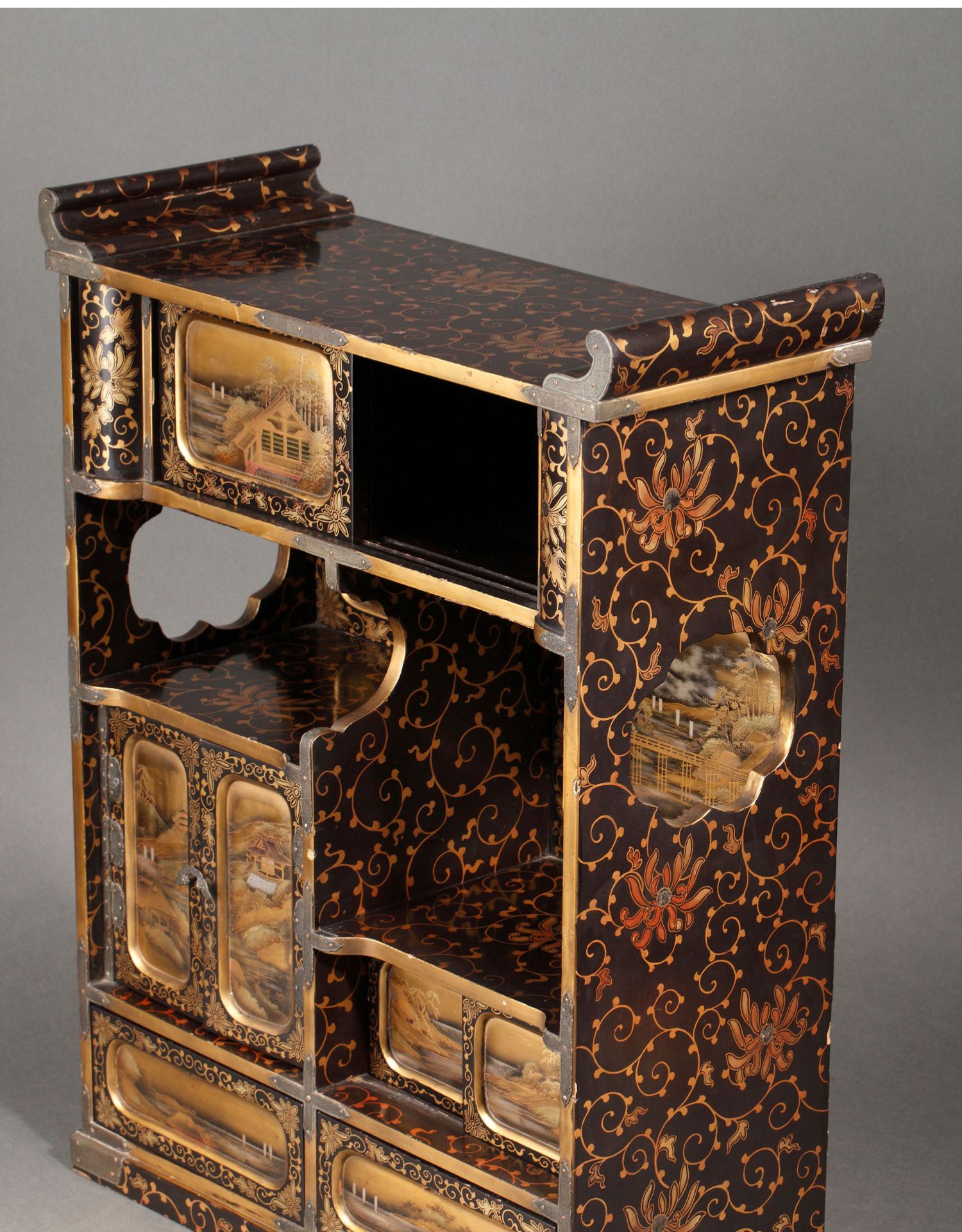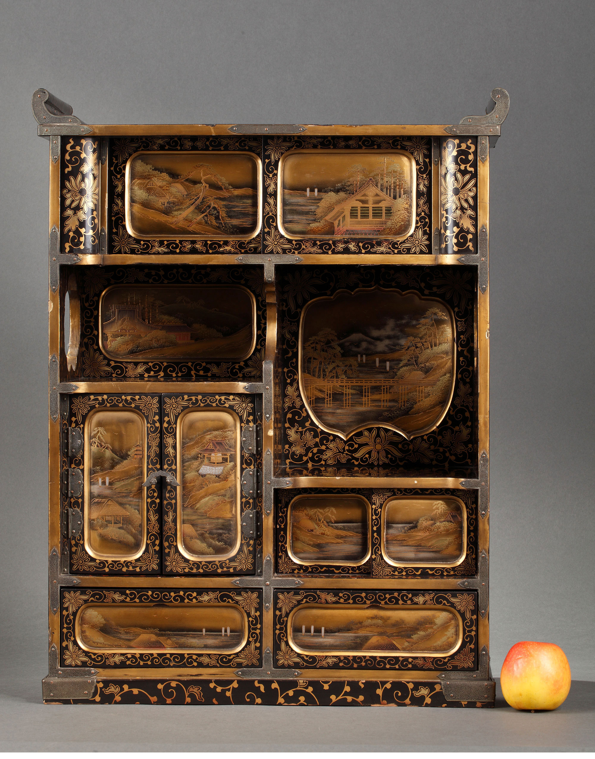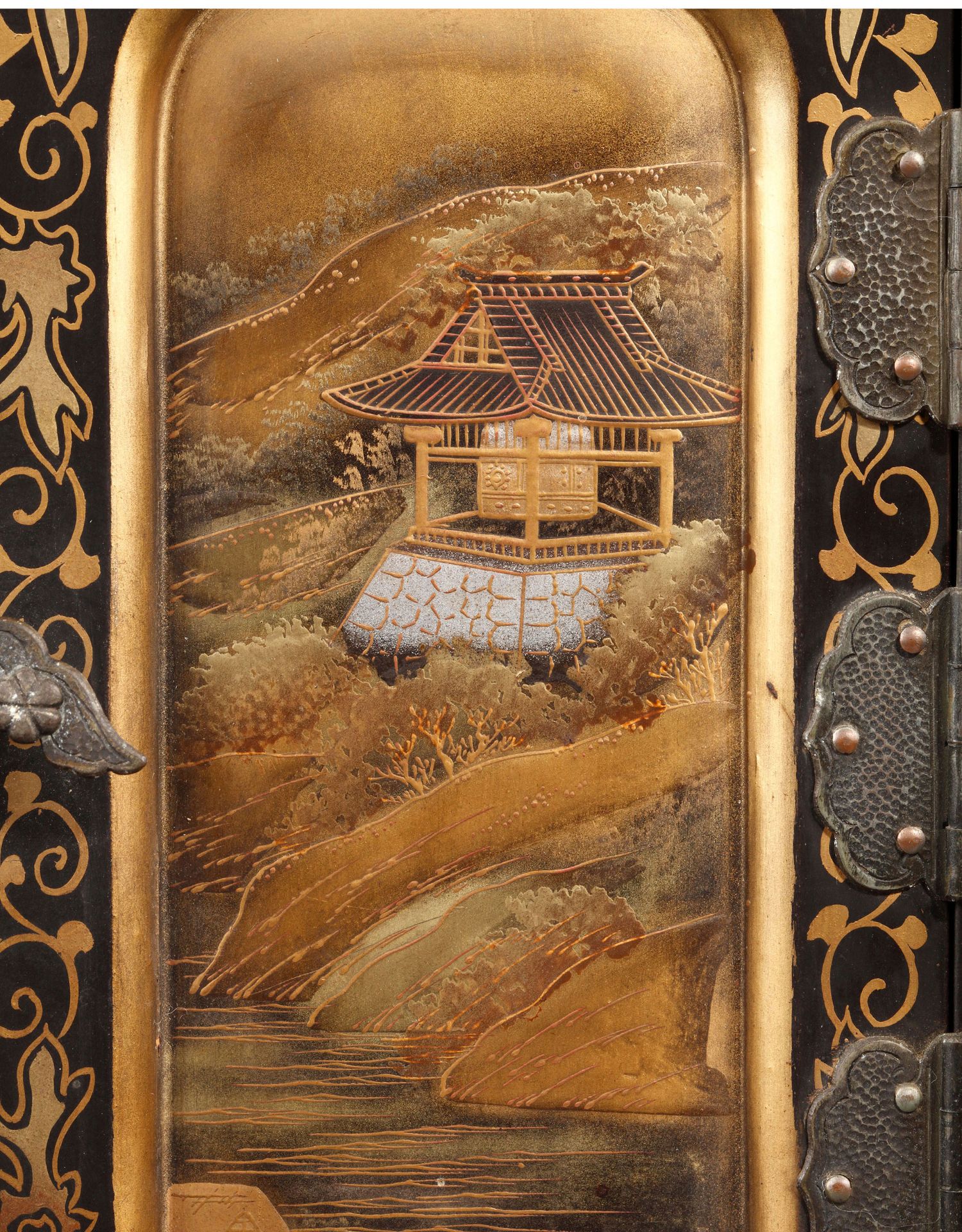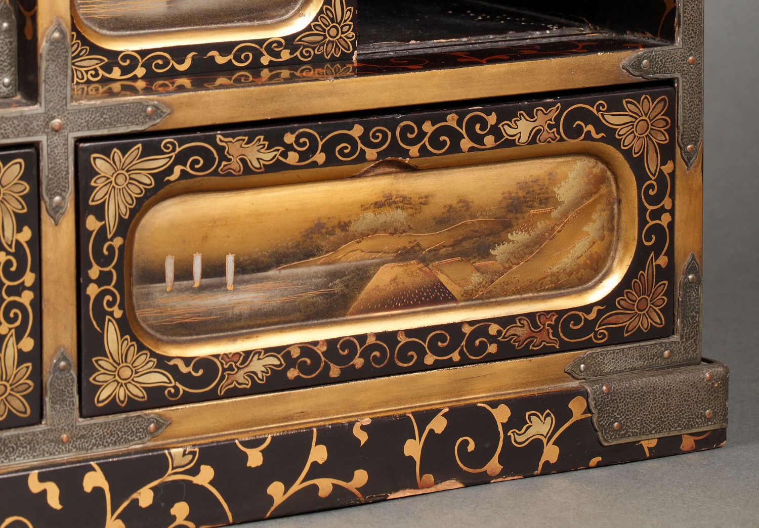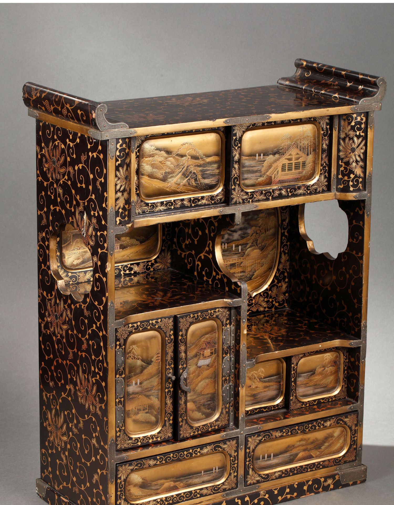 独角鹿西洋古董19世纪日本山水主题黑地金漆莳绘小型珍宝柜置物柜