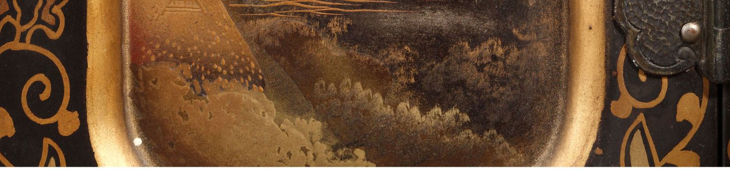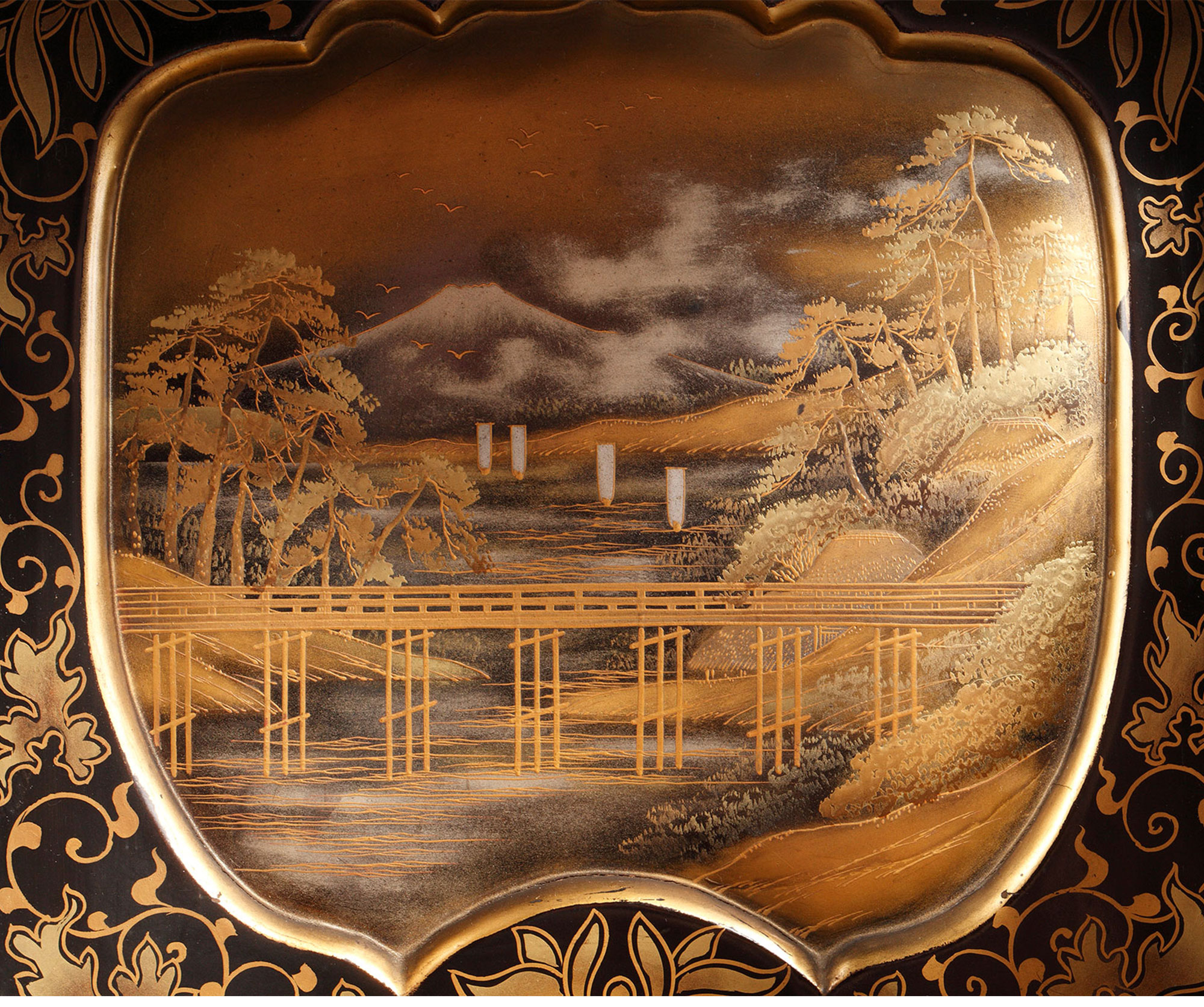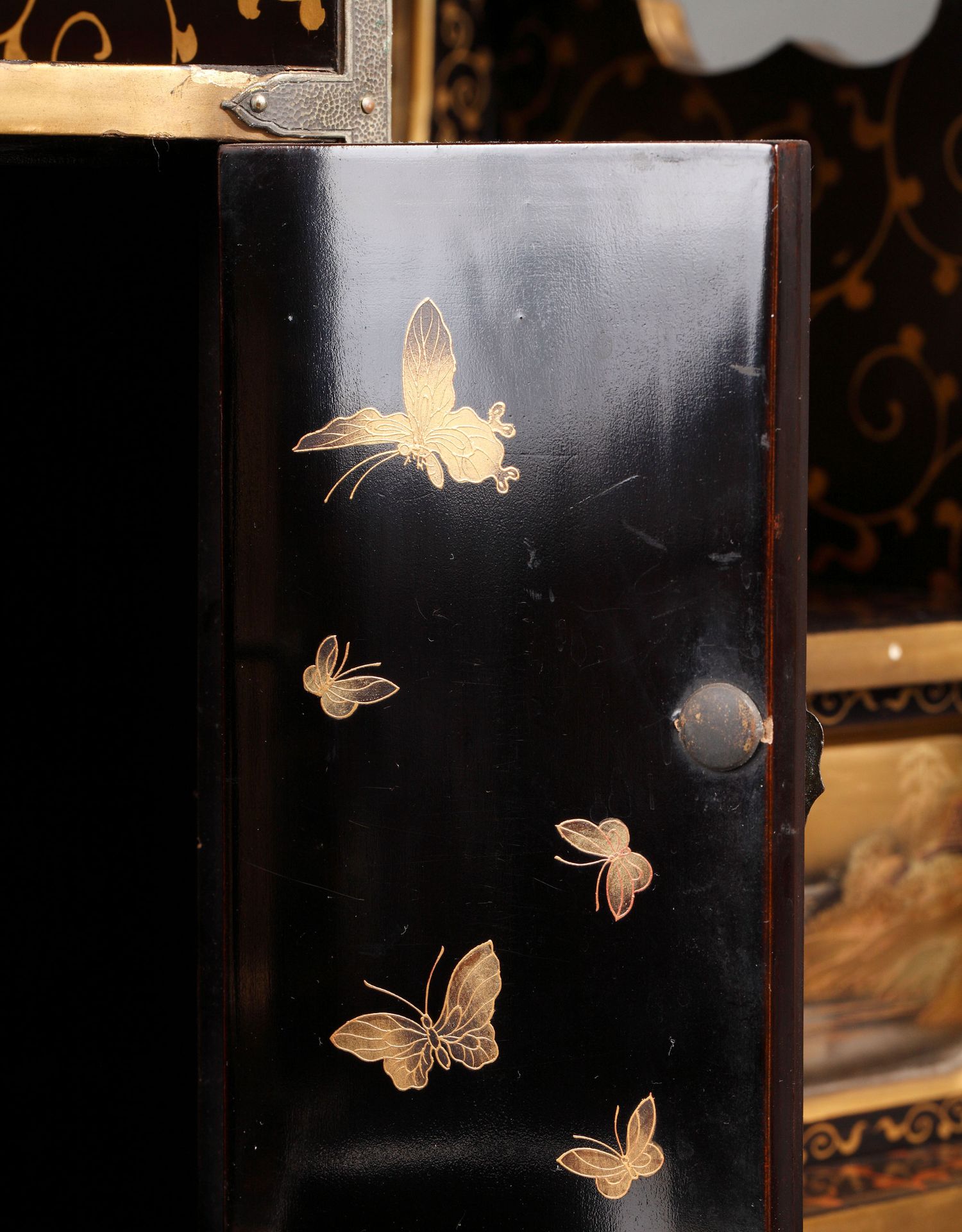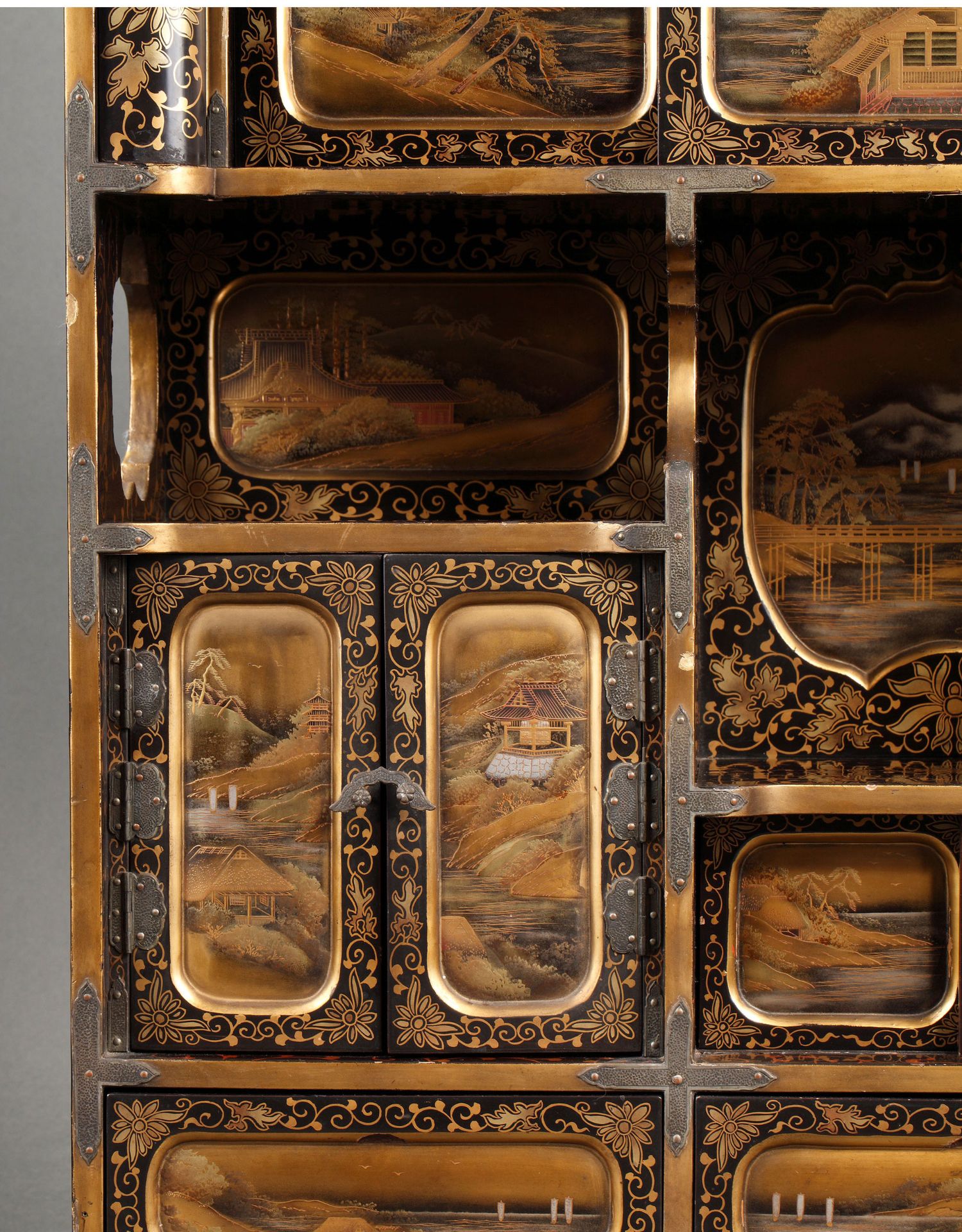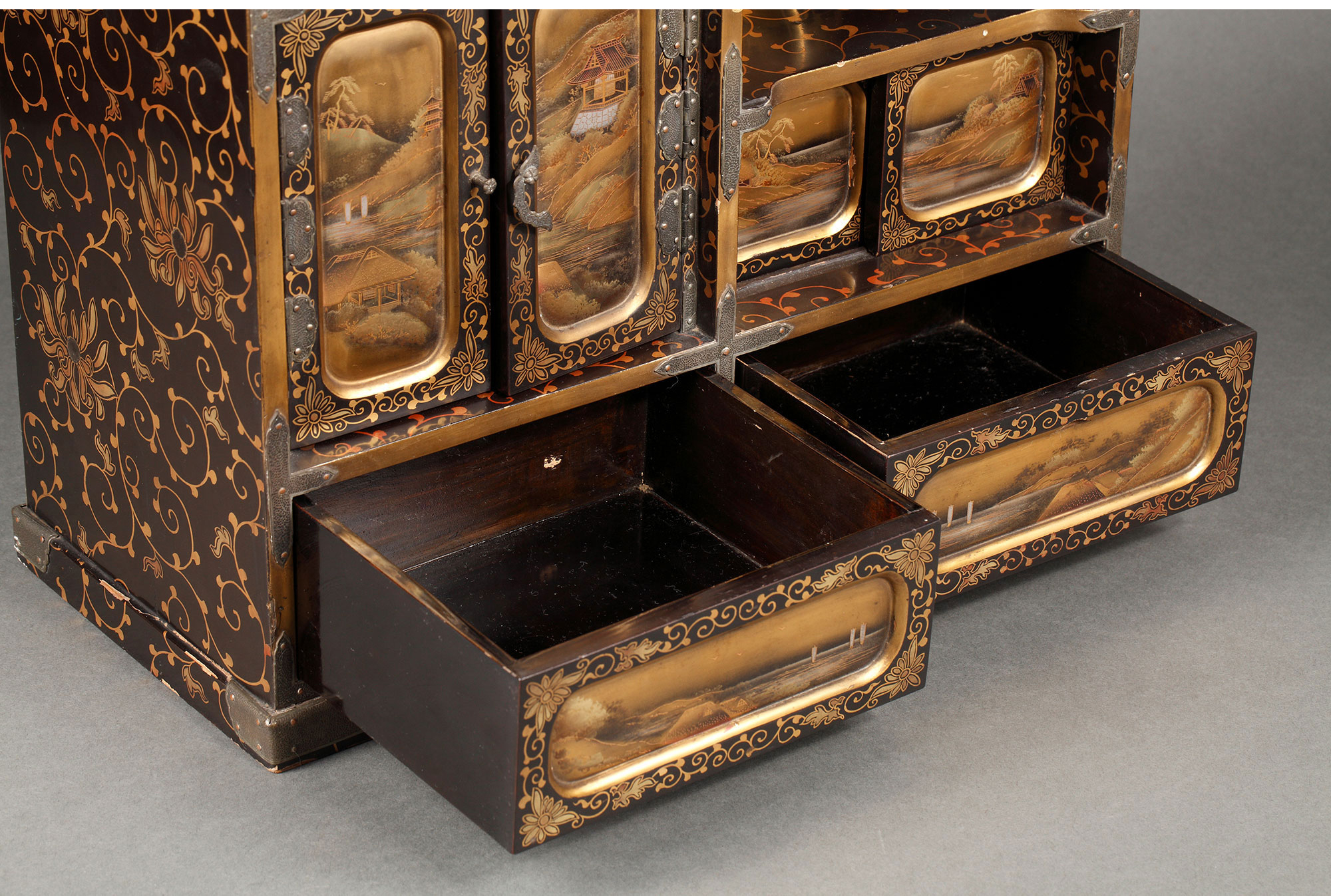 独角鹿西洋古董19世纪日本山水主题黑地金漆莳绘小型珍宝柜置物柜